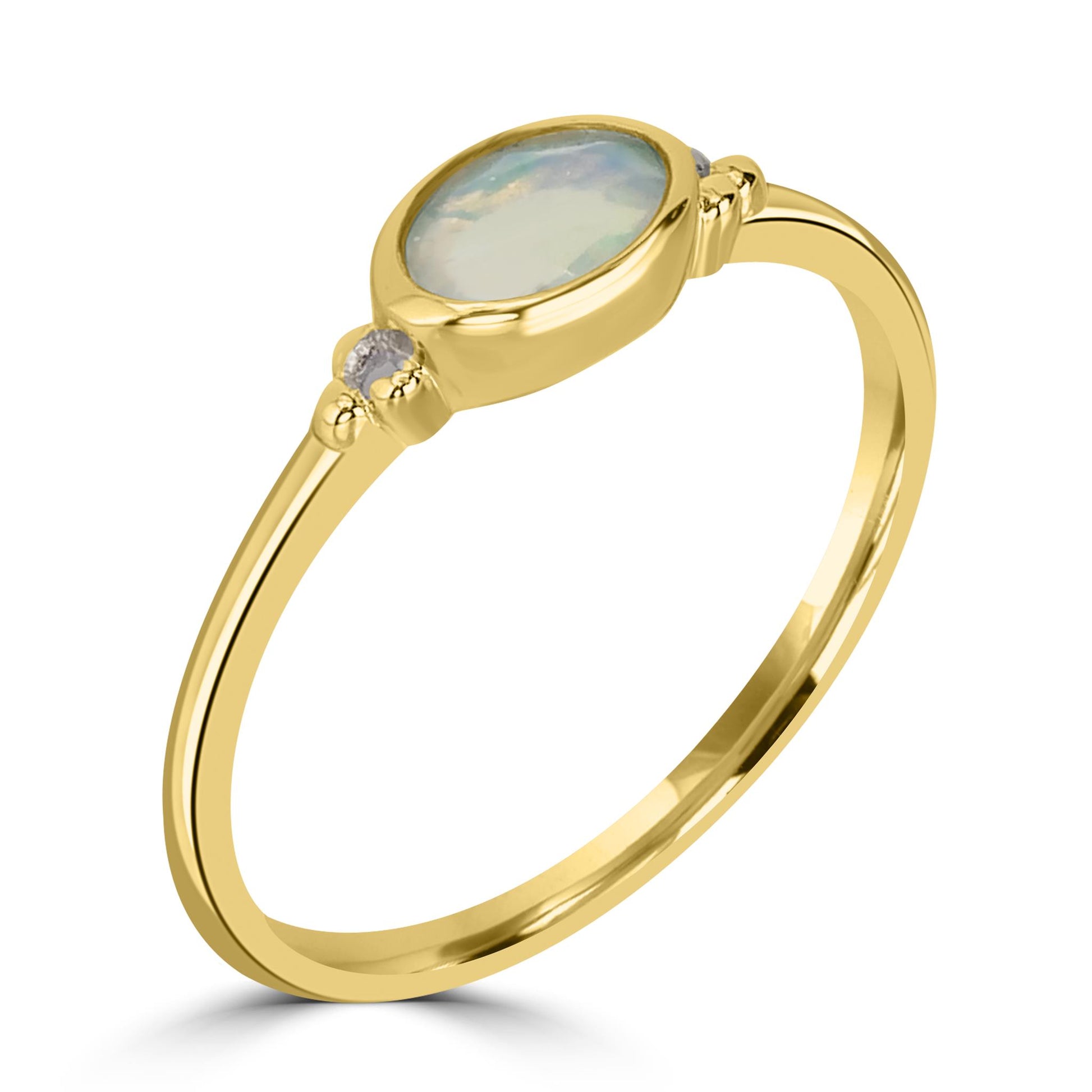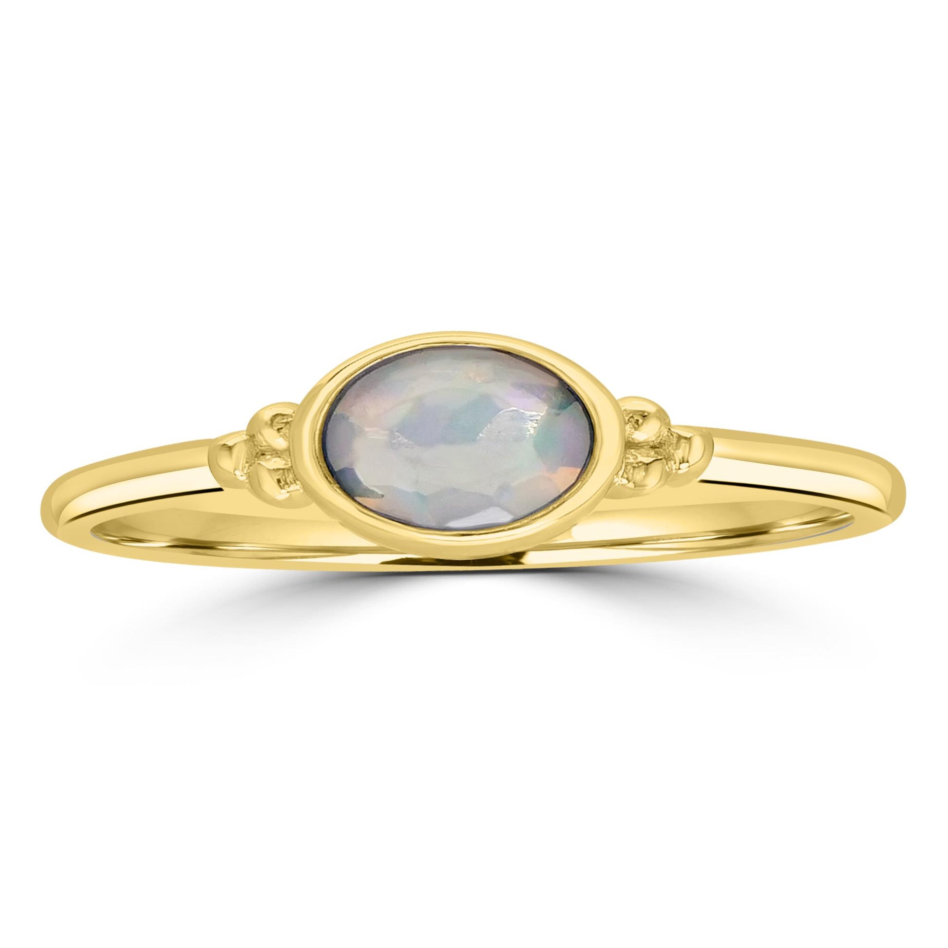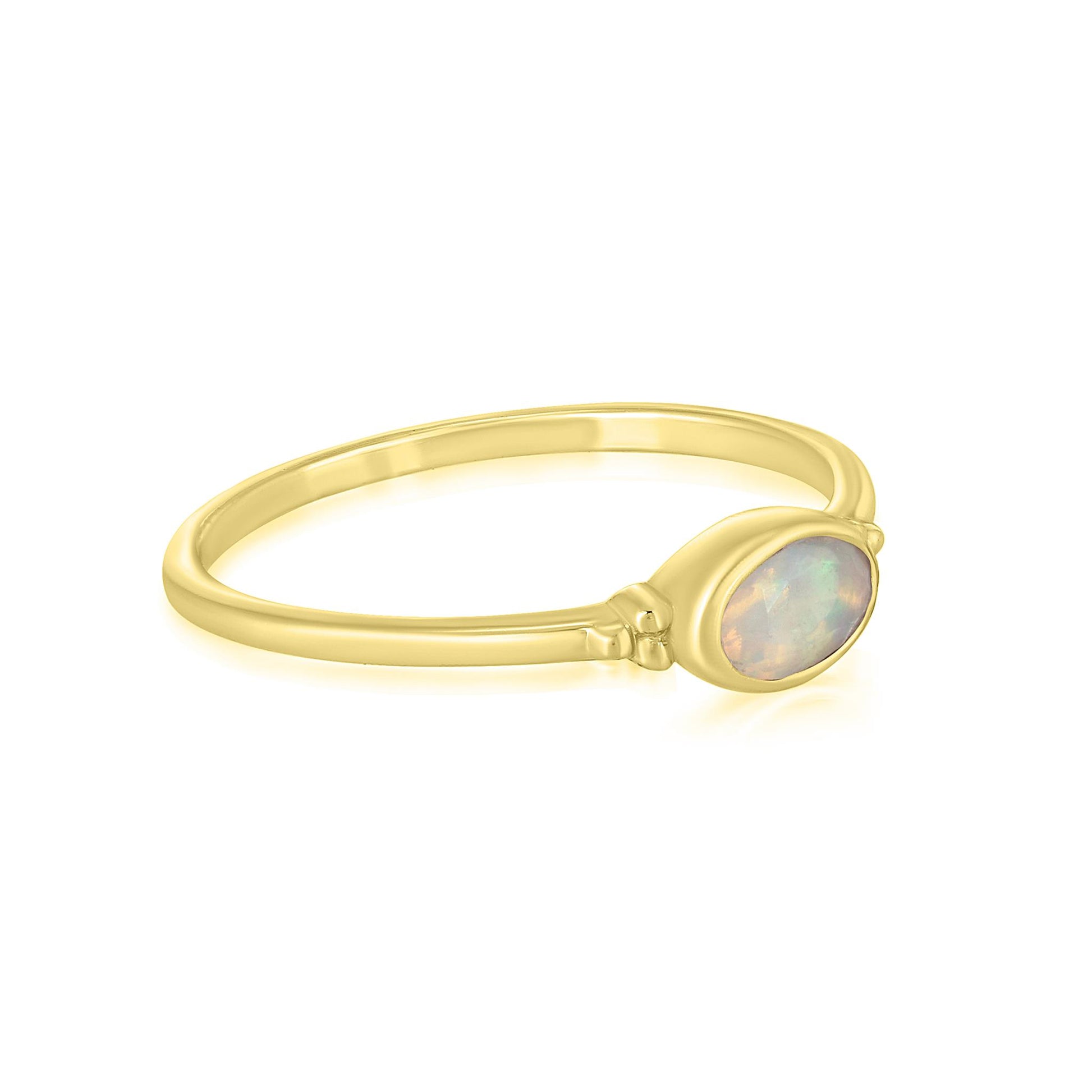 Introducing the Gemistry Stack Ring Collection : a versatile assortment of rings designed for effortless layering. Each piece combines timeless sophistication with modern flair, perfect for adding a touch of chic to any outfit. Mix, match, and stack to create your own unique style statement. The Gemistry East-West 14K Gold Over Sterling Silver Stackable Solitaire Bezel Ring features an oval bezel-set genuine Opal gemstone mounted horizontally, which makes it stunning to wear alone or convenient to stack for a layered look. Opal is the birthstone for the month of October. It symbolizes faithfulness, purity, hope and confidence.