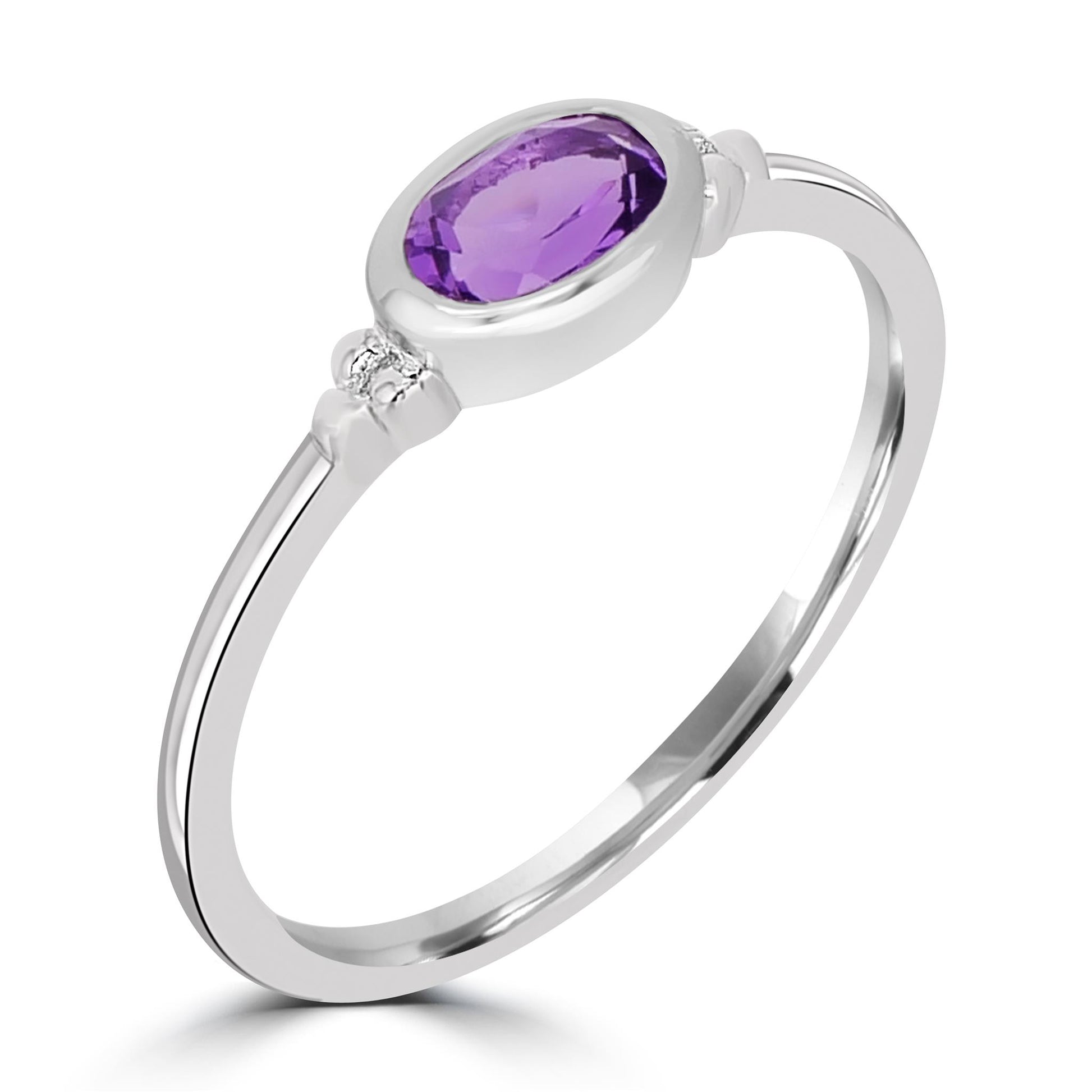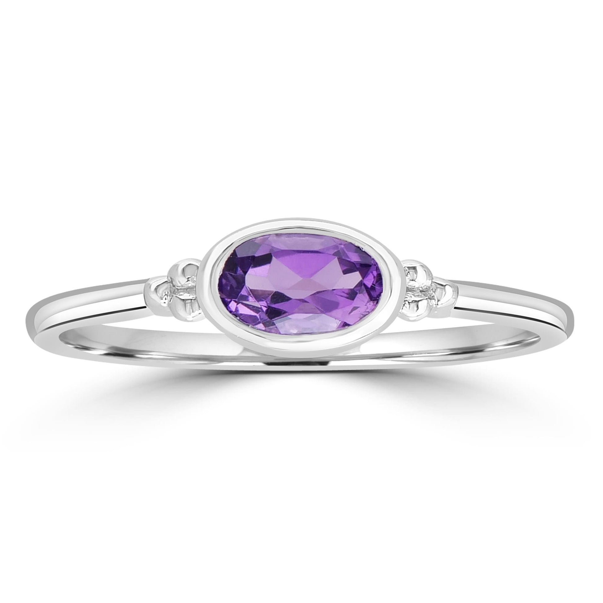 Introducing the Gemistry Stack Ring Collection : a versatile assortment of rings designed for effortless layering. Each piece combines timeless sophistication with modern flair, perfect for adding a touch of chic to any outfit. Mix, match, and stack to create your own unique style statement. The Gemistry East-West Sterling Silver Amethyst Gemstone Stackable Solitaire Bezel Ring features an oval bezel-set genuine Amethyst gemstone mounted horizontally, which makes it stunning to wear alone or convenient to stack for a layered look. Amethyst is the birthstone for the month of February. It symbolizes peace, serenity, and balance.