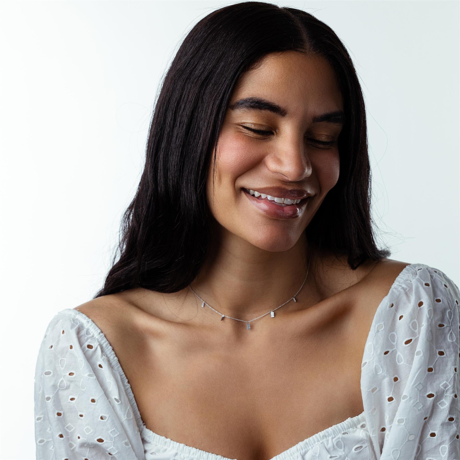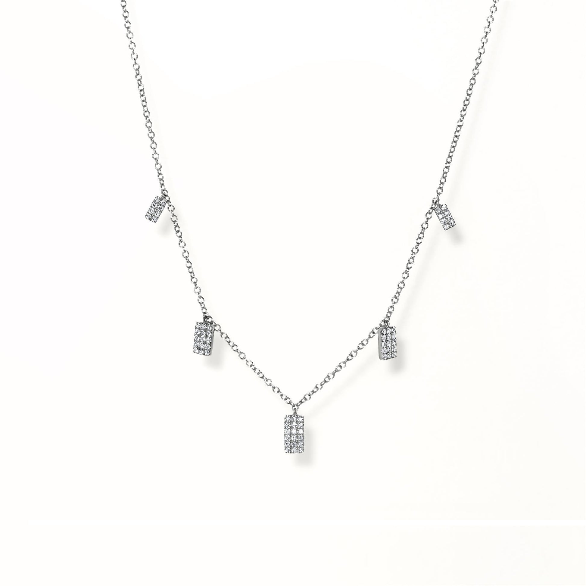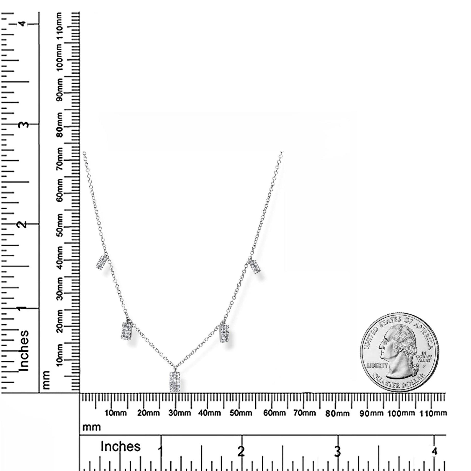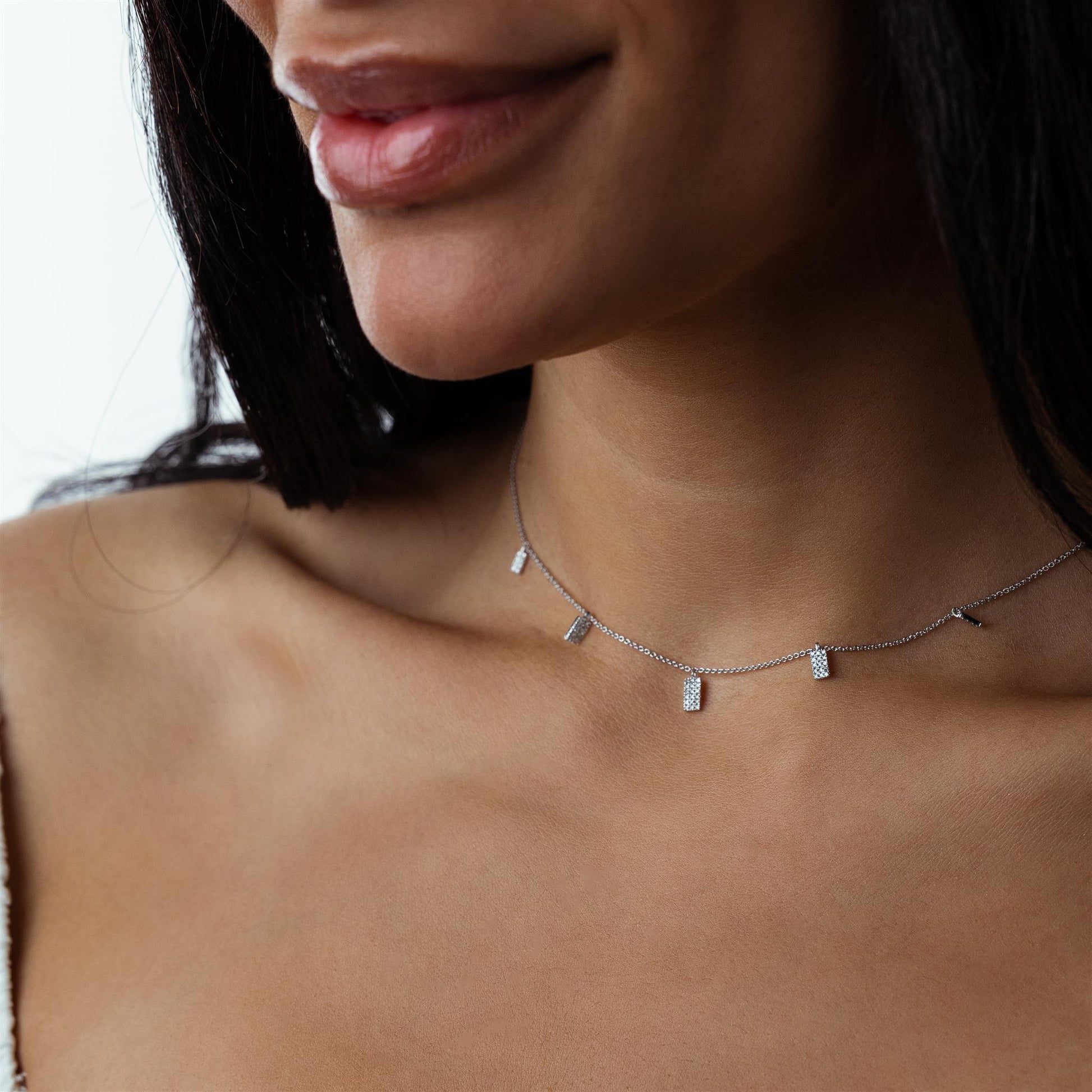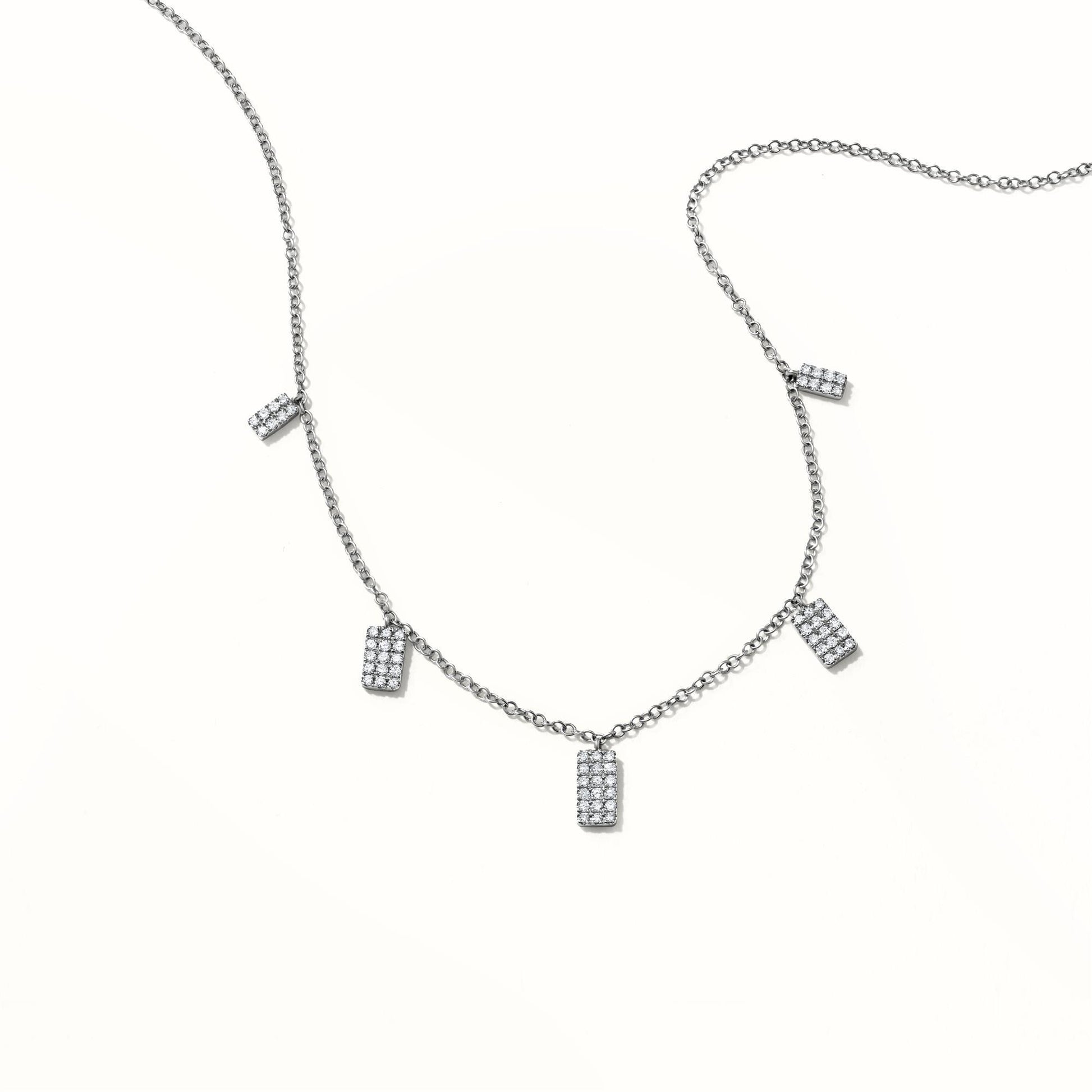 Introducing the Gemistry Rectangular Charm Necklace. This piece is a subtle and stunning way to make a statement! It features 5 rectangular charms in 2 sizes, each studded with dazzling round diamonds of GH Color, SI1 Clarity and a total weight of .17 carats, set in a 14K White Gold base and draped from an elegant 15 inch cable chain. It is secured with a lobster claw clasp.