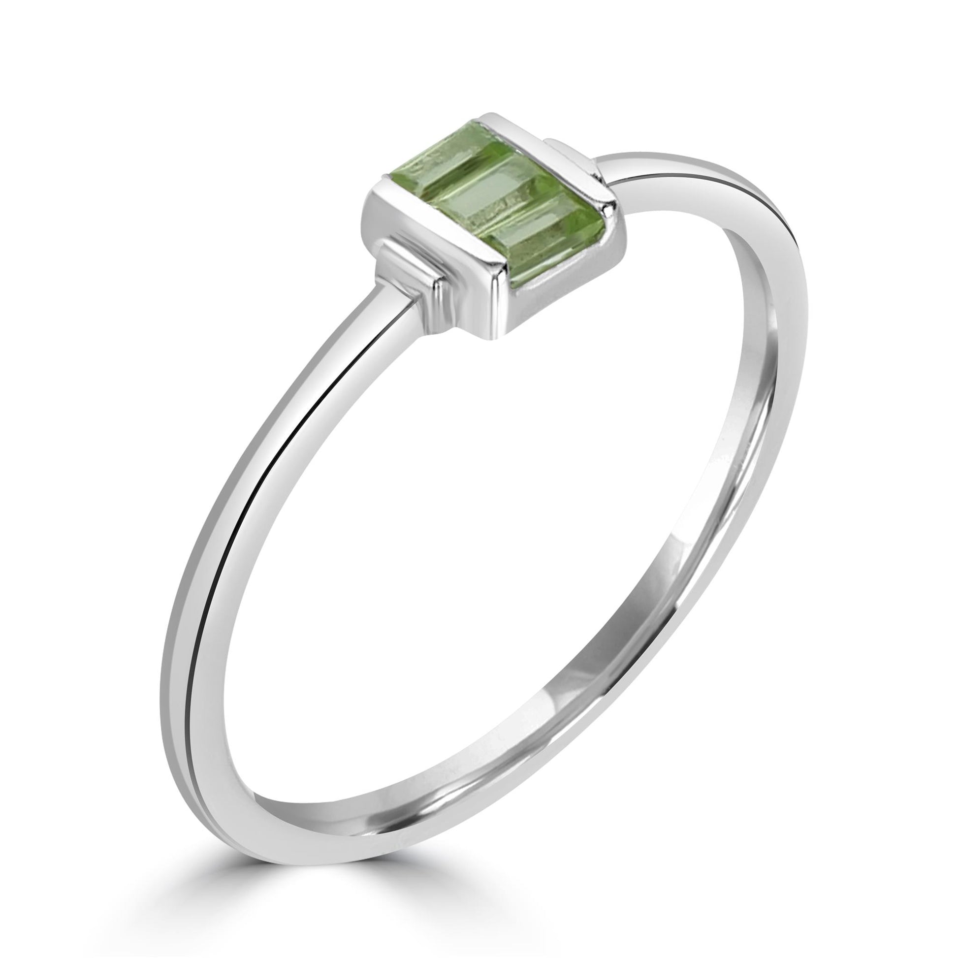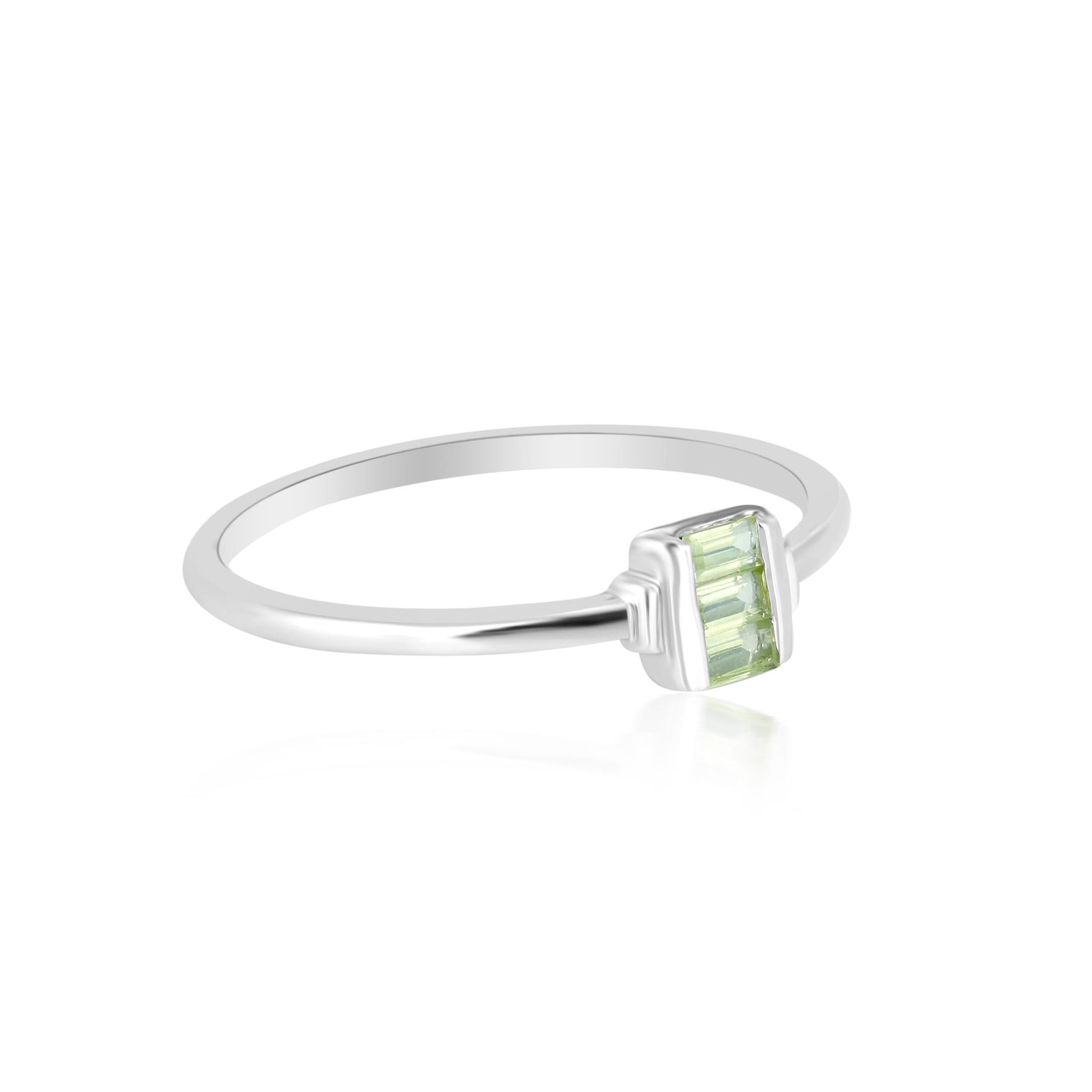 Introducing the Gemistry Stack Ring Collection: a versatile assortment of rings designed for effortless layering. Each piece combines timeless sophistication with modern flair, perfect for adding a touch of chic to any outfit. Mix, match, and stack to create your own unique style statement. The Ava 3-Stone Horizontal Stacked Baguette Gemstone Ring is handcrafted from .925 Sterling Silver. This bezel-set ring features three genuine Peridot gemstones. Peridot is August's birthstone. It symbolizes prosperity and good fortune. Each gemstone is meticulously selected for its clarity, hue, and saturation, ensuring your ring is truly one-of-a-kind.