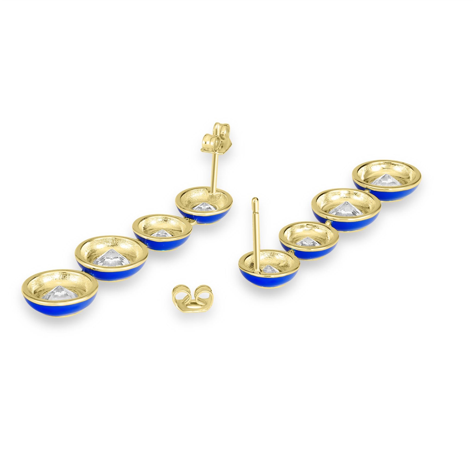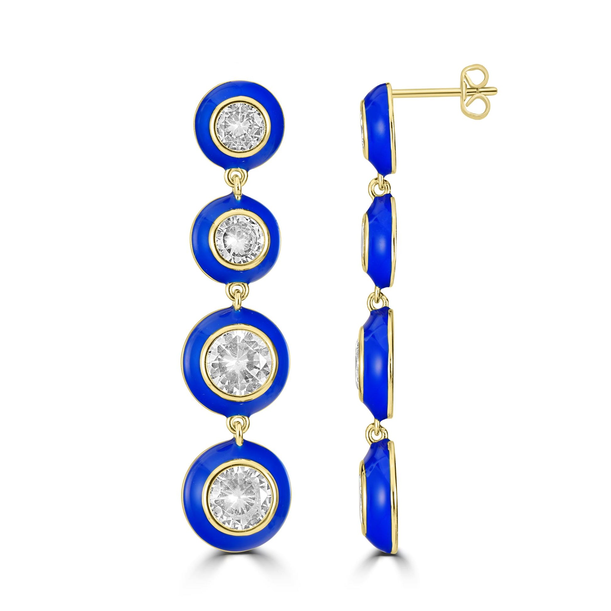 Bob Mackie is an internationally renowned costume and fashion designer who has dressed some of the most glamorous entertainment icons in the world. Gemistry has partnered with Bob Mackie in a brand new collaboration that marries the designer's exquisite sense of glamour and vibrant color with Gemistry's expertise in quality and craftmanship. The Gemistry Bob Mackie Dangle Earrings are true show-stoppers! Each earring features a Gold over Brass backing with a polished navy blue enamel surrounding a series of 4 round cut sparkling Cubic Zirconia stones which graduate up in size from 4 to 6 to 7 and finally 8mm at the bottom of the dangle. The earrings are for pieced ears only and are secured with a post and nut backing. Whether you want to elevate your look, surprise someone with a thoughtful present, or Bob Mackie is an internationally renowned costume and fashion designer who has dressed some of the most glamorous entertainment icons in the world. Gemistry has partnered with Bob Mackie in a brand new collaboration that marries the designer's exquisite sense of glamour and vibrant color with Gemistry's expertise in quality and craftmanship. The Gemistry Bob Mackie Dangle Earrings are true show-stoppers! Each earring features a 14K Gold-Plated Brass backing with a polished navy blue enamel surrounding a series of 4 round cut sparkling Cubic Zirconia stones which graduate up in size from 4 to 6 to 7 and finally 8mm at the bottom of the dangle. The earrings are for pieced ears only and are secured with a post and nut backing. Whether you want to elevate your look, surprise someone with a thoughtful present, or celebrate a milestone, this exclusive collection helps you do just that! We are a modern brand that redefines luxury. With a focus on craftsmanship, sustainability, and transparency, Gemistry is committed to creating timeless pieces that will be treasured for generations.