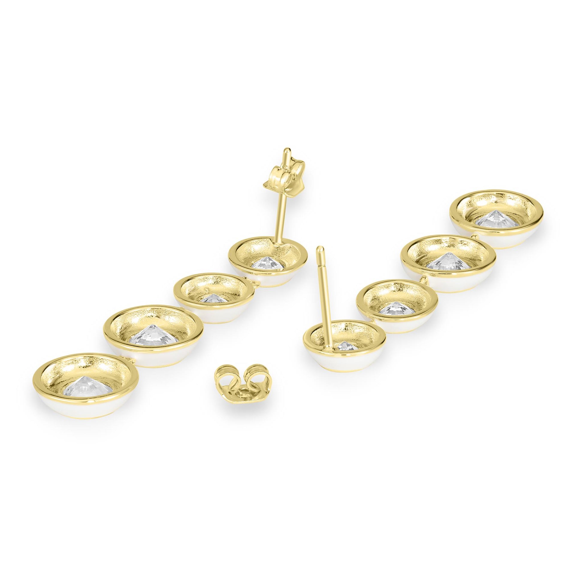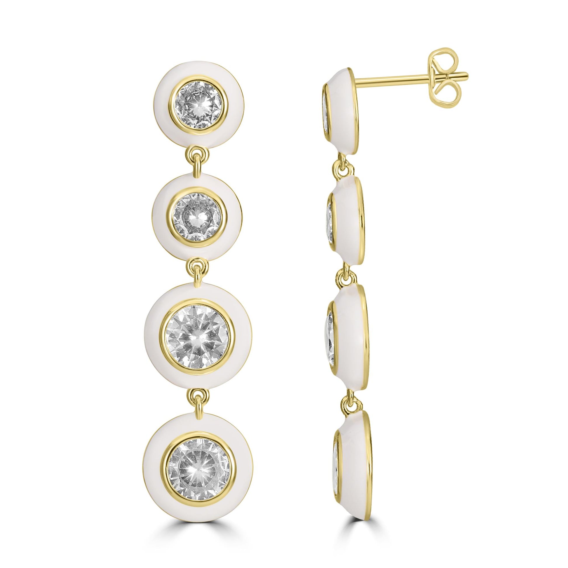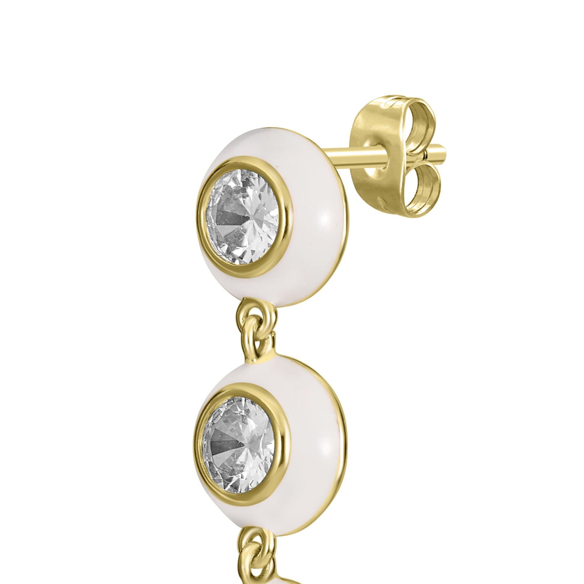 Bob Mackie is an internationally renowned costume and fashion designer who has dressed some of the most glamorous entertainment icons in the world. Gemistry has partnered with Bob Mackie in a brand new collaboration that marries the designer's exquisite sense of glamour and vibrant color with Gemistry's expertise in quality and craftmanship. The Gemistry Bob Mackie Dangle Earrings are true show-stoppers! Each earring features a Gold over Brass backing with a polished white enamel surrounding a series of 4 round cut sparkling Cubic Zirconia stones which graduate up in size from 4 to 6 to 7 and finally 8mm at the bottom of the dangle. The earrings are for pieced ears only and are secured with a post and nut backing. Whether you want to elevate your look, surprise someone with a thoughtful present, or Bob Mackie is an internationally renowned costume and fashion designer who has dressed some of the most glamorous entertainment icons in the world. Gemistry has partnered with Bob Mackie in a brand new collaboration that marries the designer's exquisite sense of glamour and vibrant color with Gemistry's expertise in quality and craftmanship. The Gemistry Bob Mackie Dangle Earrings are true show-stoppers! Each earring features a 14K Gold-Plated Brass backing with a polished navy blue enamel surrounding a series of 4 round cut sparkling Cubic Zirconia stones which graduate up in size from 4 to 6 to 7 and finally 8mm at the bottom of the dangle. The earrings are for pieced ears only and are secured with a post and nut backing. Whether you want to elevate your look, surprise someone with a thoughtful present, or celebrate a milestone, this exclusive collection helps you do just that! We are a modern brand that redefines luxury. With a focus on craftsmanship, sustainability, and transparency, Gemistry is committed to creating timeless pieces that will be treasured for generations.