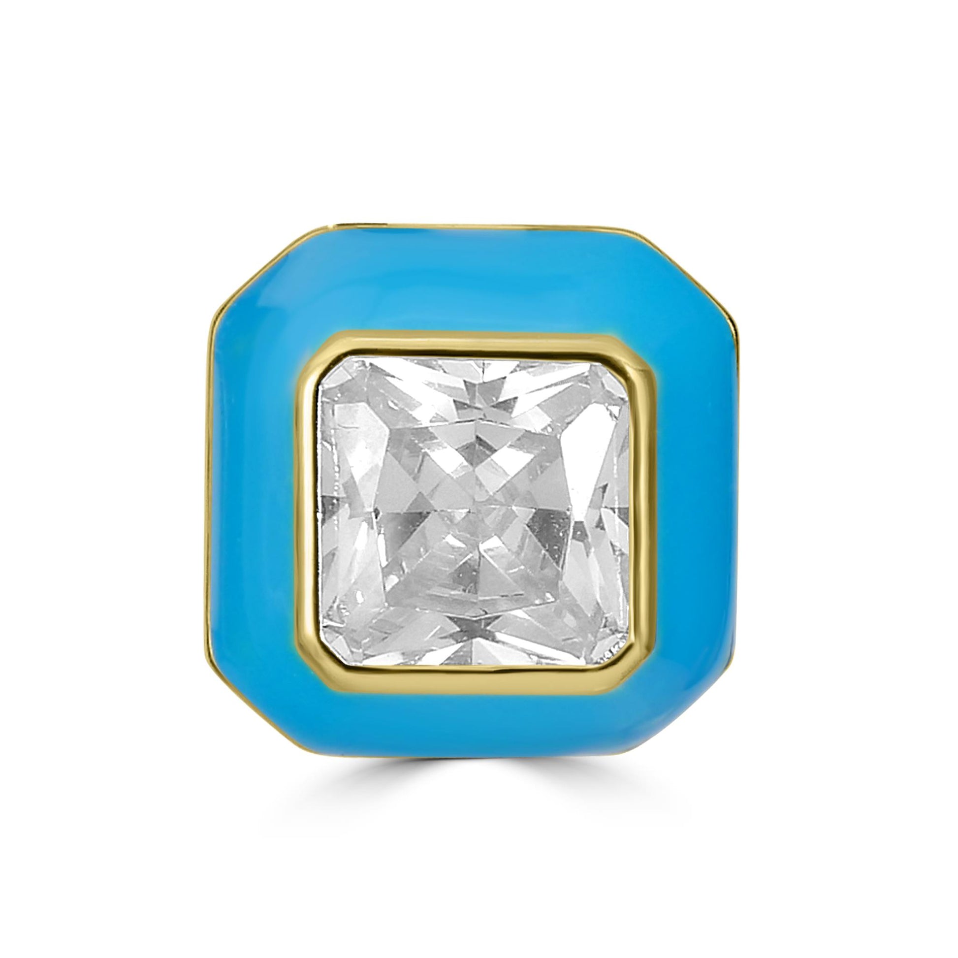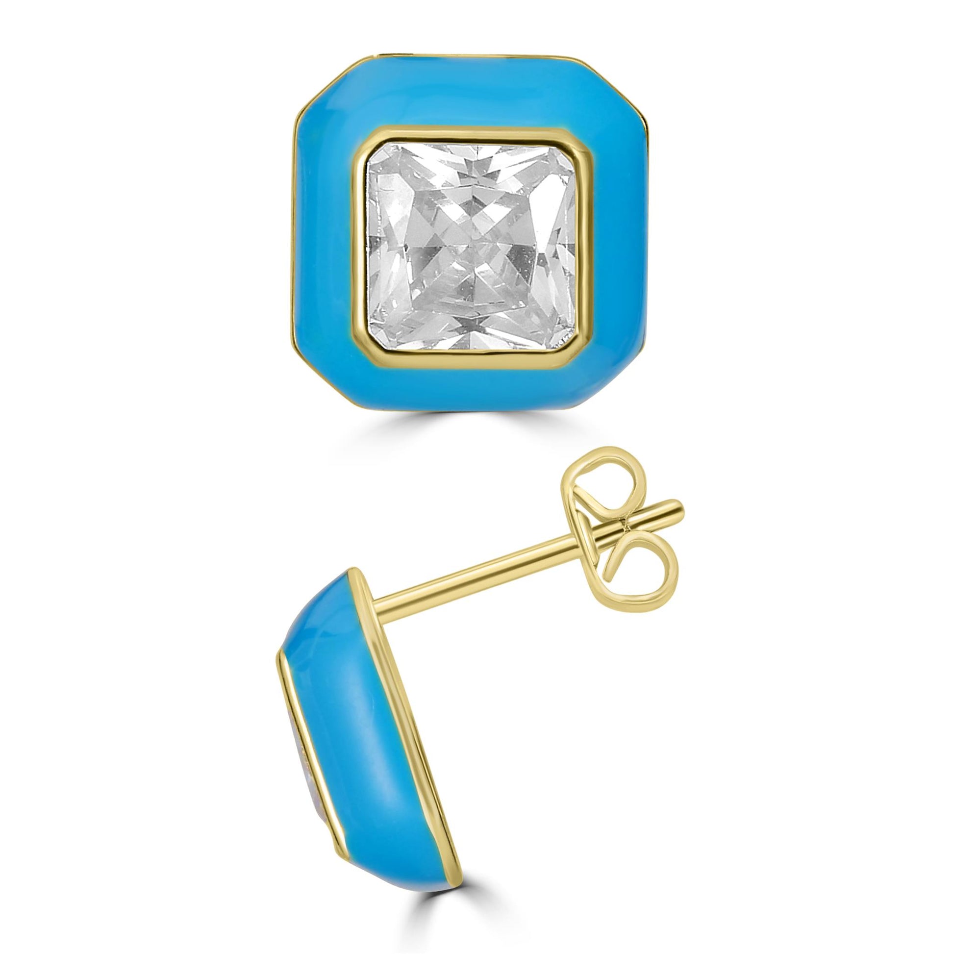 Bob Mackie is an internationally renowned costume and fashion designer who has dressed some of the most glamorous entertainment icons in the world. Gemistry has partnered with Bob Mackie in a brand new collaboration that marries the designer's exquisite sense of glamour and vibrant color with Gemistry's expertise in quality and craftmanship. The Gemistry Bob Mackie Stud Earrings are true show-stoppers! Each earring features Gold Over Brass with a rectangular cut sparkling Cubic Zirconia adorning a polished, turquoise enamel base. The earrings are for pieced ears only and are secured with a post and nut backing. Whether you want to elevate your look, surprise someone with a thoughtful present, or celebrate a milestone, this exclusive collection helps you do just that!