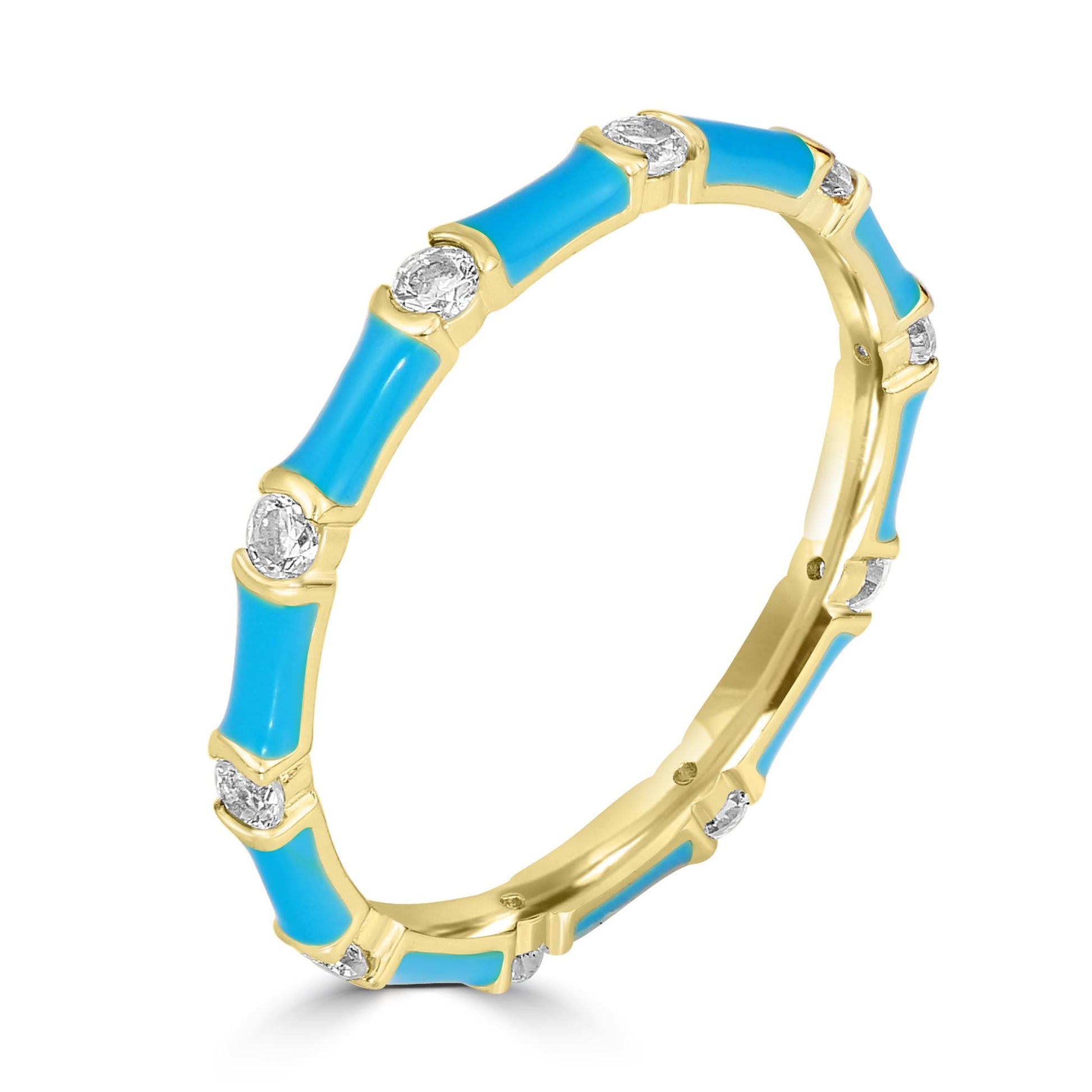 Bob Mackie is an internationally renowned costume and fashion designer who has dressed some of the most glamorous entertainment icons in the world. Gemistry has partnered with Bob Mackie in a brand new collaboration that marries the designer's exquisite sense of glamour and vibrant color with Gemistry's expertise in quality and craftmanship. The Gemistry Bob Mackie Band Ring features a Gold over Brass band with a high-polish finish. The center of the ring showcases 10 round Cubic Zirconia stones set in a prong setting. The stones are arranged in a symmetrical pattern, creating a balanced and visually appealing design. The turquoise enamel accent adds a modern and stylish touch to the overall design, providing a striking contrast against the Gold finish and the sparkling Cubic Zirconias. Wear it alone or in a stack.