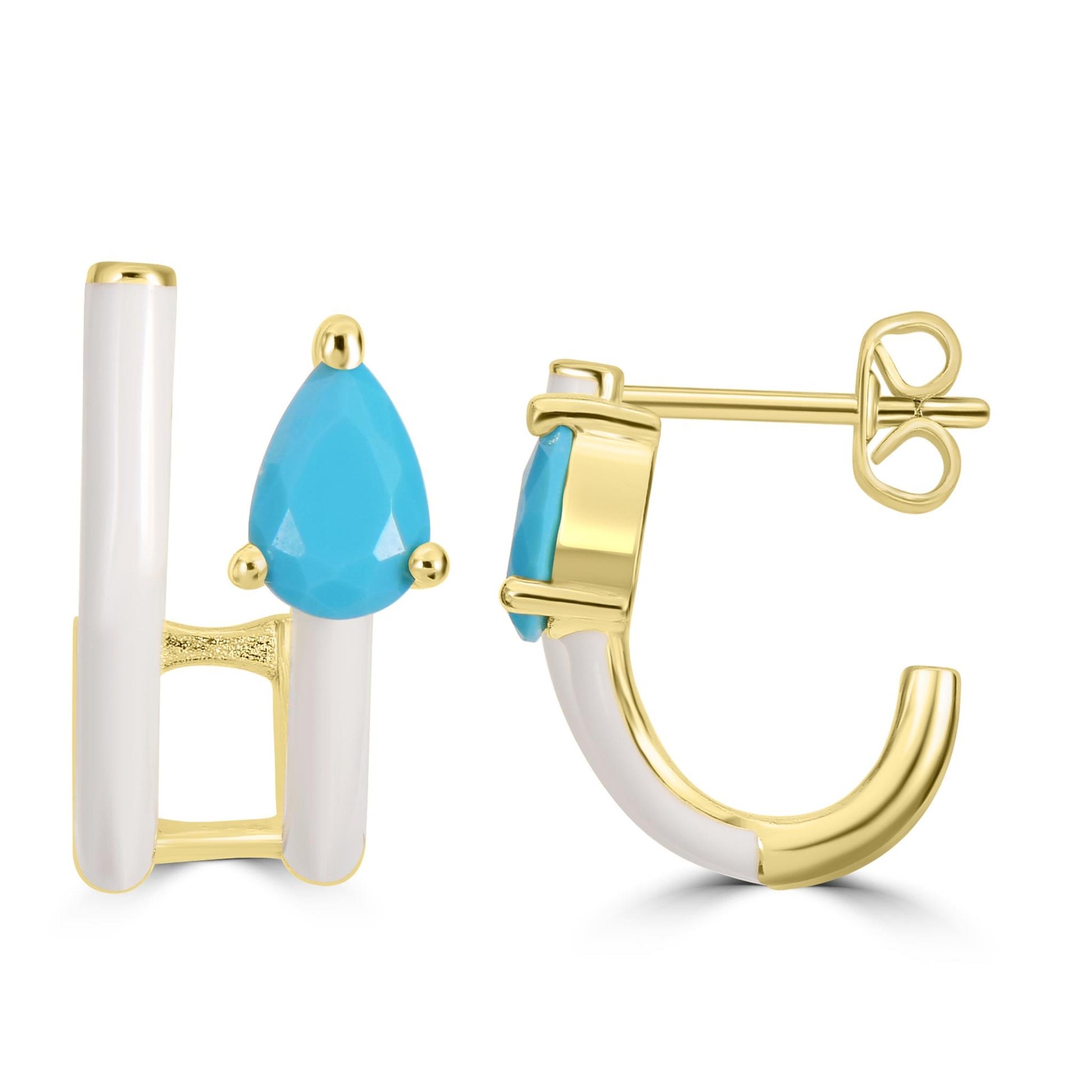 Bob Mackie is an internationally renowned costume and fashion designer who has dressed some of the most glamorous entertainment icons in the world. Gemistry has partnered with Bob Mackie in a brand new collaboration that marries the designer's exquisite sense of glamour and vibrant color with Gemistry's expertise in quality and craftmanship. The Gemistry Bob Mackie Hoop Earrings feature a 14K Gold Over Brass backing with a double row of white enamel. A gorgeous contrasting pear cut Turquoise Cubic Zirconia stone in a prong setting rests at the top of the innermost row. The earrings are for pieced ears only and are secured with a post and nut backing. Whether you want to elevate your look, surprise someone with a thoughtful present, or celebrate a milestone, this exclusive collection helps you do just that! We are a modern brand that redefines luxury. With a focus on craftsmanship, sustainability, and transparency, Gemistry is committed to creating timeless pieces that will be treasured for generations.