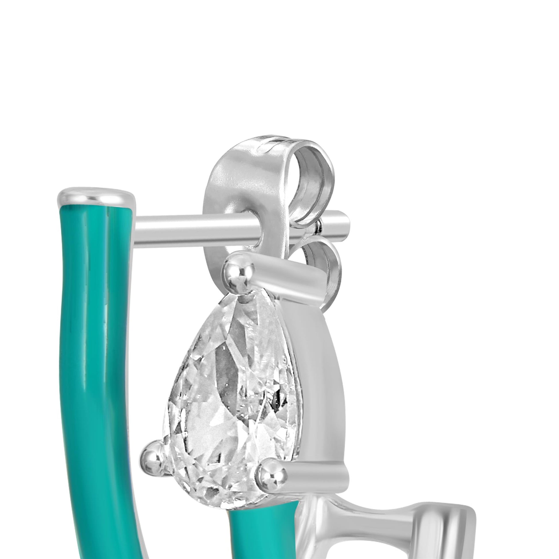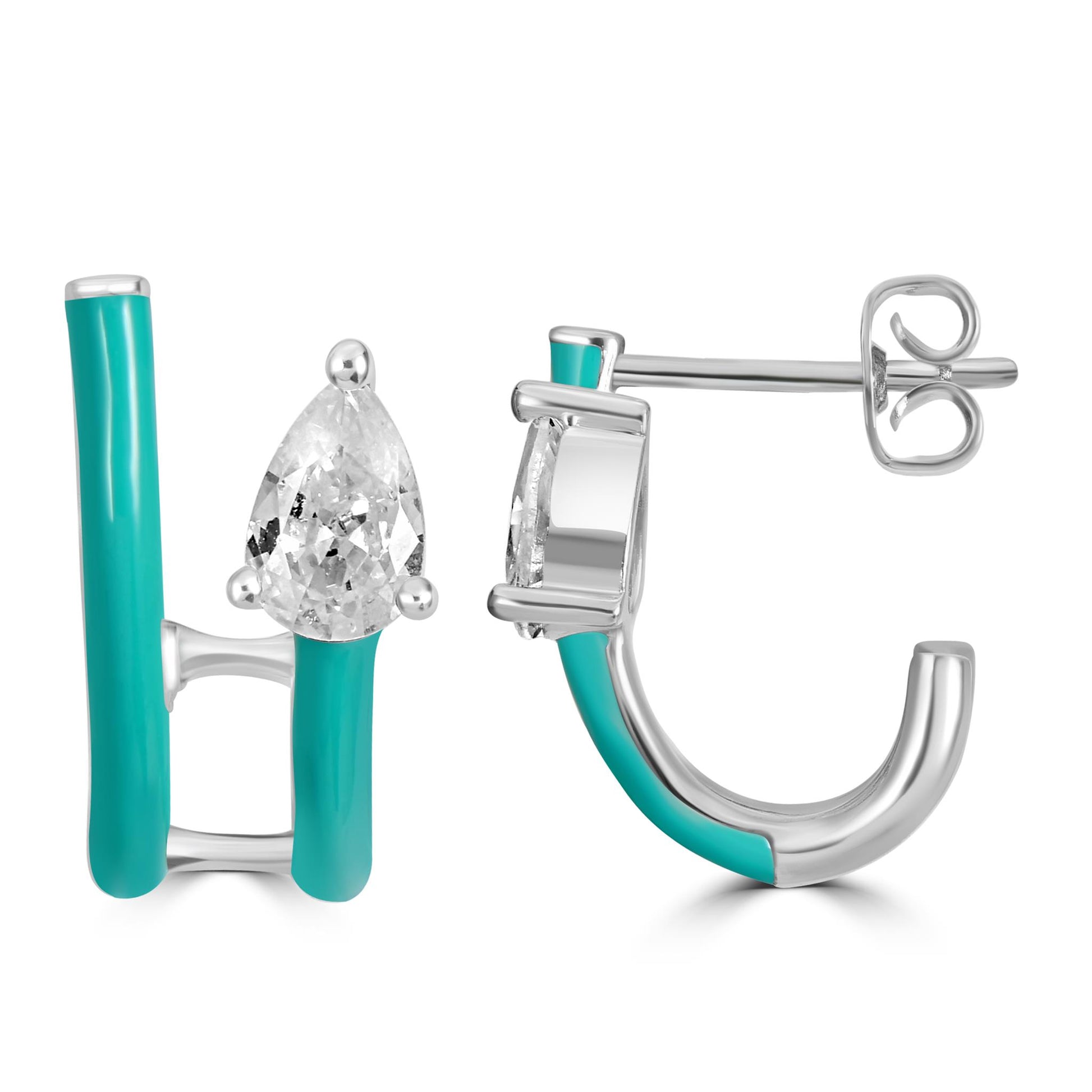 Bob Mackie is an internationally renowned costume and fashion designer who has dressed some of the most glamorous entertainment icons in the world. Gemistry has partnered with Bob Mackie in a brand new collaboration that marries the designer's exquisite sense of glamour and vibrant color with Gemistry's expertise in quality and craftmanship. The Gemistry Bob Mackie Hoop Earrings feature a Silver-Plated Brass backing with a double row of turquoise enamel. A gorgeous contrasting pear cut Cubic Zirconia stone in a prong setting rests at the top of the innermost row. The earrings are for pieced ears only and are secured with a post and nut backing. Whether you want to elevate your look, surprise someone with a thoughtful present, or celebrate a milestone, this exclusive collection helps you do just that! We are a modern brand that redefines luxury. With a focus on craftsmanship, sustainability, and transparency, Gemistry is committed to creating timeless pieces that will be treasured for generations.