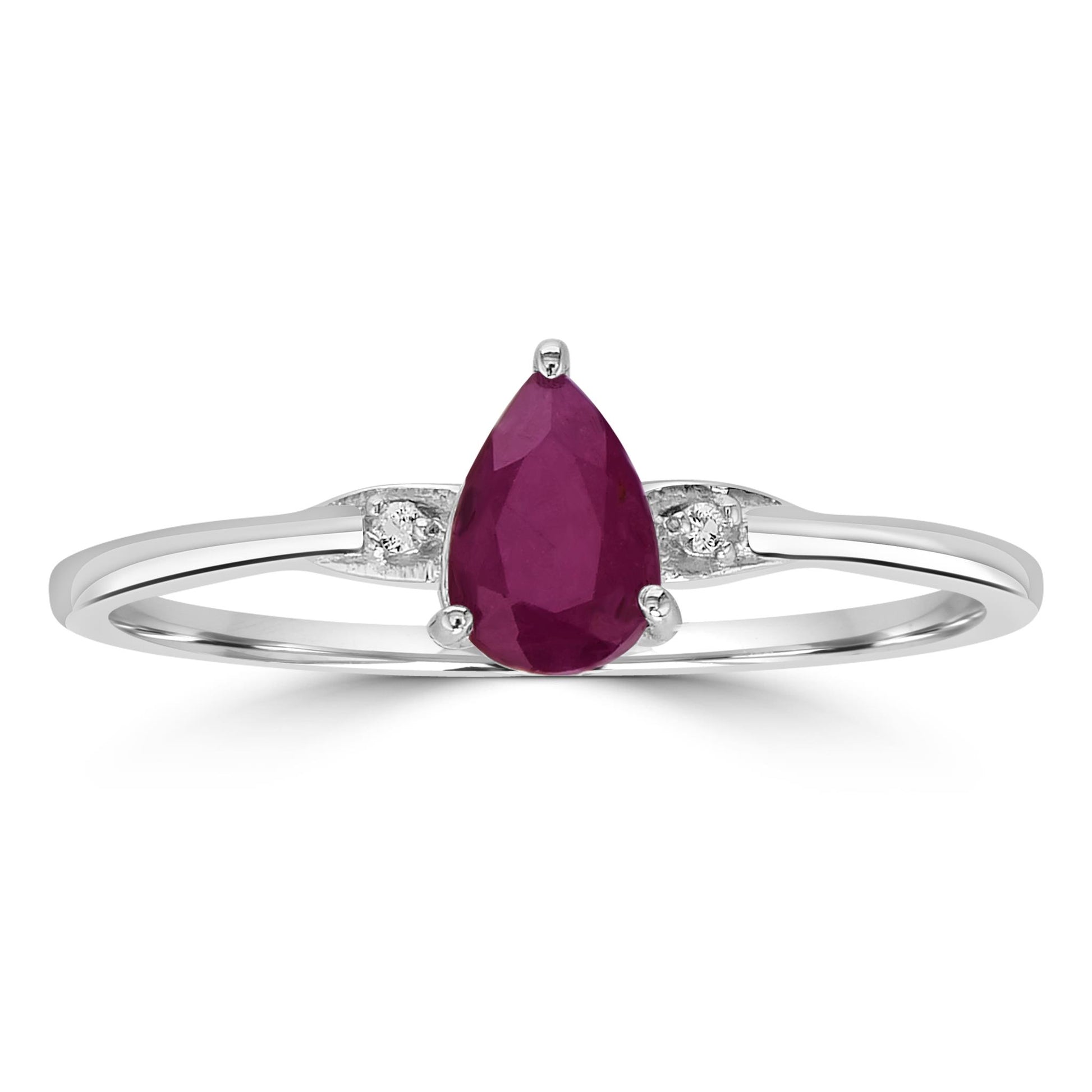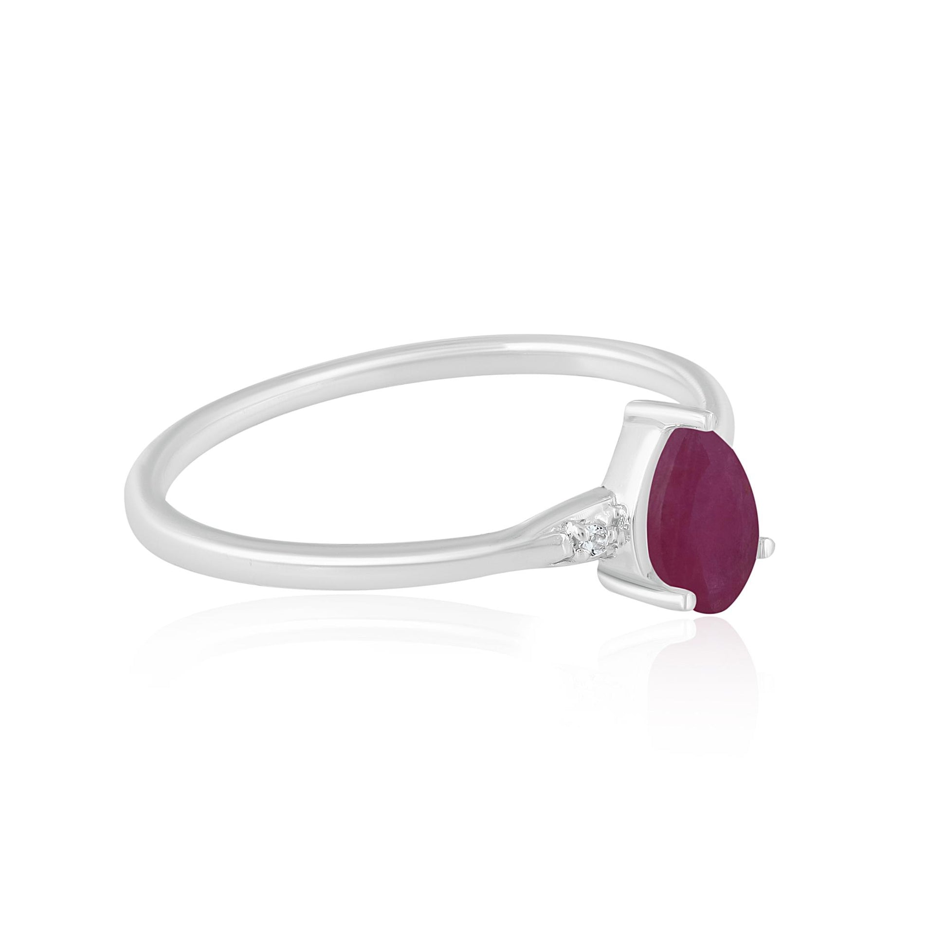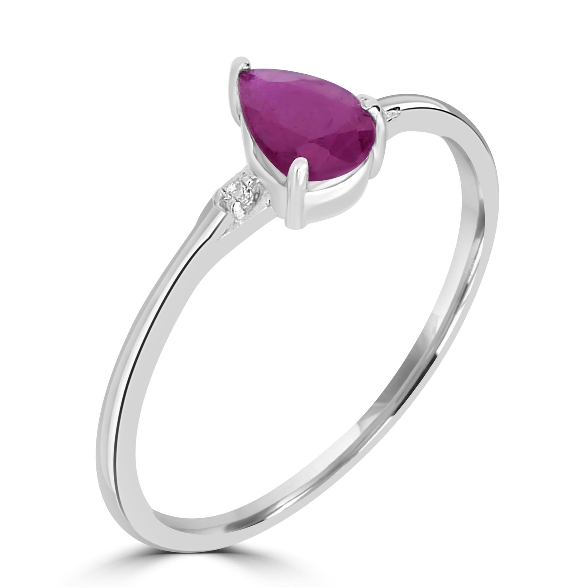 Introducing the Gemistry Stack Ring Collection : a versatile assortment of rings designed for effortless layering. Each piece combines timeless sophistication with modern flair, perfect for adding a touch of chic to any outfit. Mix, match, and stack to create your own unique style statement. The Dew Pear Cut Gemstone Ring is hand crafted from Sterling Silver. The prong setting holds a genuine pear cut Ruby gemstone, with a round White Topaz stone on either side. It is perfect for those born in July, as the Ruby is July's birthstone, and symbolizes love, passion, wealth and prosperity.