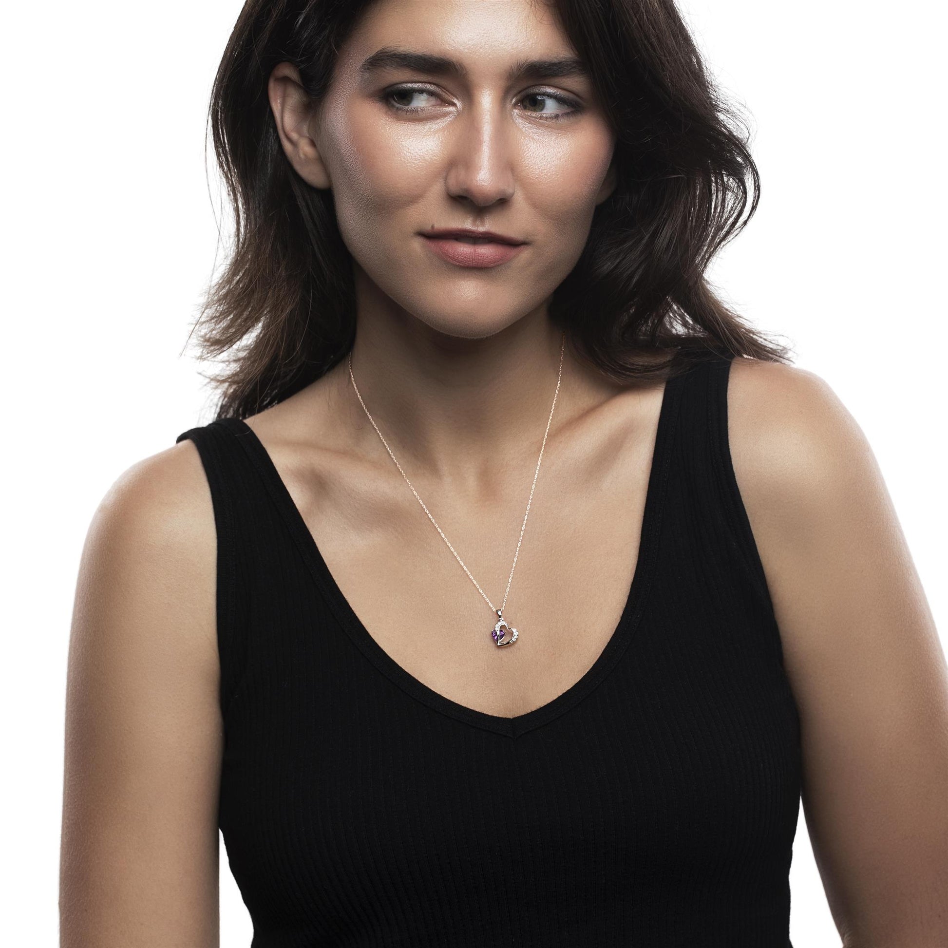Designed with genuine Amethyst and Cubic Zirconia accents, this sterling silver heart necklace expresses your love to the world. Rhodium plated to reduce tarnishing. Includes a black gift pouch.
