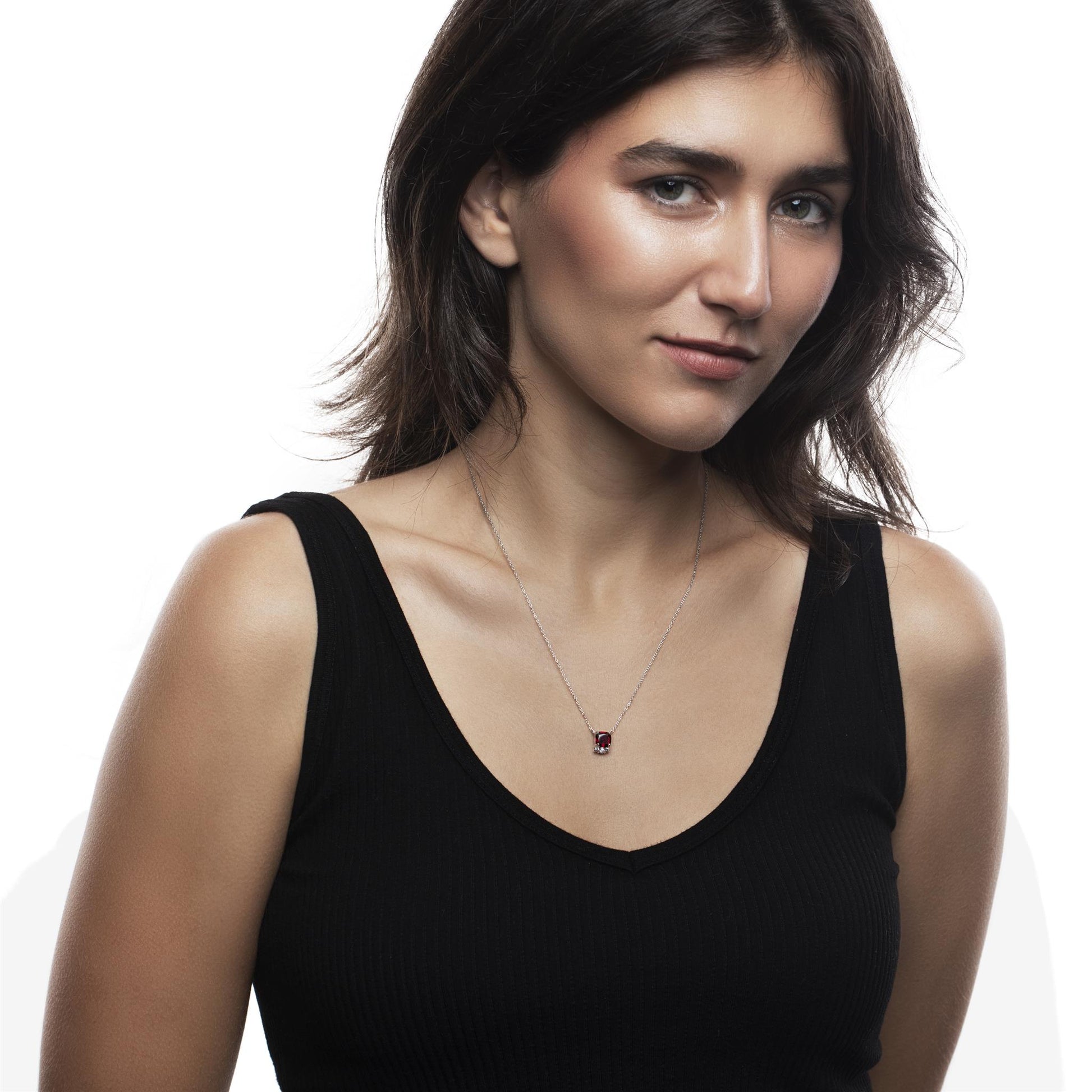 • Metal & Crafting: 925 Sterling Silver | Finish: Rhodium plating added to enhance shine and durability | Stone: Genuine Garnet with Cubic Zirconia Accents | Clasp Type: Spring Lock Closure | Stone Size: 6MM Cushion Cut | Chain: 18" cable chain with a 2" extender | Care: Imported wipe clean with a soft cloth.