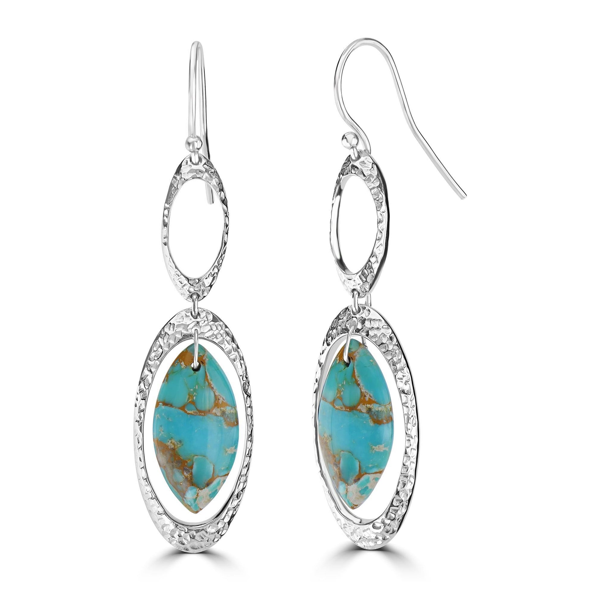 The Blue Sonoran Turquoise Cabochon Drop Earrings are so mesmerizing and stylish. Featured with elongated marquise shaped cabochons of blue sonoran turquoise are suspended from open space textured oval frames of sterling silver. These earrings come with ear wire backs for easy and hassle free wear. These sterling silver drop earrings are showcased with exceptional quality gemstones, which are strictly graded for the best quality and 100% conflict free. These drop earrings are perfect for those special evenings, when you want all eyes on you. Pair it up with your favorite black dress and you are good to go. These earrings are also an ideal gift to your loved one be it birthdays, anniversaries, etc.Gemistry "GG Collection" Marquise Cabochon Gemstone Drop Earrings in Sterling Silver