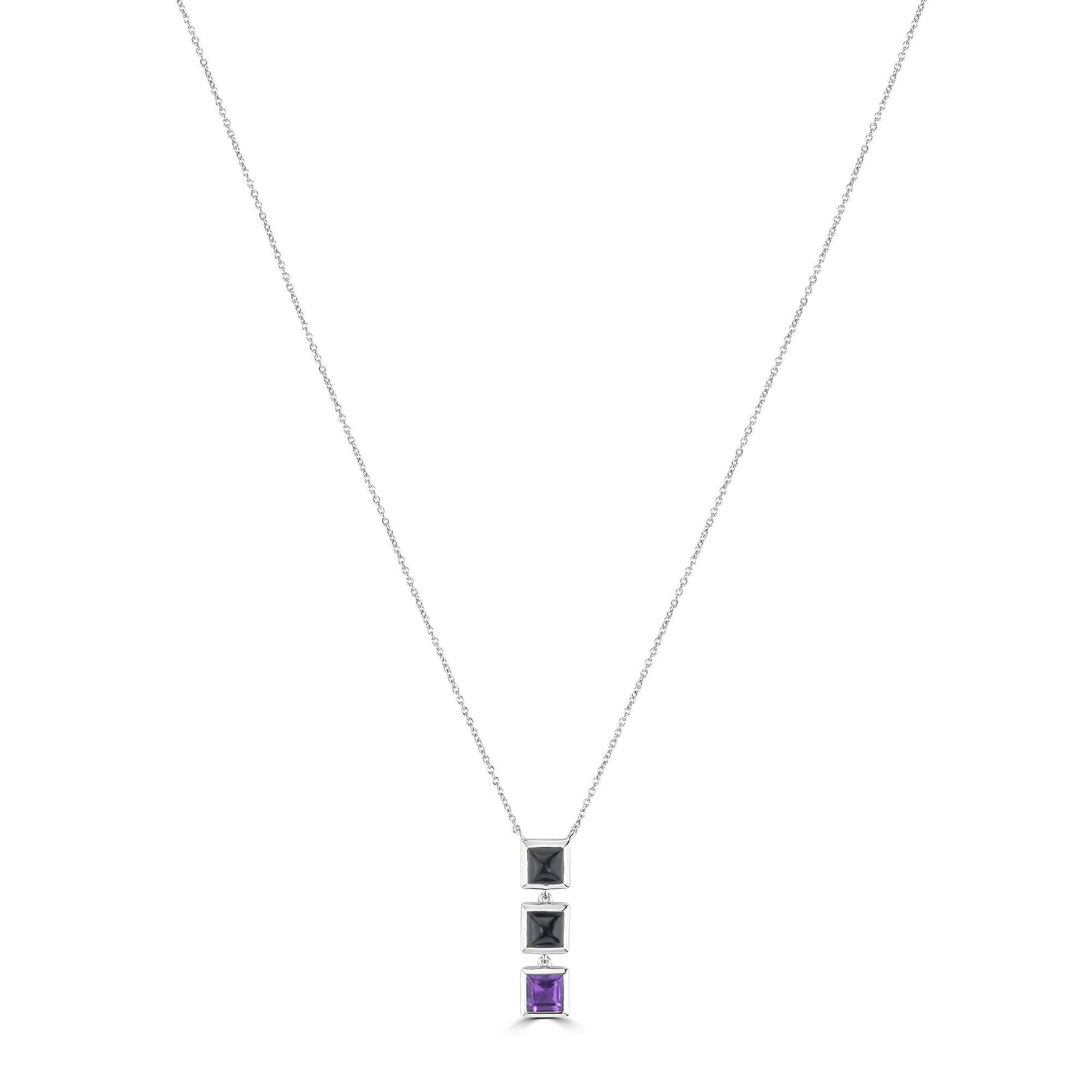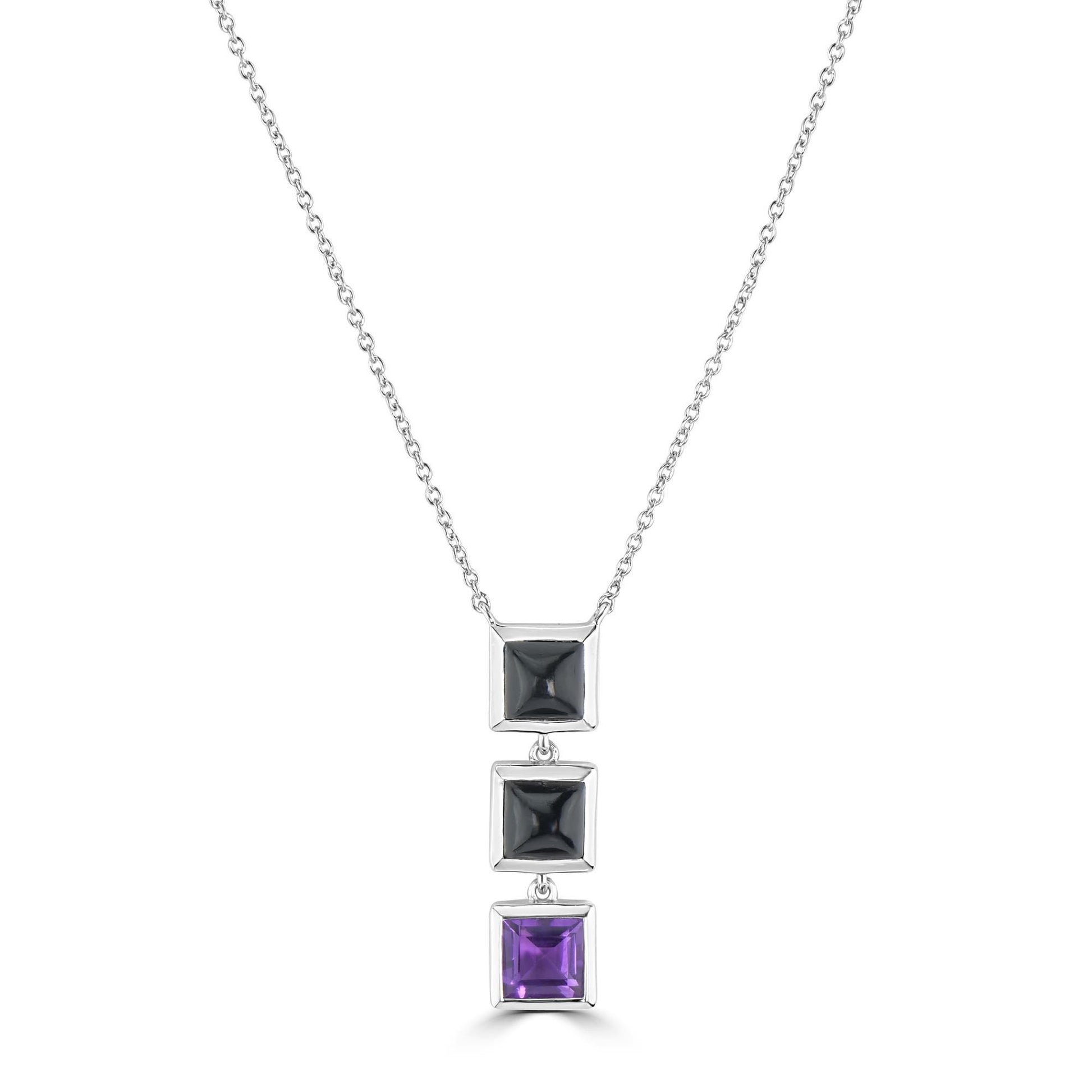 The Black Jade And Amethyst Pendant Necklace is an avant garde upgrade to any outfit. Featured with bezel set black jade and amethyst in square frames of sterling silver. This pendant is suspended from an elegant cable chain with a hanging length of 20 inches and comes with a lobster clasp. Adorn your neckline with this stunning statement necklace and be the center of attraction. The necklace showcases exceptional quality gemstones, which are strictly graded for the best quality and 100% conflict free. This sterling silver necklace is perfectly suitable for special occasions like Christmas, Anniversaries, Birthdays, etc.Gemistry "GG Collection" Square Gemstone High Polish Pendant Necklace in Sterling Silver