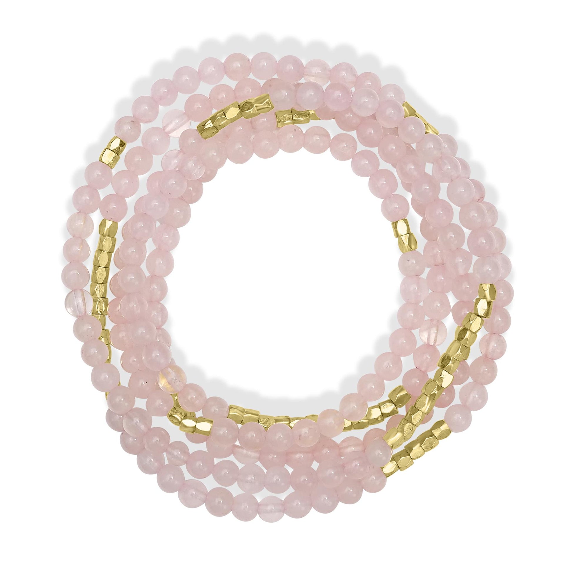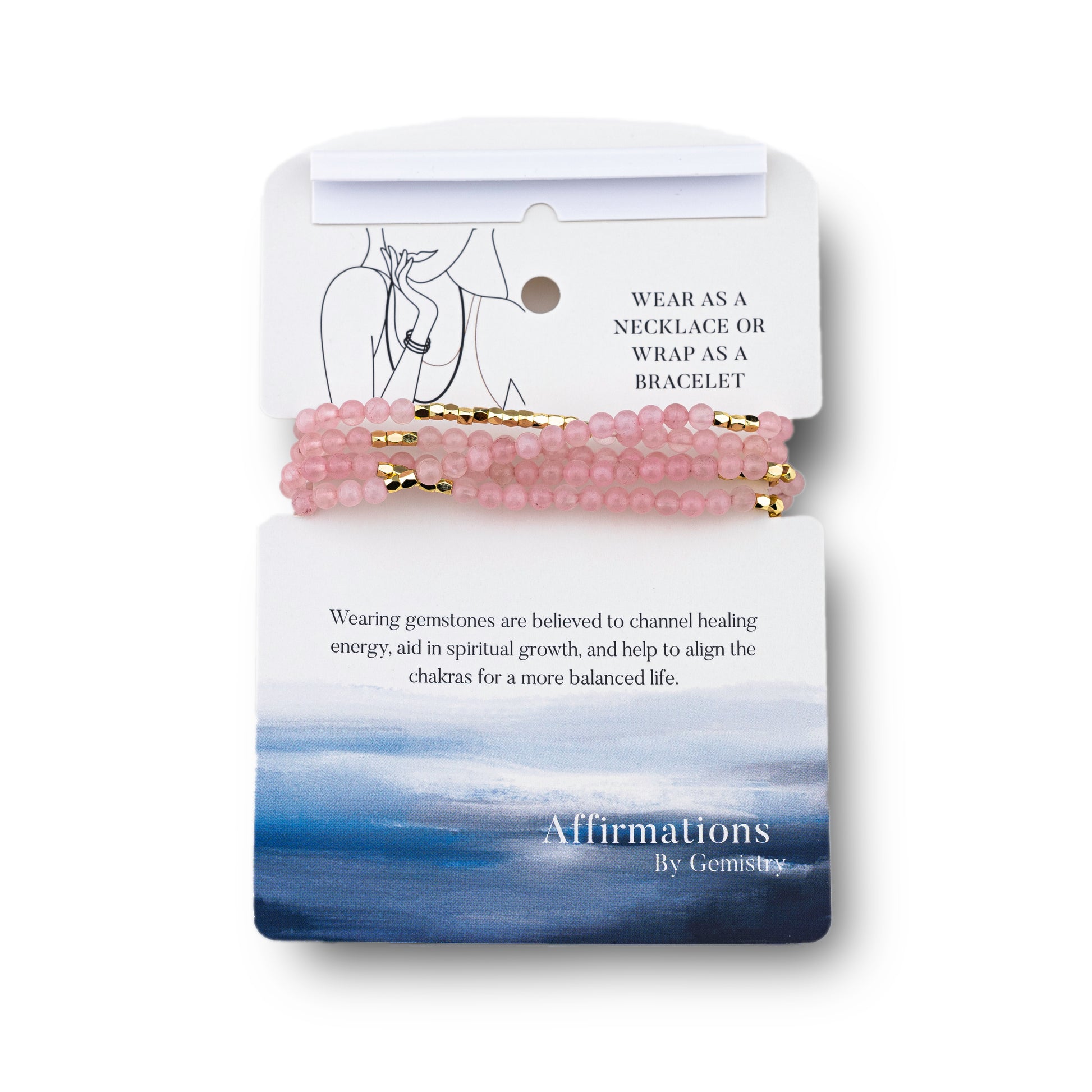 The Affirmations Wrap Bracelets by Gemistry are the perfect way to embrace your love of fashion while unlocking the healing energy of that comes from wearing our genuine gemstones. Wearing gemstones is believed to help to open, balance and harmonize the body’s seven chakras for improved physical and spiritual health. Different gemstones are associated with each of the chakras, providing grounding, security, protection and emotional healing. Each gemstone in our collection is both beautiful and meaningful and can be styled as either a wrap bracelet or used in a single strand as a necklace. The Gold-Plated Wrap Bracelet from Gemistry features a wrapped strand of 2mm round Rose Quartz beads interspersed with 14K Gold-Plated Brass accents. The simple strand design allows the bracelet to wrap around the wrist multiple times, creating a layered look from a single piece. The vibrant gemstone beads contrast with the shiny Gold-Plated Brass, creating a striking and elegant appearance. This bracelet is flexible, adjustable, and easy to wear and style with casual outfits and formal attire alike, making it ideal for fashion enthusiasts, gemstone lovers, gift givers, and anyone looking for a pop of chic!