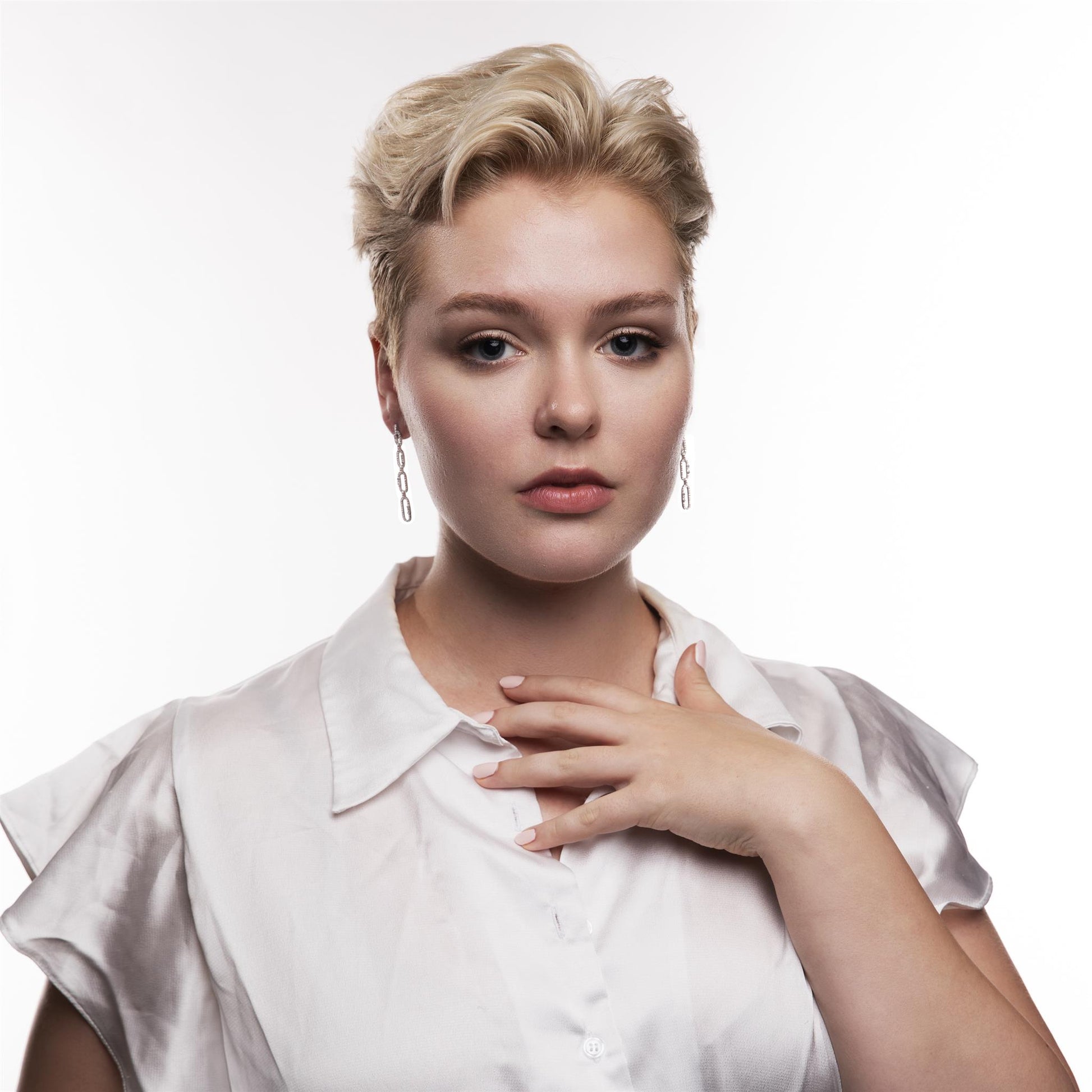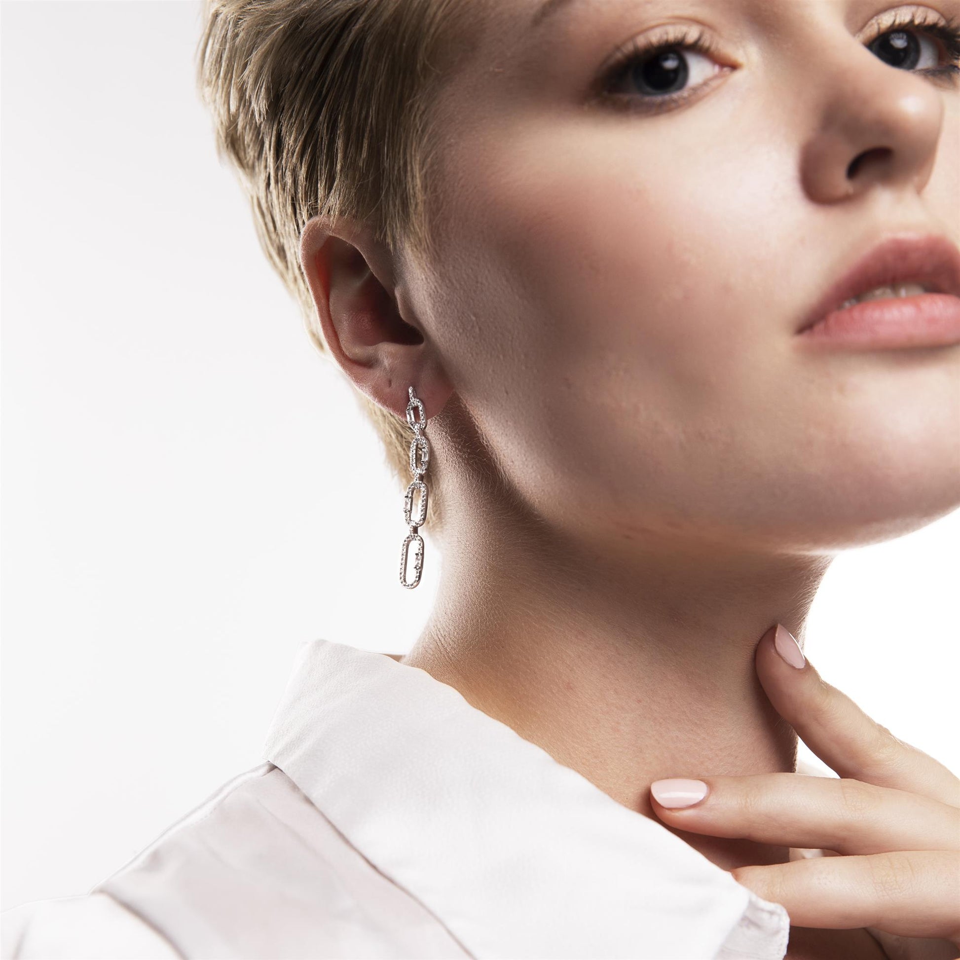 The Gemistry Judy Crowell Collection is renowned for its elegant and timeless designs, featuring a diverse range of unique gemstones set in high-quality materials. Each piece reflects Judy's classic and sophisticated style, offering versatile and affordable options suitable for both everyday wear and special occasions. These open link drop earrings are made up of 144 round and 8 baguette Cubic Zirconia stones. They are lightweight and face-framing but with a stunning amount of sparkle - enough to brighten any outfit!
