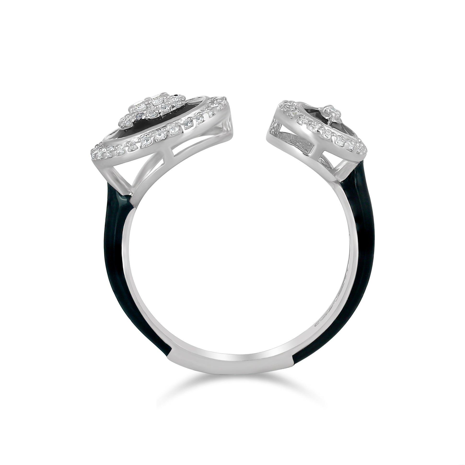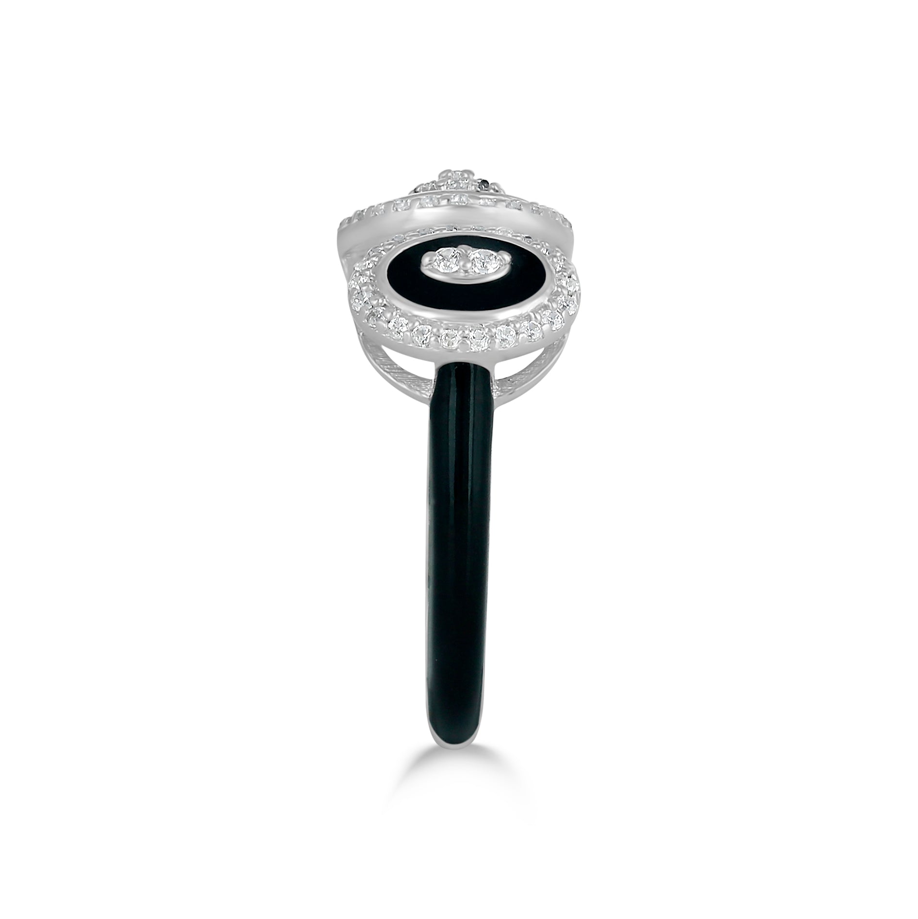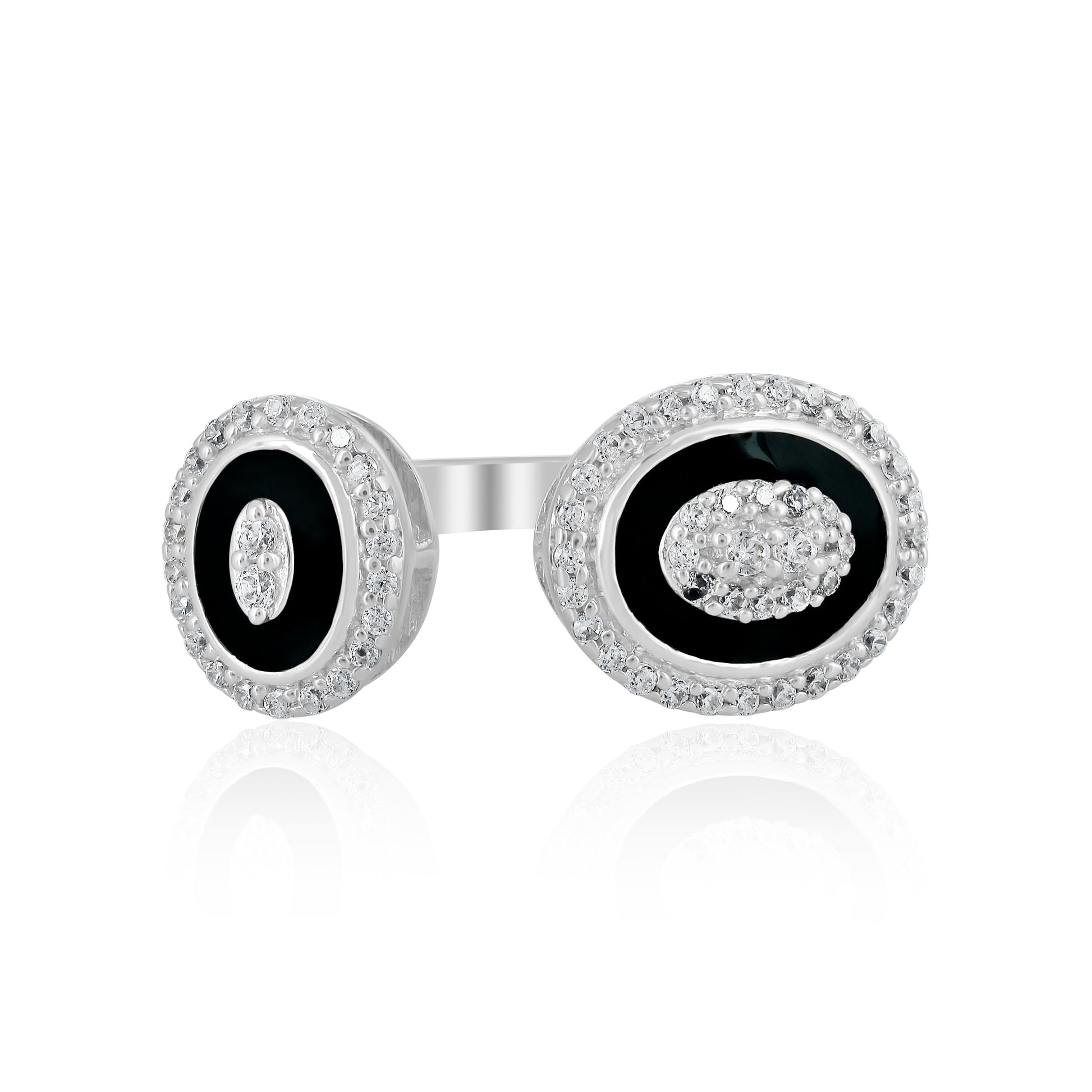 The Gemistry Judy Crowell Collection is renowned for its elegant and timeless designs, featuring a diverse range of unique gemstones set in high-quality materials. Each piece reflects Judy's classic and sophisticated style, offering versatile and affordable options suitable for both everyday wear and special occasions The Judy Crowell Sterling Silver Black Enamel Open Ring features an array of round cut Cubic Zirconia stones in a round formation on each end of a CZ encrusted band. Each cluster of stones is embellished with a contrasting, high-gloss black enamel along with an enamel coated band. Handcrafted from genuine .925 Sterling Silver this ring is a definite show-stopper! Cubic Zirconia’s flawless appearance and radiant sparkle are often associated with purity and clarity. The stone is believed to represent a clear mind, transparency in thought, and the purity of one’s intentions. It encourages honesty and openness in communication and relationships.