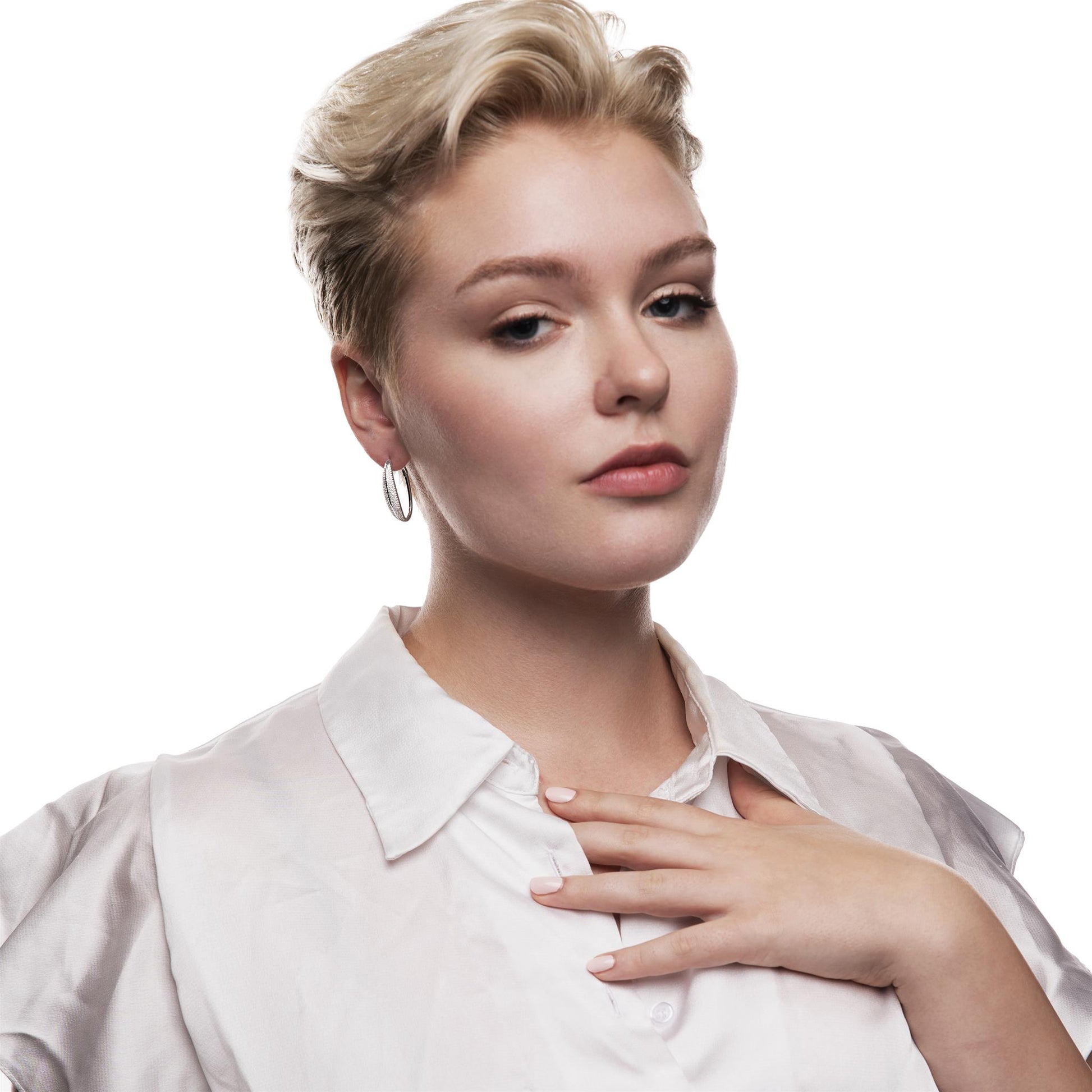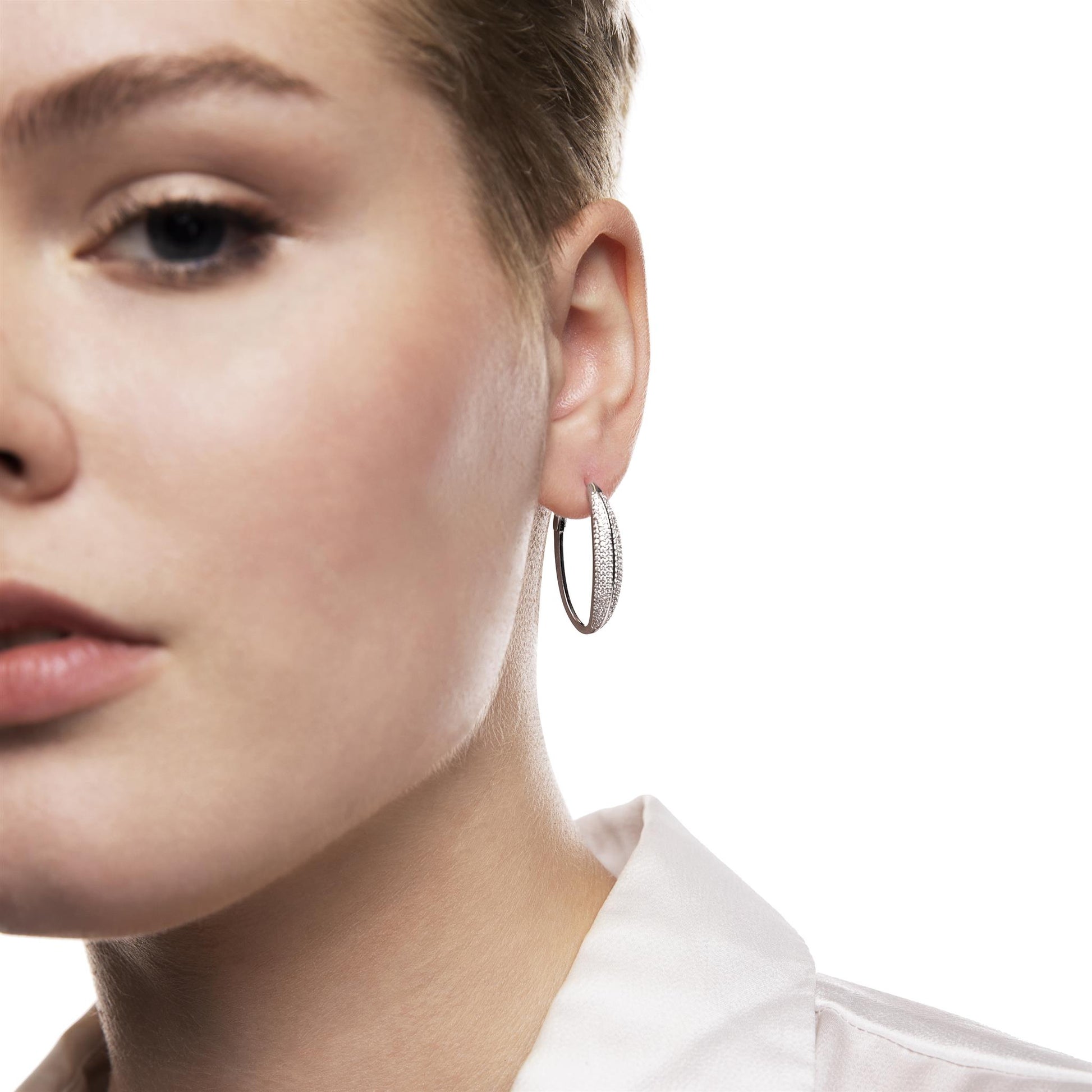 The Gemistry Judy Crowell Collection is renowned for its elegant and timeless designs, featuring a diverse range of unique gemstones set in high-quality materials. Each piece reflects Judy's classic and sophisticated style, offering versatile and affordable options suitable for both everyday wear and special occasions. Dazzle with this stunning Sterling Silver marquise hoop earrings. They feature a unique hoop encrusted with sparkling CZ stones. They are lightweight and have easy to use hinged post closures (for pierced ears only).