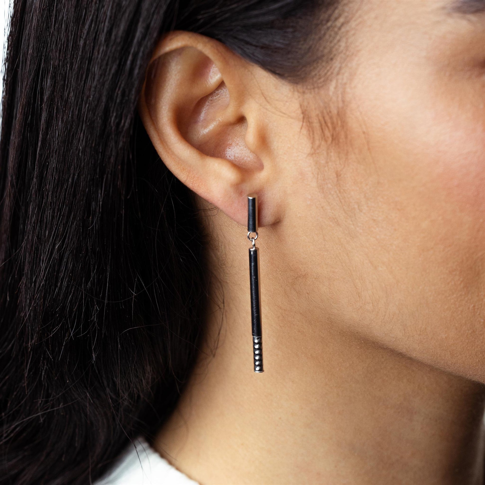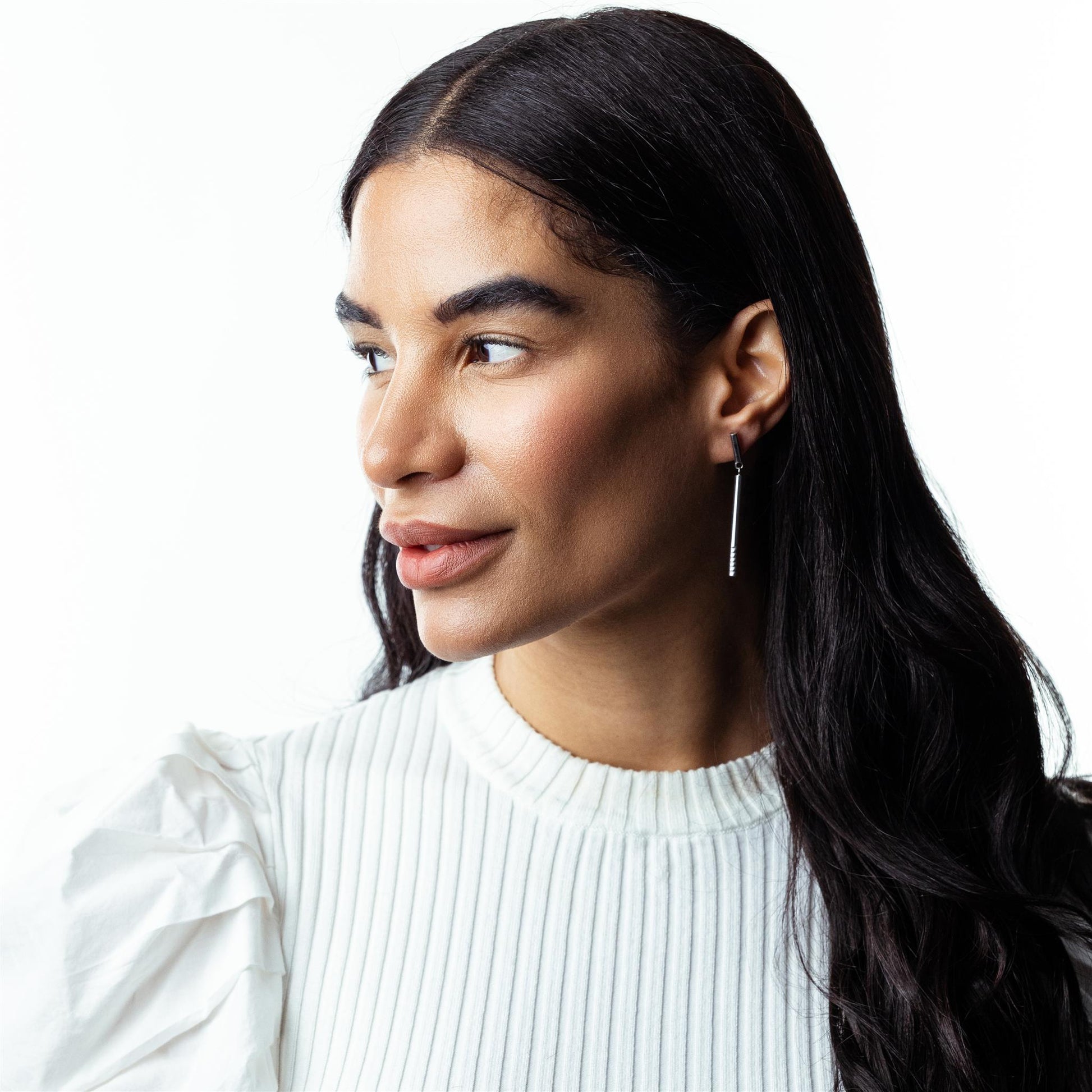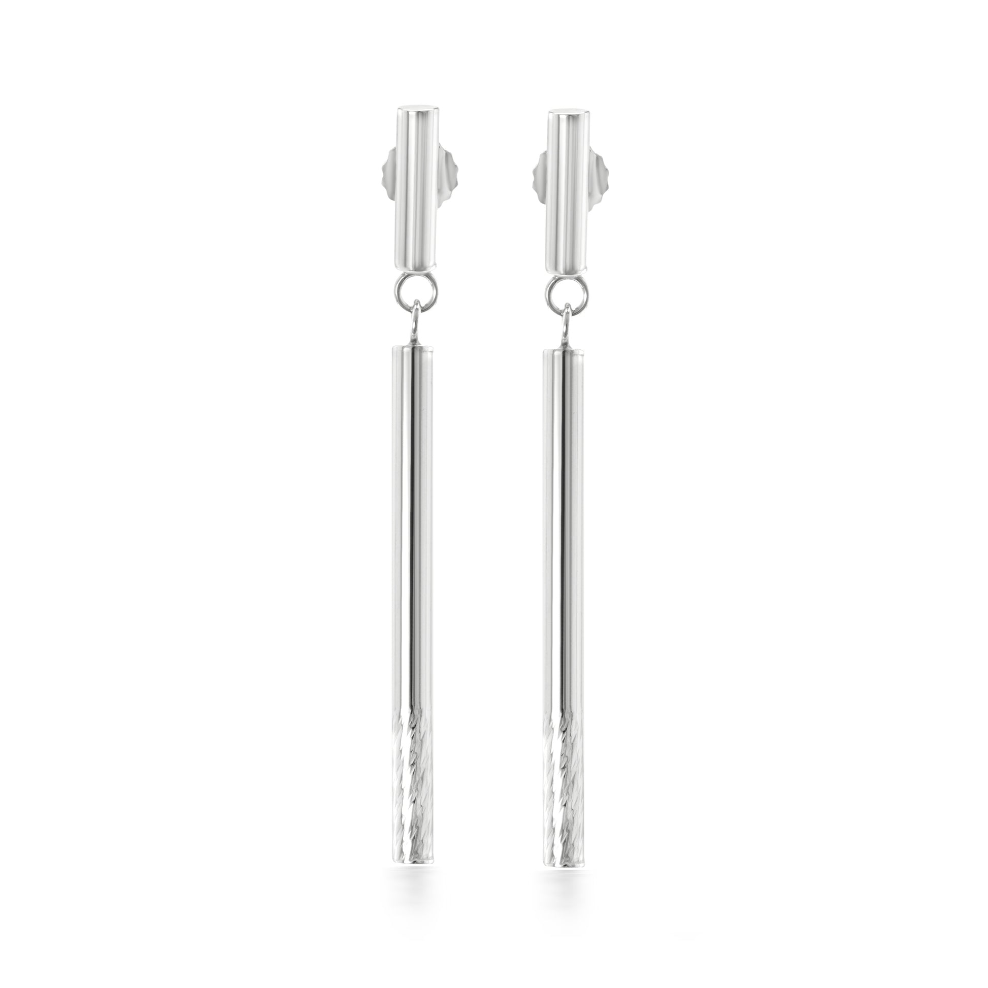 The Gemistry Judy Crowell Collection is renowned for its elegant and timeless designs, featuring a diverse range of unique gemstones set in high-quality materials. Each piece reflects Judy's classic and sophisticated style, offering versatile and affordable options suitable for both everyday wear and special occasions. Dazzle with this stunning Sterling Silver Textured Bar Drop Earrings. They feature a smooth tube of Rhodium-Plated Sterling Silver with a diamond cut etching at the base. These long bar earrings shimmer in the light. Rhodium plating helps create a mirrored shine and helps to prevent tarnish which occurs naturally to Sterling Silver. These earrings are lightweight and have post and clutch closures (for pierced ears only).