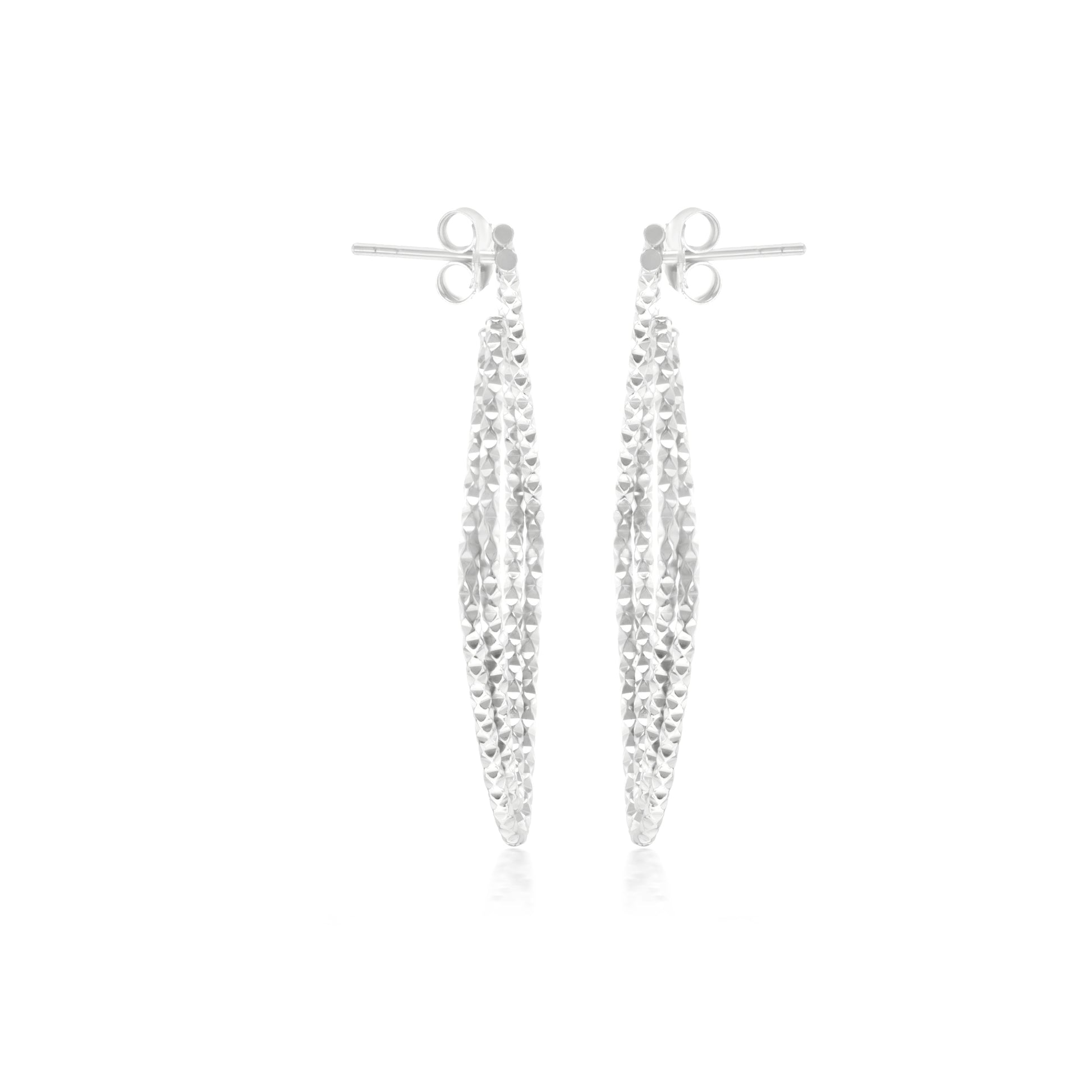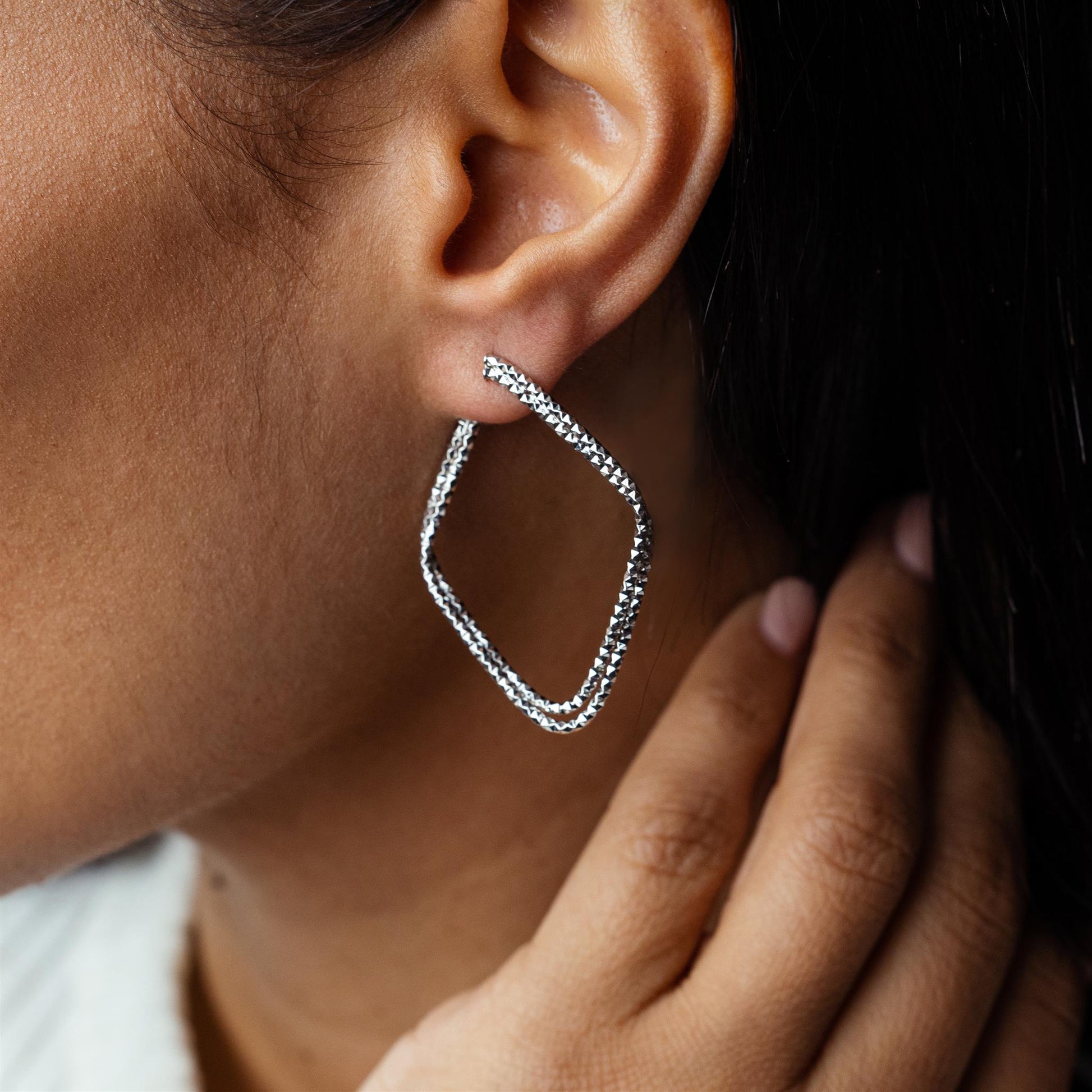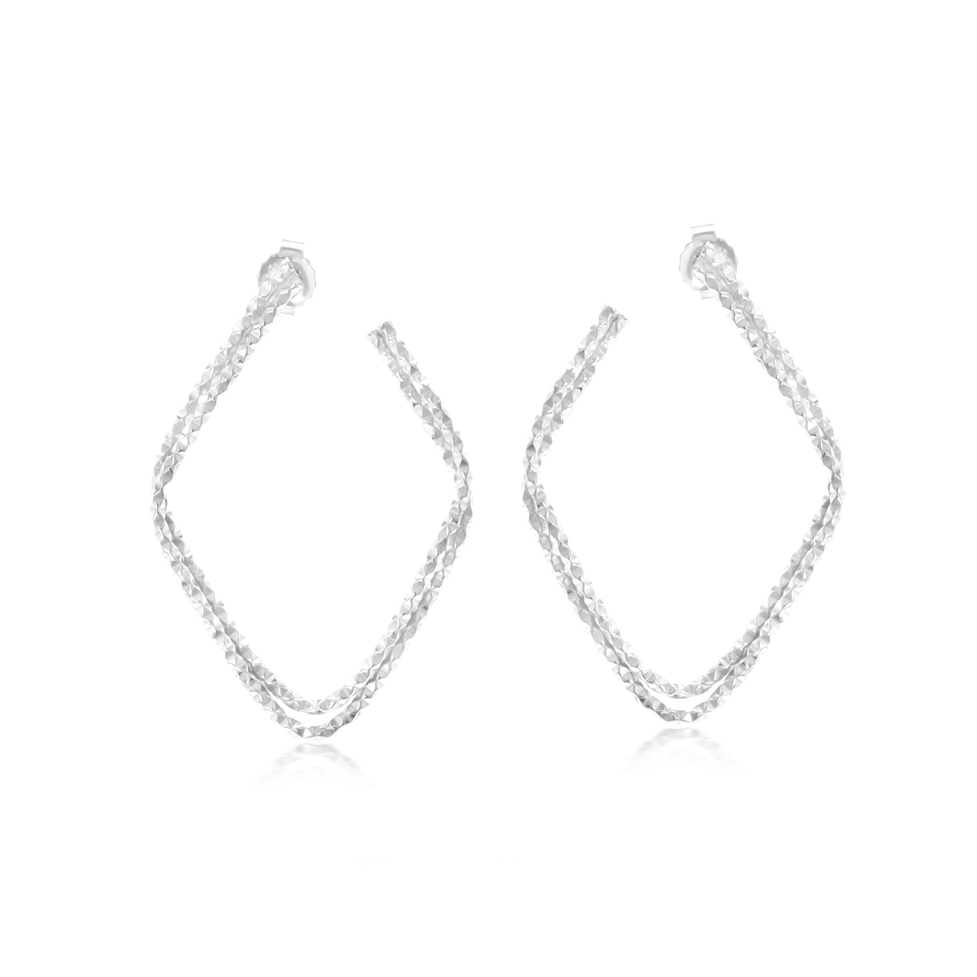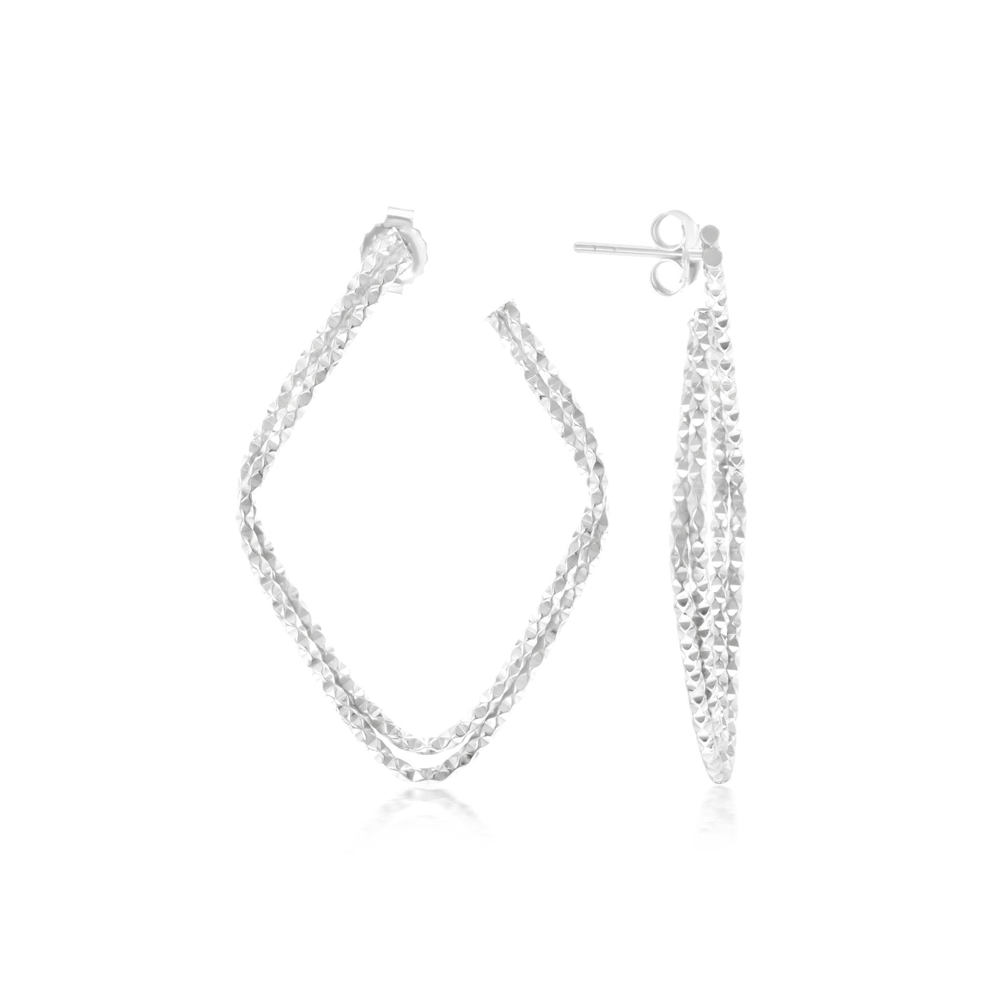 The Gemistry Judy Crowell Collection is renowned for its elegant and timeless designs, featuring a diverse range of unique gemstones set in high-quality materials. Each piece reflects Judy's classic and sophisticated style, offering versatile and affordable options suitable for both everyday wear and special occasions. Dazzle with these stunning Sterling Silver Diamond-Cut Hoop Earrings. They feature a unique diamond-cut Sterling Silver in a double-ribbon textured high-polish design. These Rhodium-Plated Sterling Silver earrings glimmer like diamonds due to the high gloss plating and etched design. They are lightweight and have post and clutch closures (for pierced ears only).