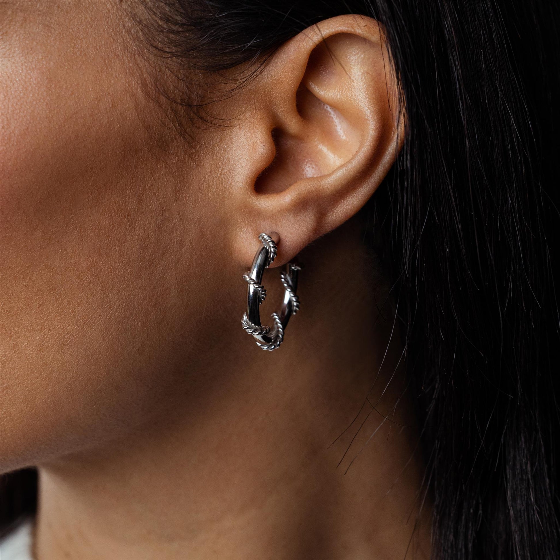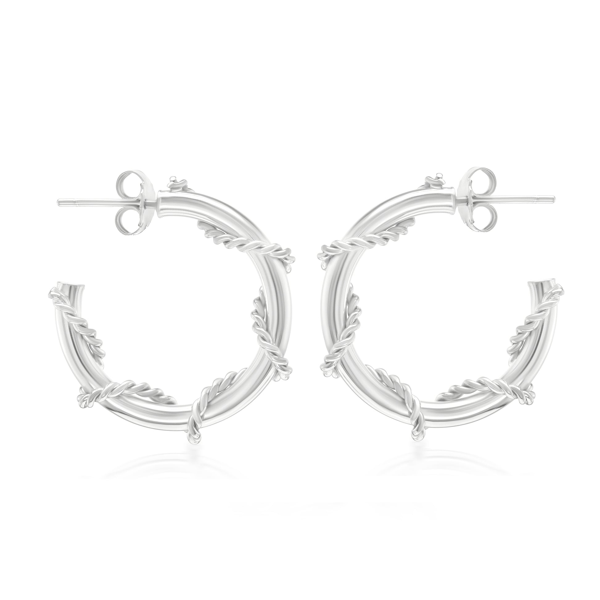 The Gemistry Judy Crowell Collection is renowned for its elegant and timeless designs, featuring a diverse range of unique gemstones set in high-quality materials. Each piece reflects Judy's classic and sophisticated style, offering versatile and affordable options suitable for both everyday wear and special occasions. Dazzle with this stunning Sterling Silver Twisted Rope Hoop earrings. They feature a smooth hoop of Rhodium-Plated Sterling Silver with a twisted rope design accent. Rhodium plating enhances the shine and helps to prevent tarnish which occurs naturally to Sterling Silver. These earrings are lightweight and have post and clutch closures (for pierced ears only).