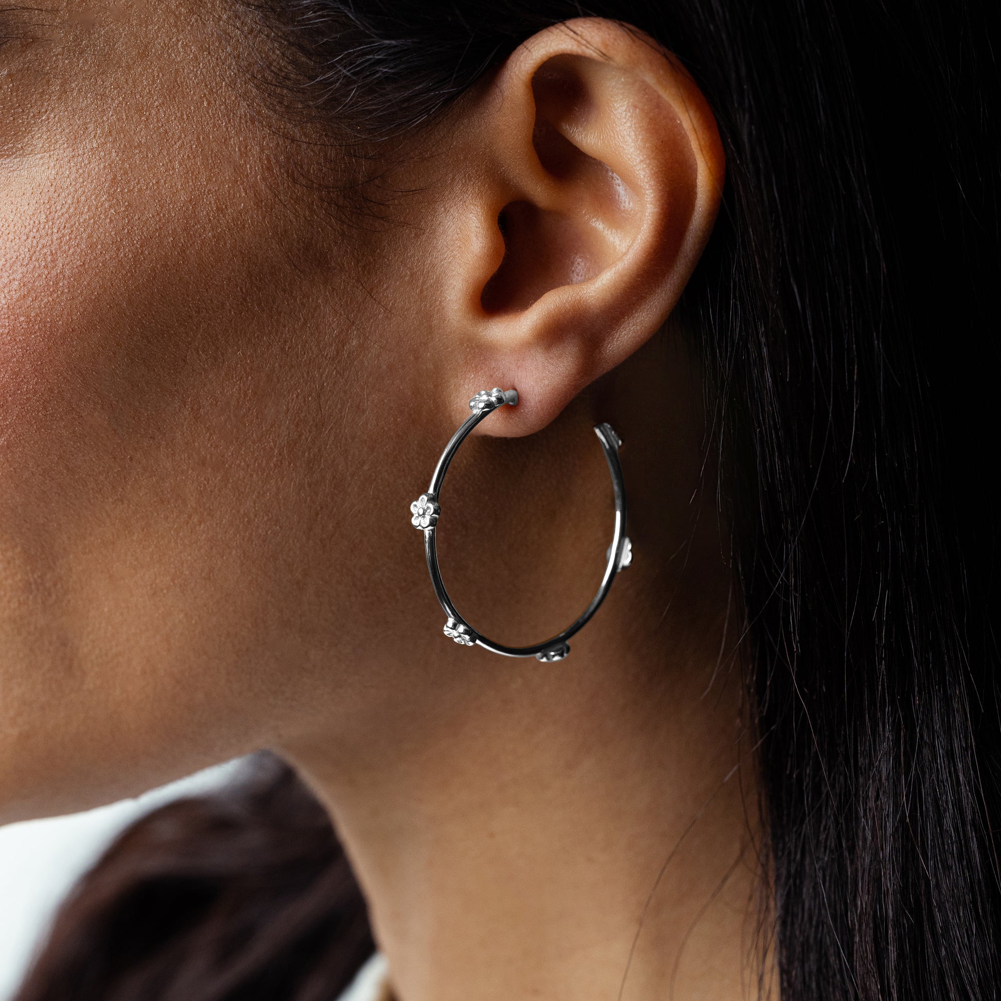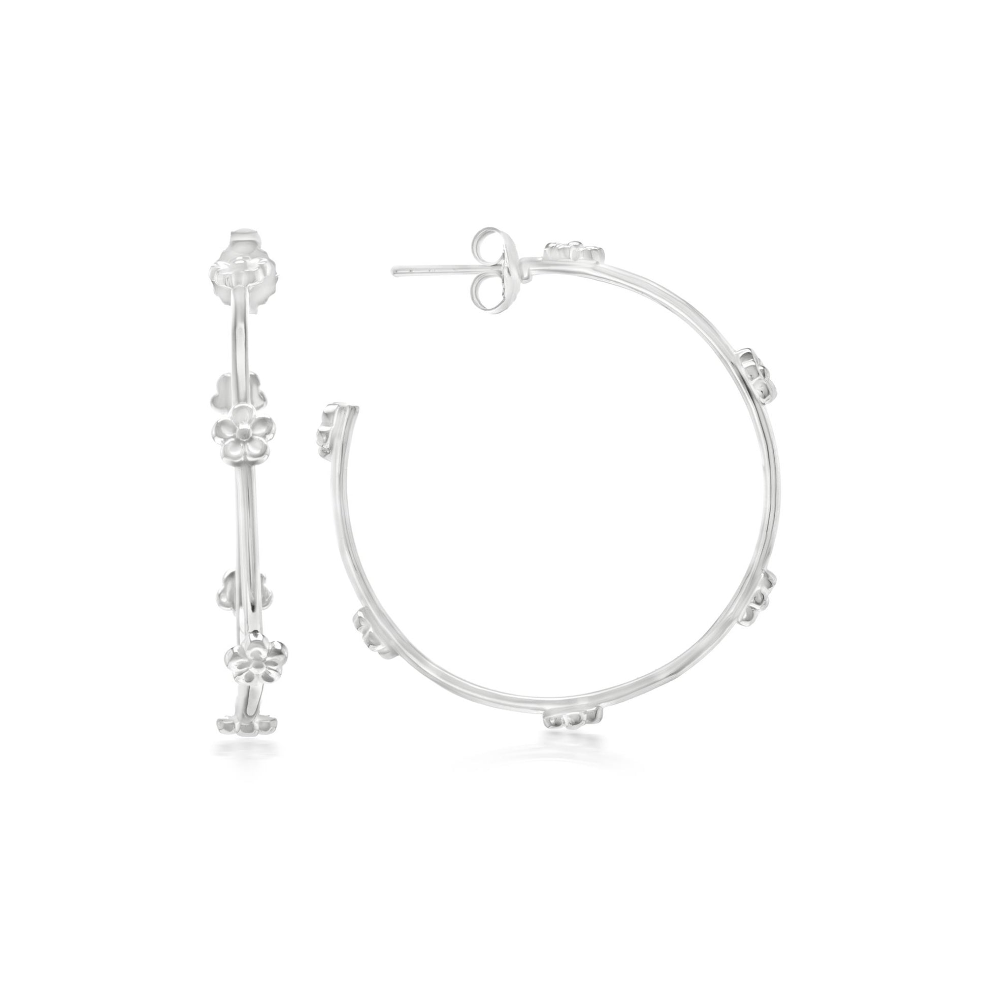 The Gemistry Judy Crowell Collection is renowned for its elegant and timeless designs, featuring a diverse range of unique gemstones set in high-quality materials. Each piece reflects Judy's classic and sophisticated style, offering versatile and affordable options suitable for both everyday wear and special occasions. Give the gift of both jewelry AND flowers with these Sterling Silver Flower Station Hoop earrings! They feature a unique hoop design of Rhodium-Plated Sterling Silver with 6 flower stations interspersed evenly around each hoop. Rhodium plating enhances the shine and helps to prevent tarnish which occurs naturally to Sterling Silver. These earrings are lightweight and have post and clutch closures (for pierced ears only).