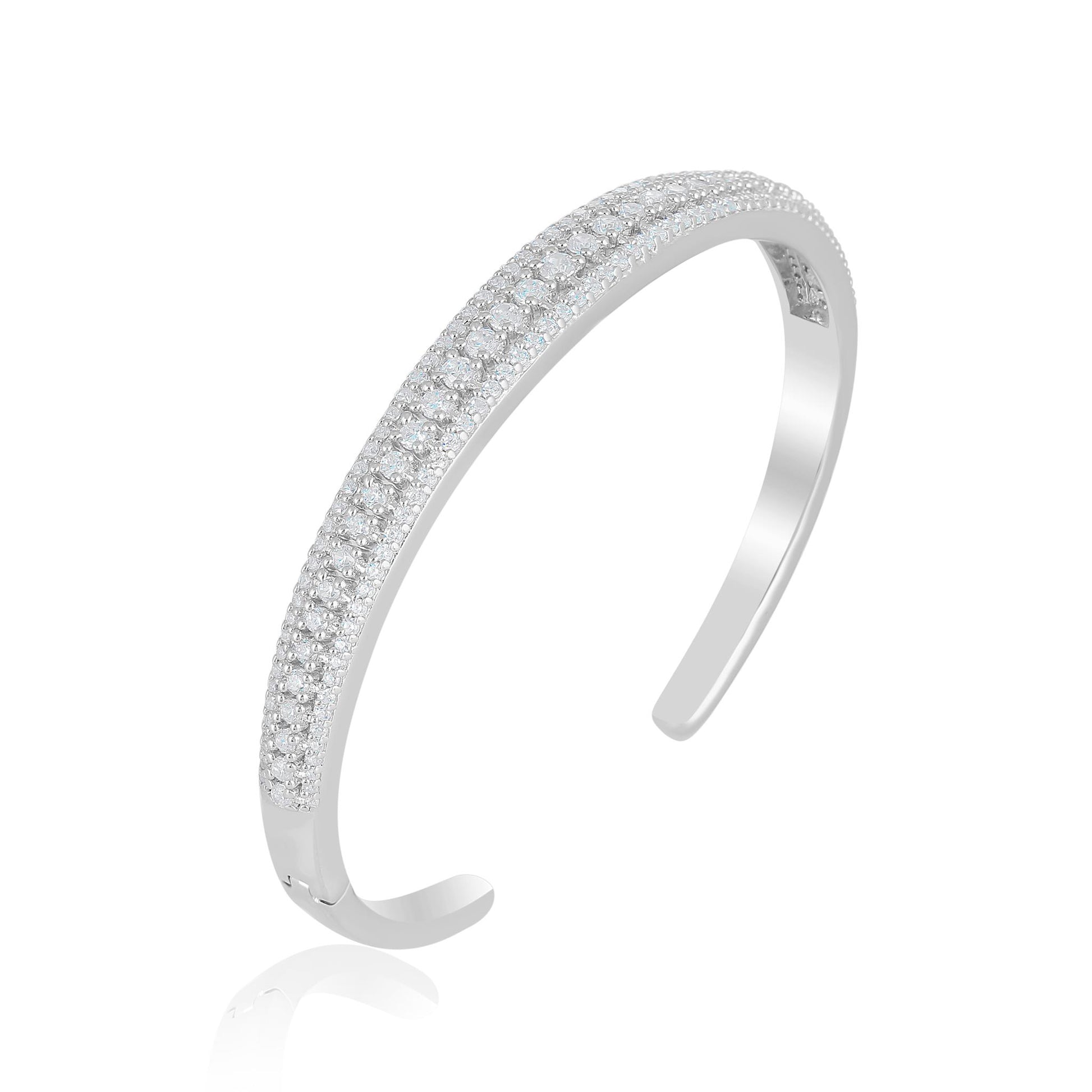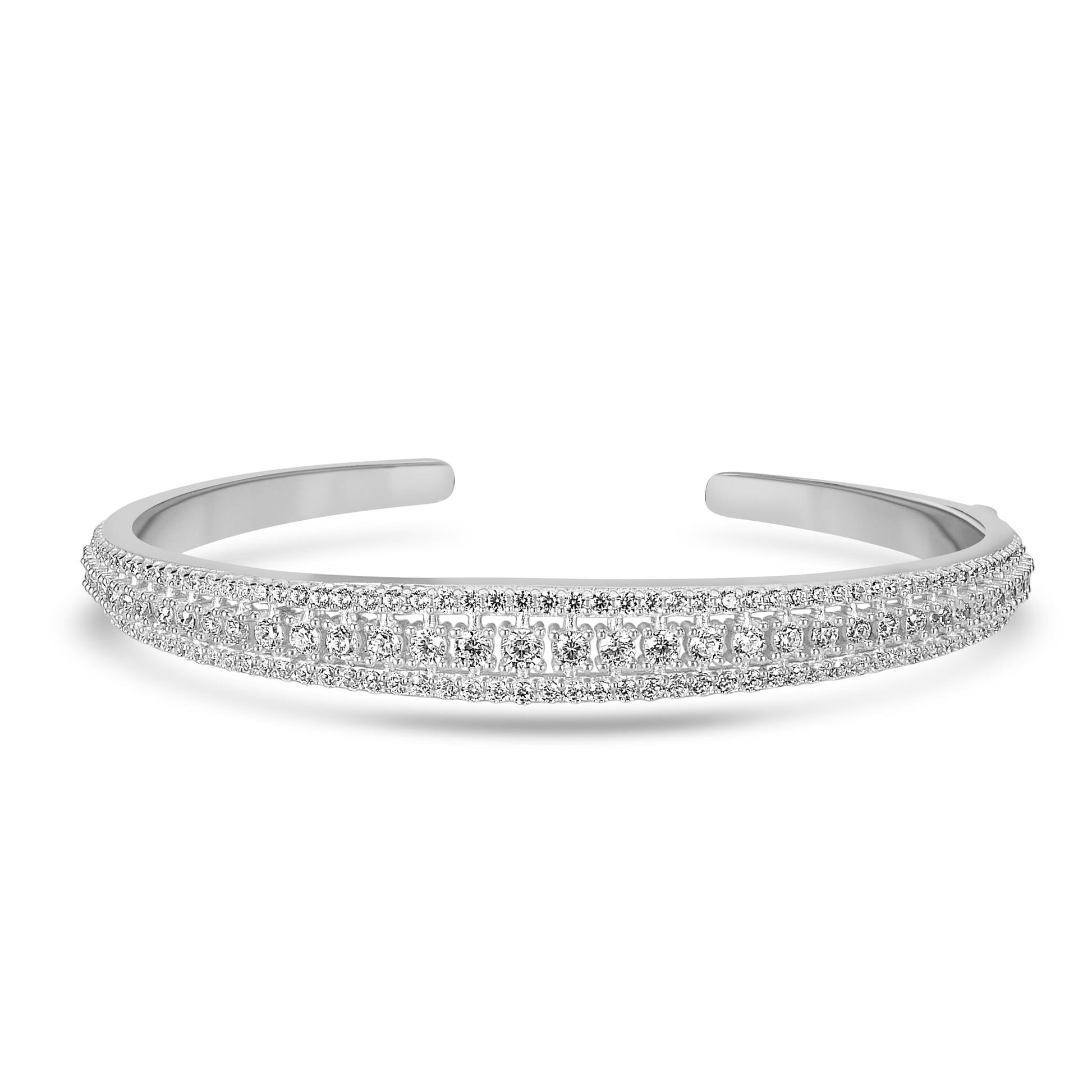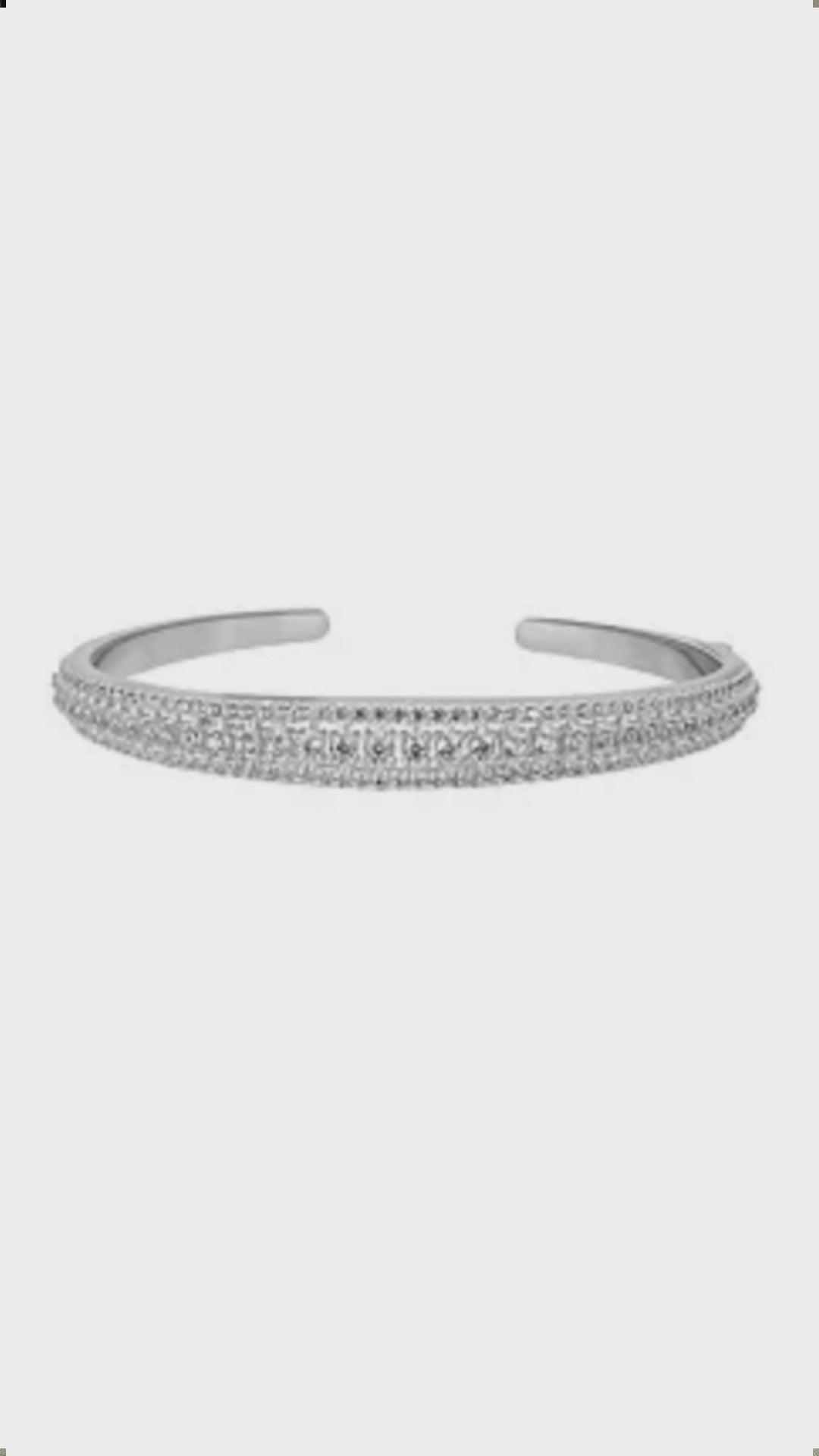 The Gemistry Judy Crowell Collection is renowned for its elegant and timeless designs, featuring a diverse range of unique gemstones set in high-quality materials. Each piece reflects Judy's classic and sophisticated style, offering versatile and affordable options suitable for both everyday wear and special occasions. Dazzle with this stunning Sterling Silver cuff bracelet with Cubic Zirconia stones. This open cuff bracelet features 3 rows of sparkling Cubic Zirconia stones wrapped in a band of genuine Sterling Silver (51mm circumference). Cubic Zirconia is known for its brilliant sparkle, clarity, and hardness, offering a flawless, luxurious appearance.