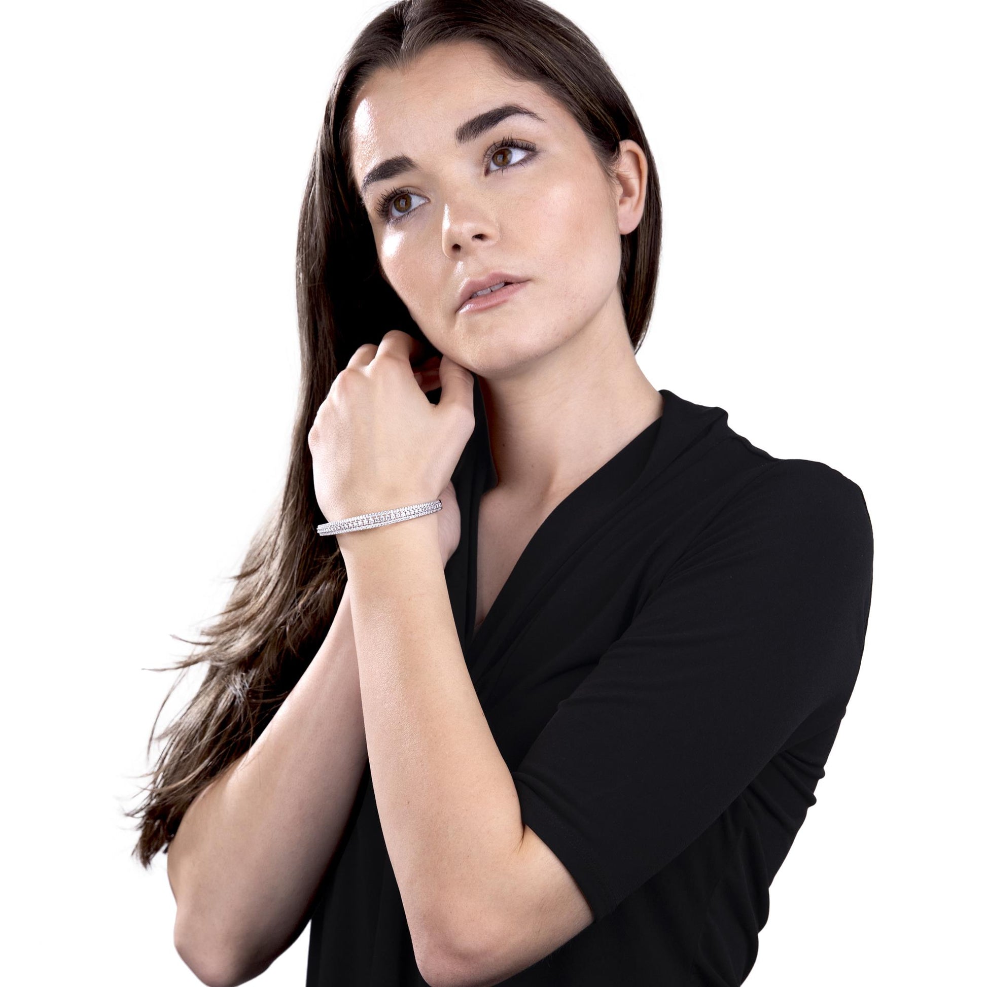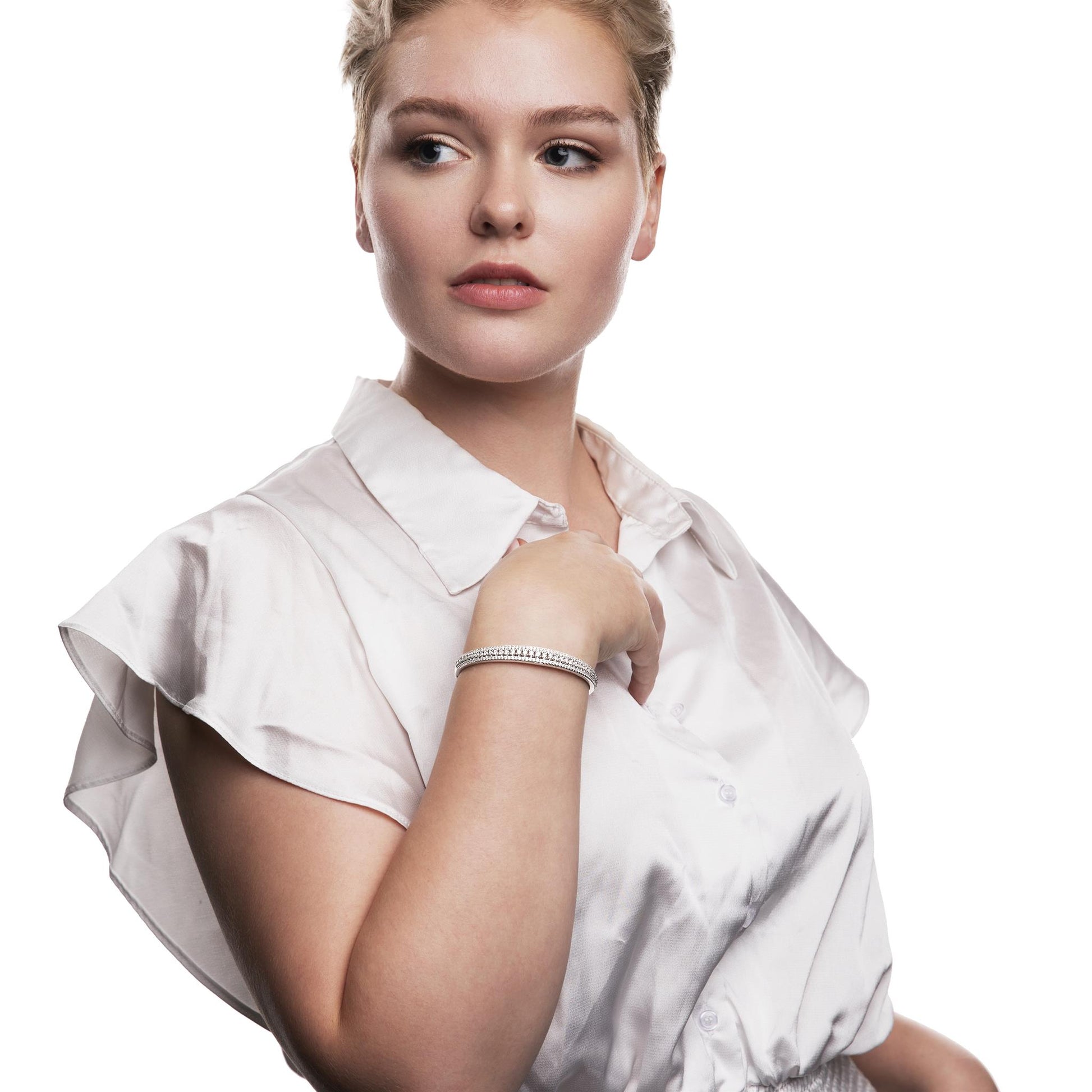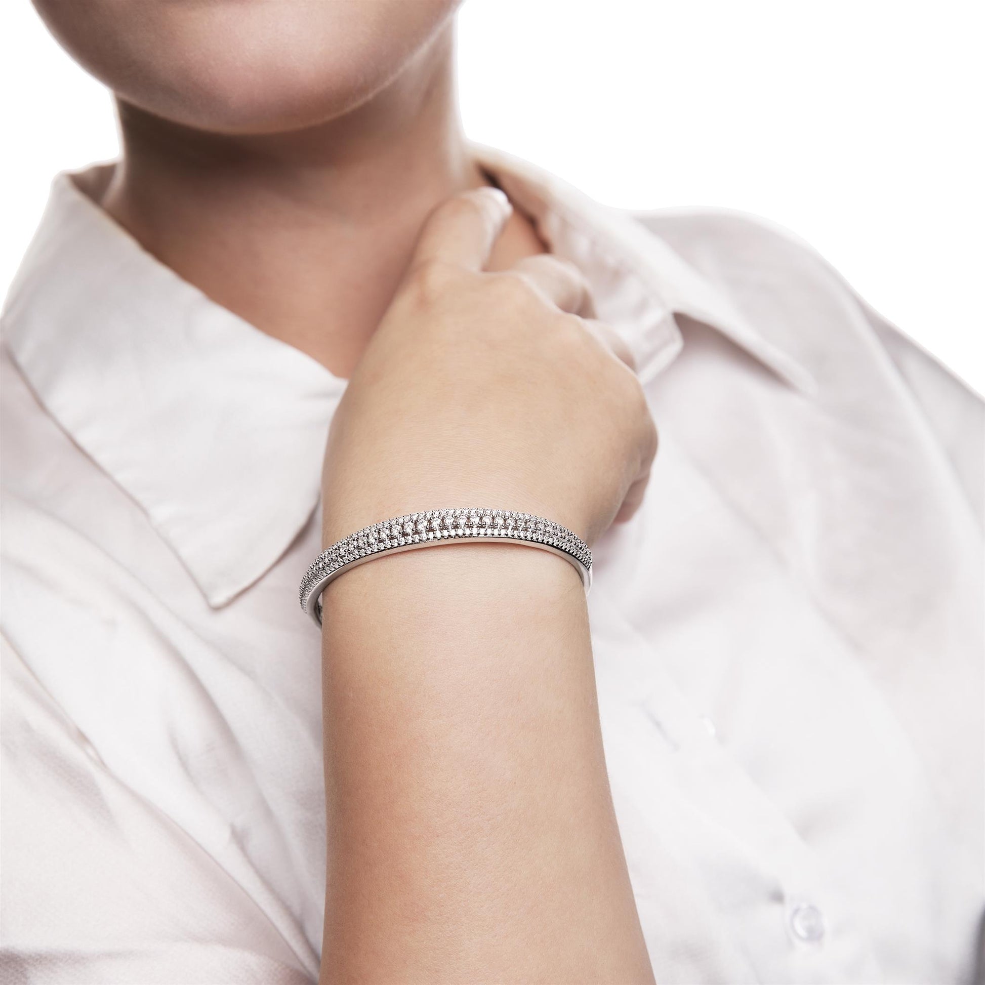 The Gemistry Judy Crowell Collection is renowned for its elegant and timeless designs, featuring a diverse range of unique gemstones set in high-quality materials. Each piece reflects Judy's classic and sophisticated style, offering versatile and affordable options suitable for both everyday wear and special occasions. Dazzle with this stunning Sterling Silver cuff bracelet with Cubic Zirconia stones. This open cuff bracelet features 3 rows of sparkling Cubic Zirconia stones wrapped in a band of genuine Sterling Silver (51mm circumference). Cubic Zirconia is known for its brilliant sparkle, clarity, and hardness, offering a flawless, luxurious appearance.