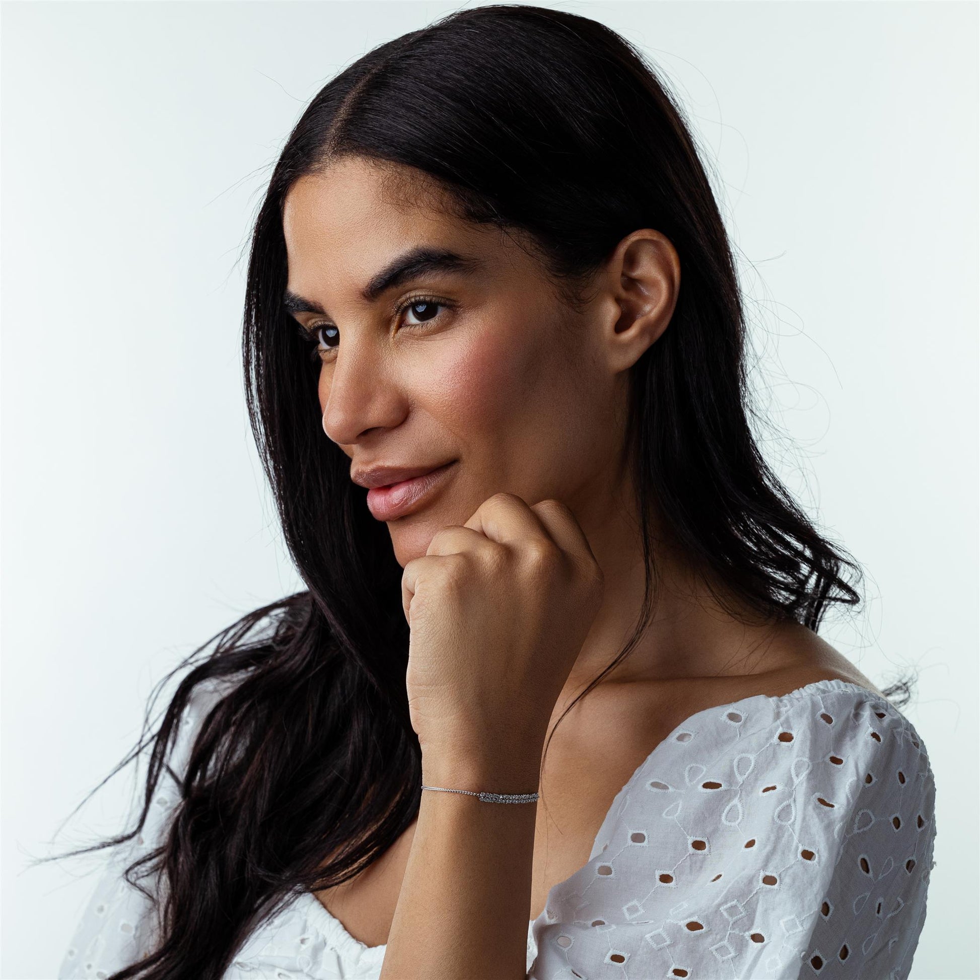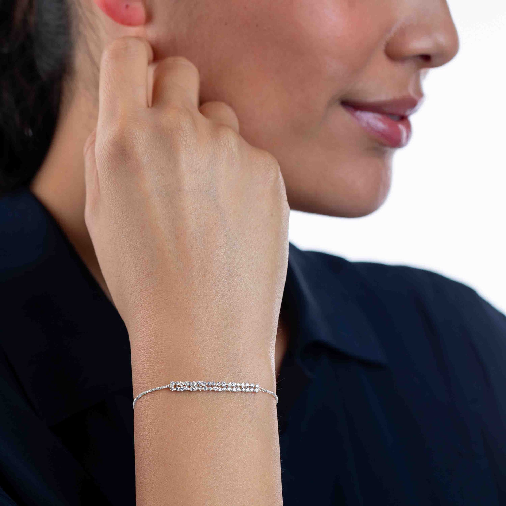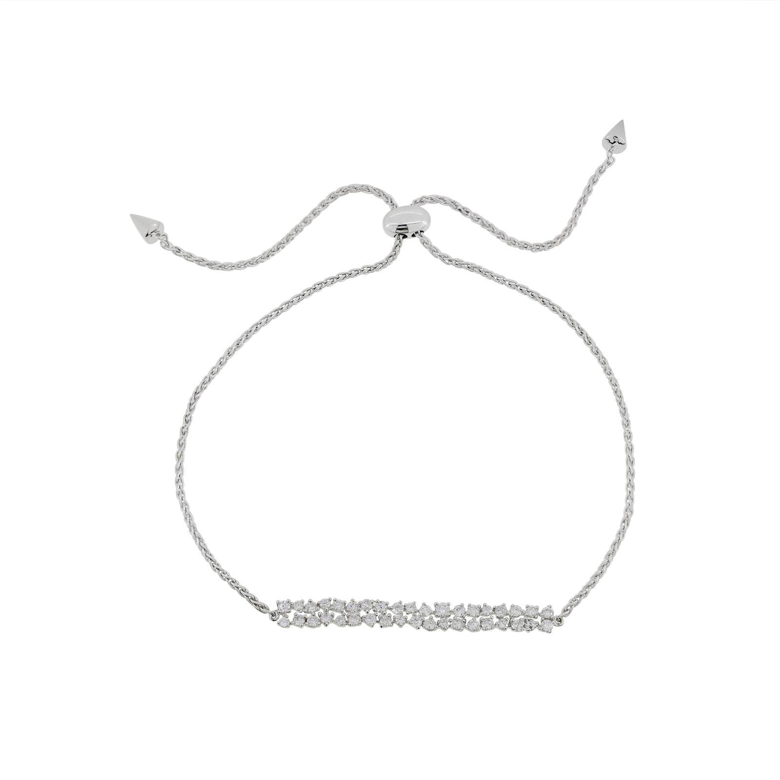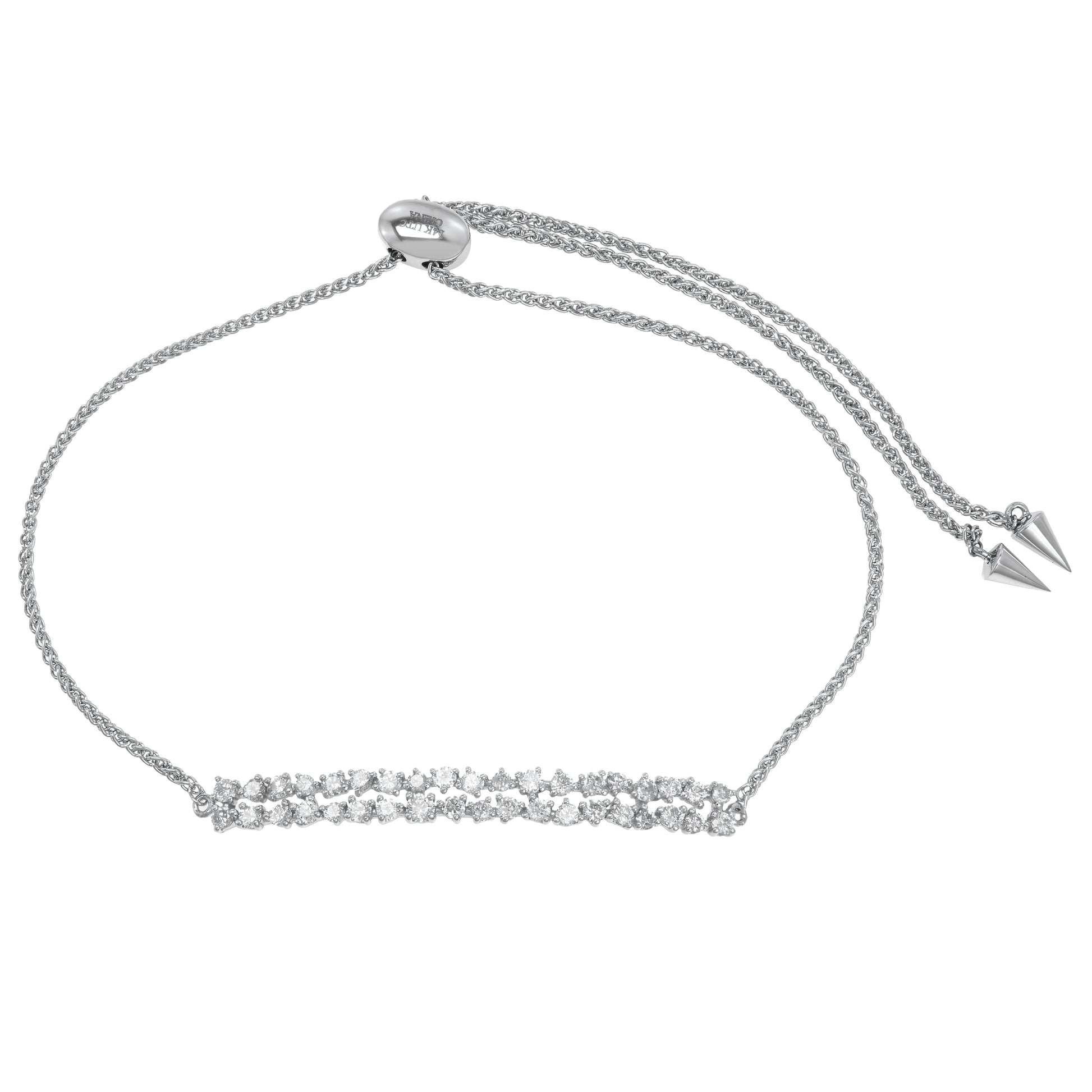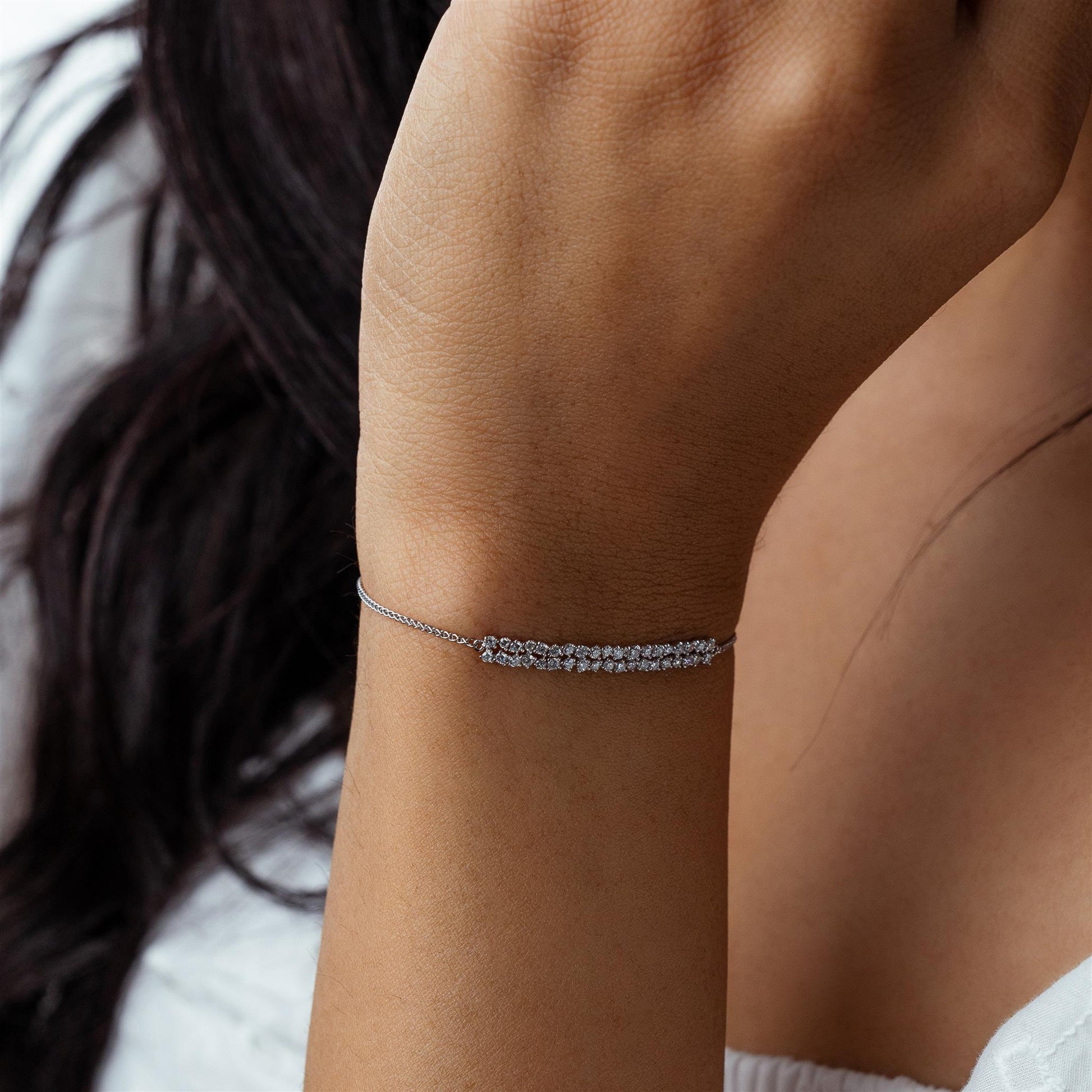 The Gemistry Dazzling Diamonds Collection showcases an array of stunning jewelry, and each piece is adorned with diamonds that capture and reflect light, exuding unparalleled elegance and sparkle. This bolo bracelet features a dazzling centerpiece comprised of two rows of Diamonds (38 Diamonds in total) in a micro-setting of 14K White Gold. It features an adjustable bolo clasp which allows you to wear it tight on your wrist or let it dangle, you decide!