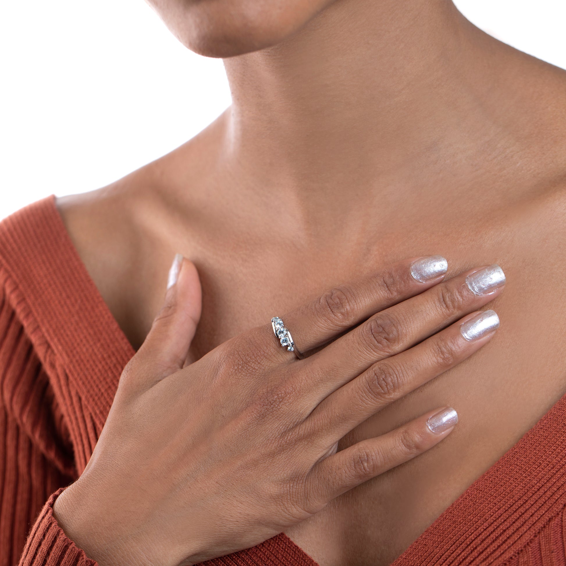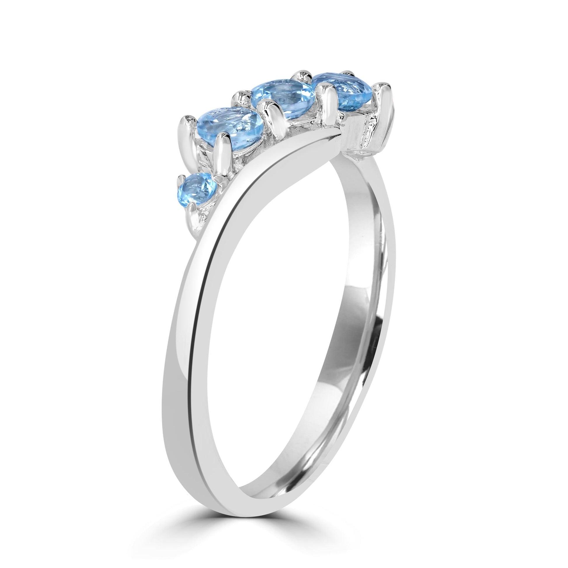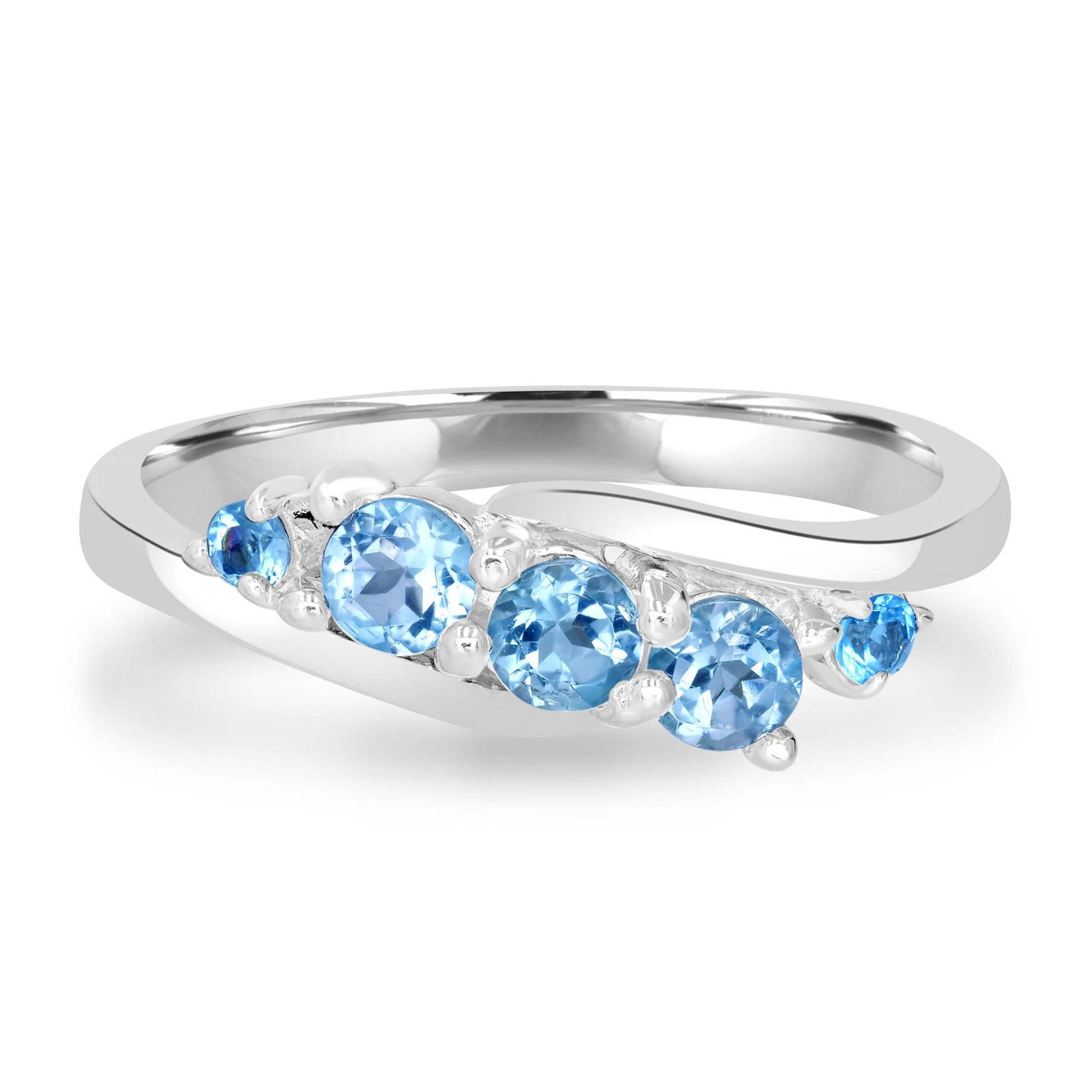 Introducing the Gemistry Birthstone Collection: stylish jewelry featuring your birth month’s unique gemstone. Celebrate your individuality with these beautiful, personal pieces—perfect for gifts or treating yourself! The Gemistry Angela 5-Stone Wave Ring is designed with 5 genuine round Blue Topaz gemstones set in a wave designed band crafted from Rhodium plated Sterling Silver, which helps to reduce tarnishing. Three 3.25mm gemstones adorn the center of the ring, flanked by two 2.5mm genuine round cut gemstones. Blue Topaz is the birthstone of December and is linked to clear communication and self-expression.