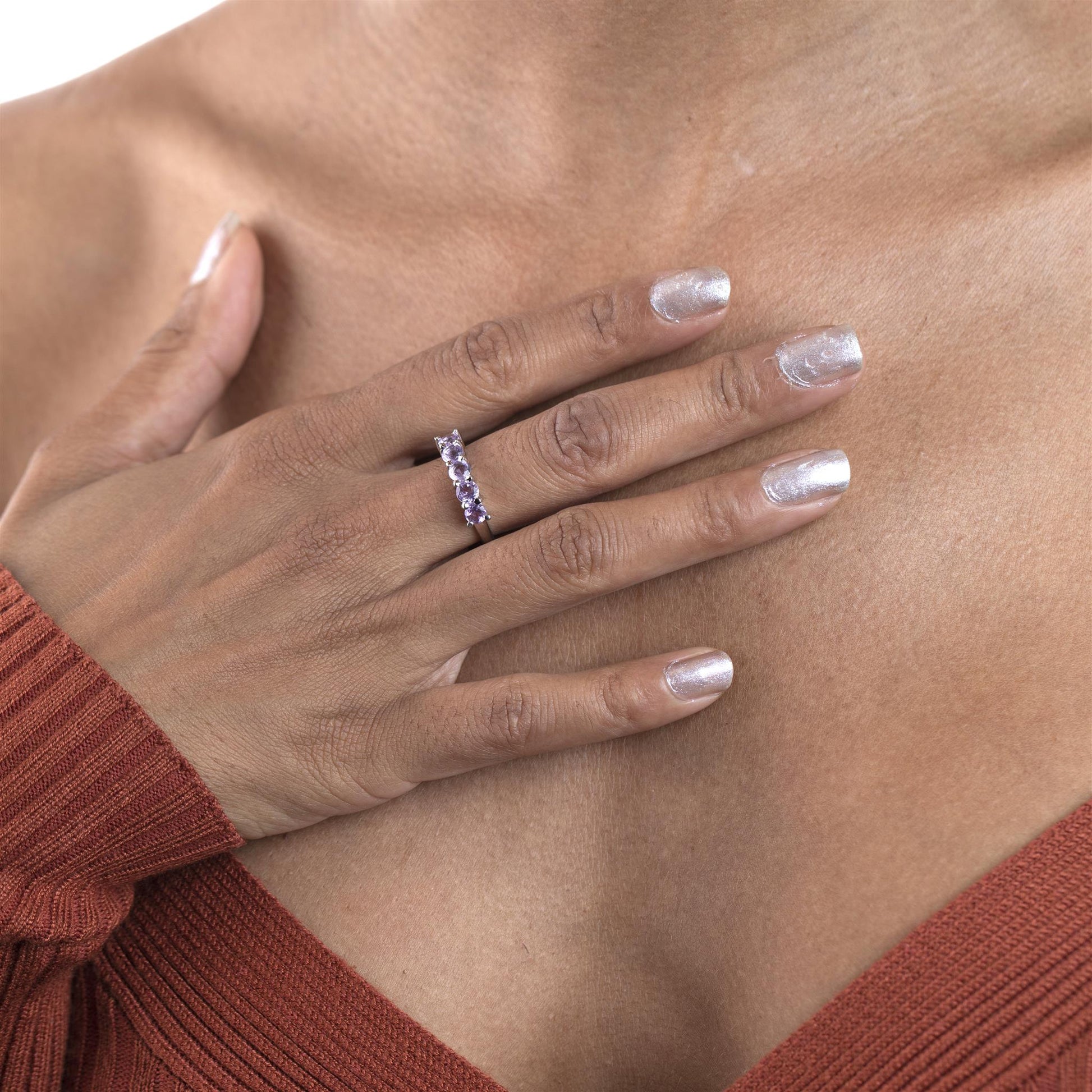 Introducing the Gemistry Birthstone Collection: stylish jewelry featuring your birth month’s unique gemstone. Celebrate your individuality with these beautiful, personal pieces—perfect for gifts or treating yourself! Designed with 5 genuine round Amethyst gemstones, this Sterling Silver ring adds a touch of elegance to any outfit. Rhodium plating helps to reduce tarnishing. Amethyst is the birthstone of the month of February, This beautiful purple gemstone is often associated with peace, clarity, and spiritual protection. Amethyst is believed to have calming properties, helping to relieve stress, balance mood swings, and promote emotional stability.