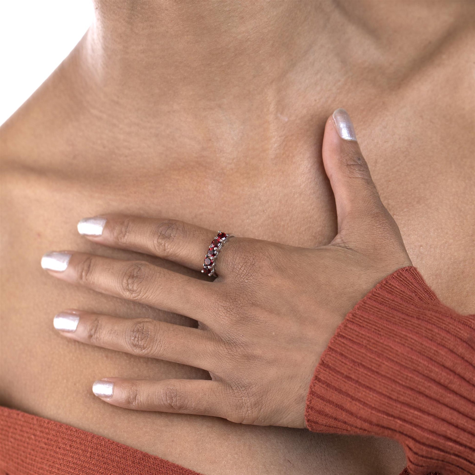 Introducing the Gemistry Birthstone Collection: stylish jewelry featuring your birth month’s unique gemstone. Celebrate your individuality with these beautiful, personal pieces—perfect for gifts or treating yourself! Designed with 5 genuine round Garnet gemstones, this Sterling Silver ring adds a touch of elegance to any outfit. Rhodium plating helps to reduce tarnishing. Garnet is the birthstone of the month of January. It is traditionally associated with protection, strength, and vitality. The stone is often deep red in color, Garnet is believed to symbolize trust, friendship, and love, making it a popular gift for those born in January. It is also said to bring balance, good health, and prosperity to the wearer.