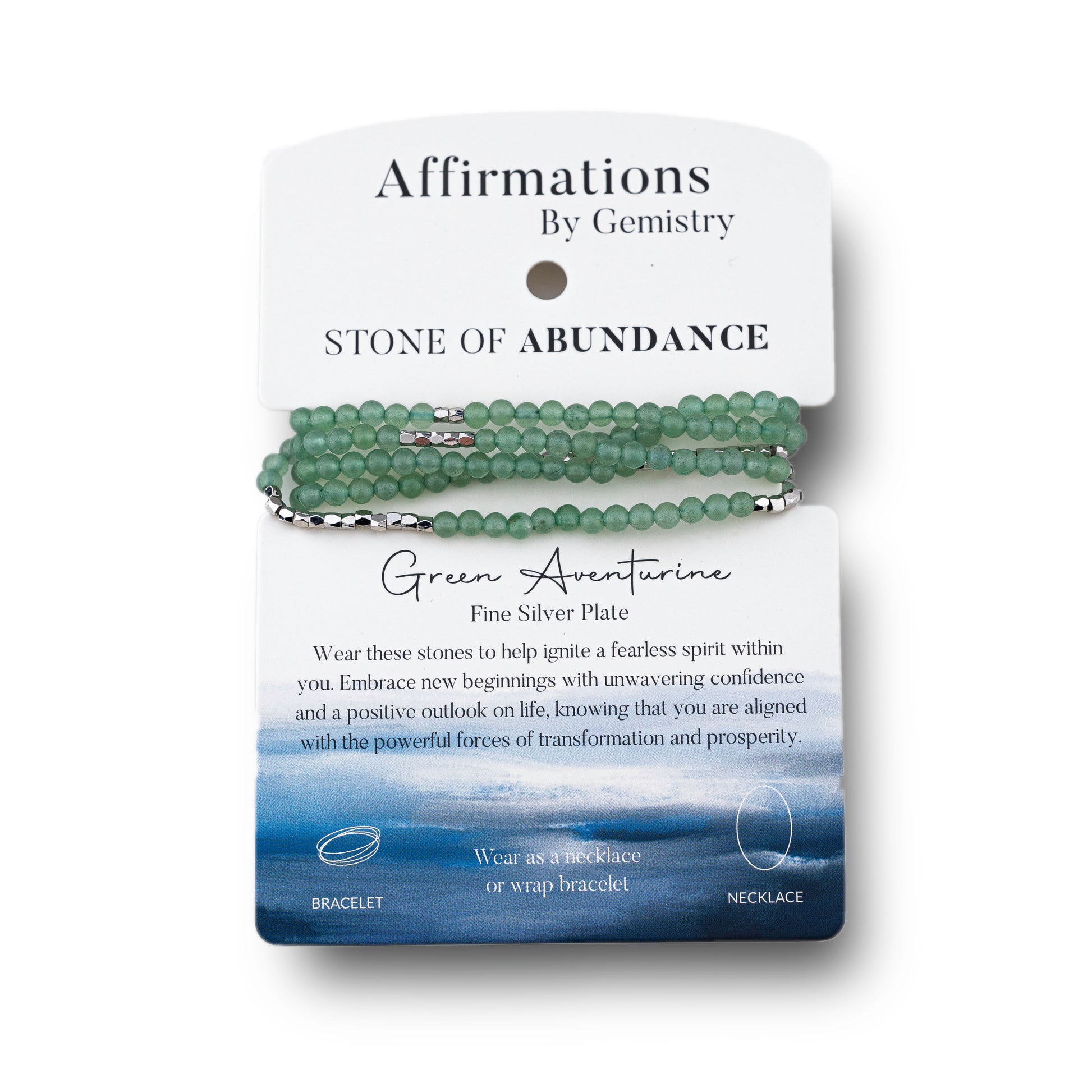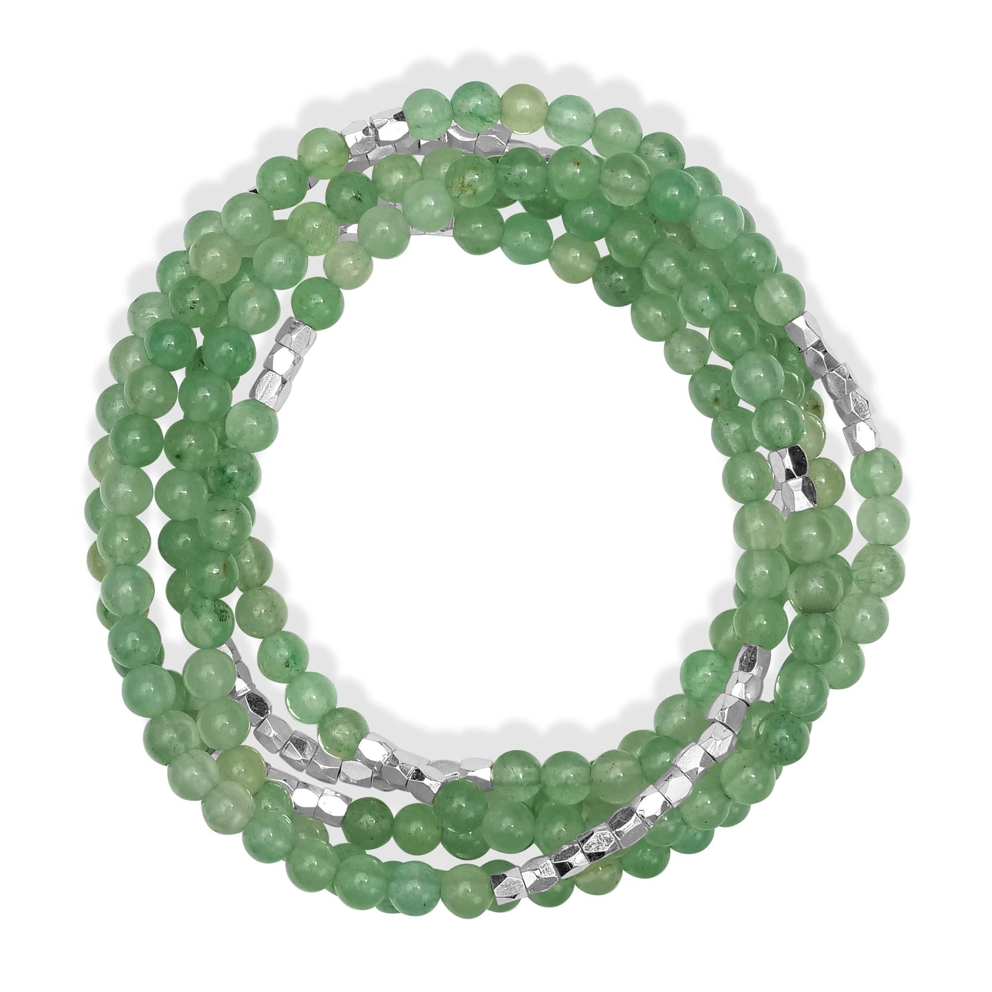 The Affirmations Wrap Bracelets by Gemistry are the perfect way to embrace your love of fashion while unlocking the healing energy of that comes from wearing our genuine gemstones. Wearing gemstones is believed to help to open, balance and harmonize the body’s seven chakras for improved physical and spiritual health. Different gemstones are associated with each of the chakras, providing grounding, security, protection and emotional healing. Each gemstone in our collection is both beautiful and meaningful and can be styled as either a wrap bracelet or used in a single strand as a necklace. The Silver-Plated Wrap Bracelet from Gemistry features a wrapped strand of 2mm round Green Aventurine beads interspersed with Silver-Plated Brass accents. The simple strand design allows the bracelet to wrap around the wrist multiple times, creating a layered look from a single piece. The vibrant gemstone beads contrast with the shiny Silver-Plated Brass, creating a striking and elegant appearance. This bracelet is flexible, adjustable, and easy to wear and style with casual outfits and formal attire alike, making it ideal for fashion enthusiasts, gemstone lovers, gift givers, and anyone looking for a pop of chic!