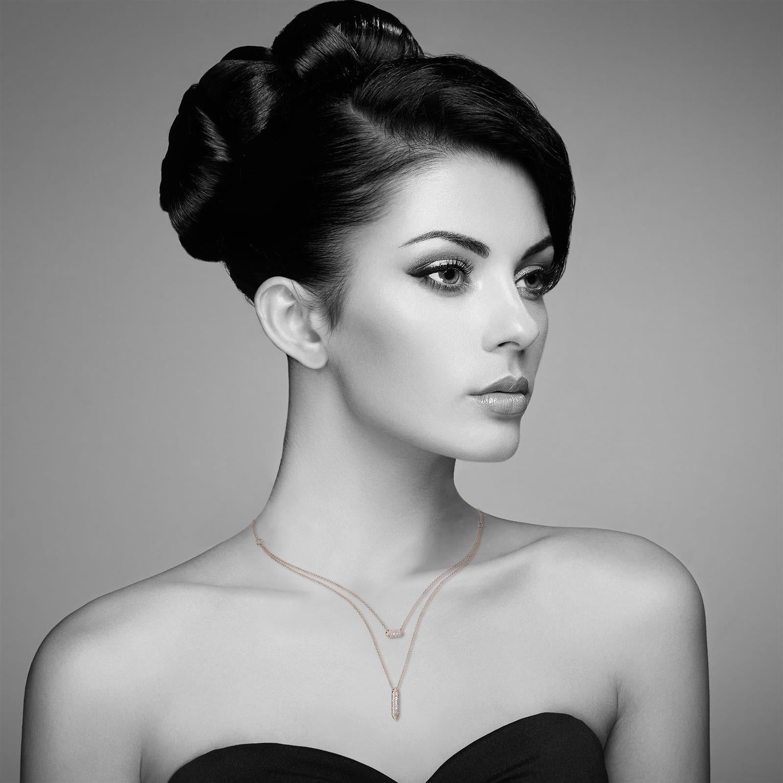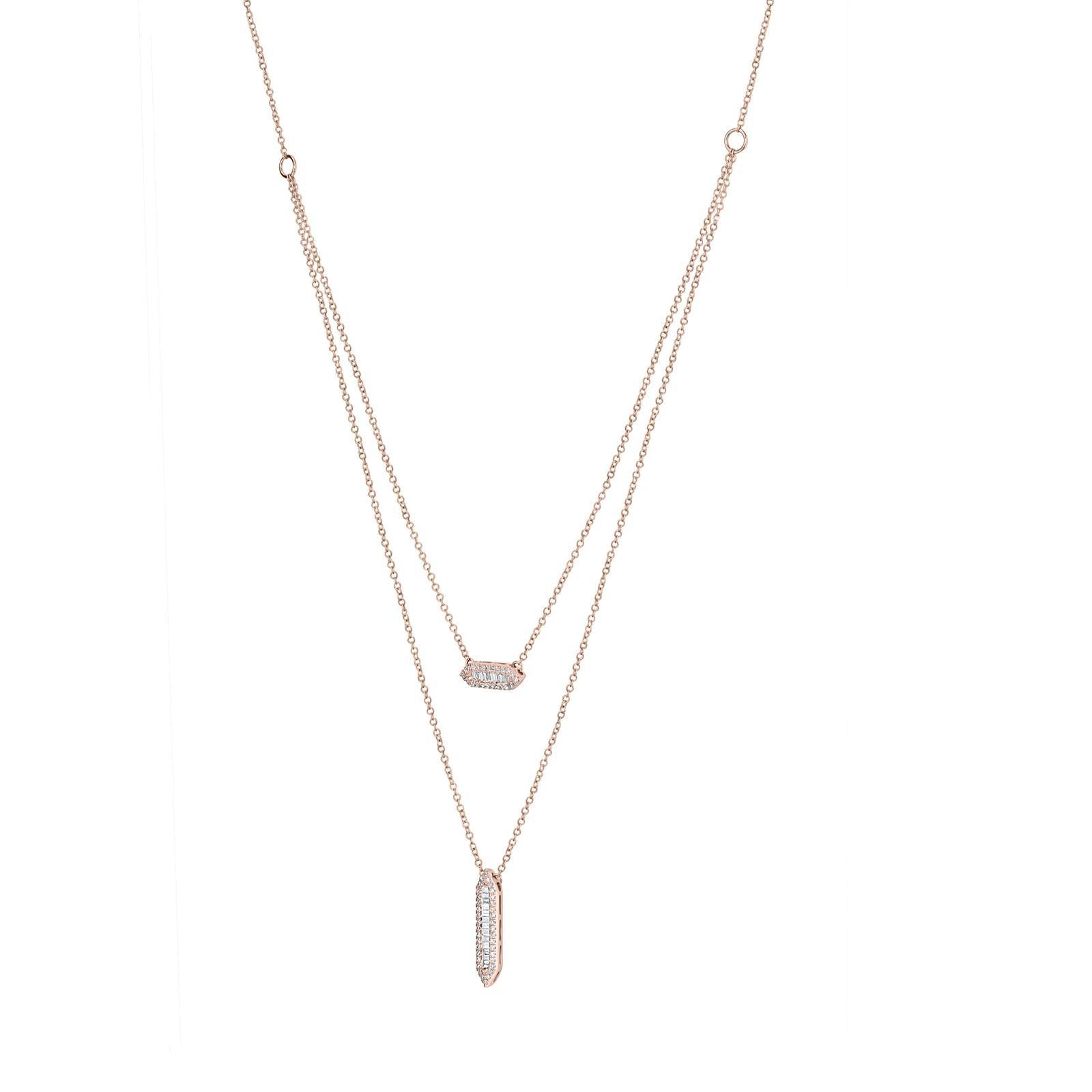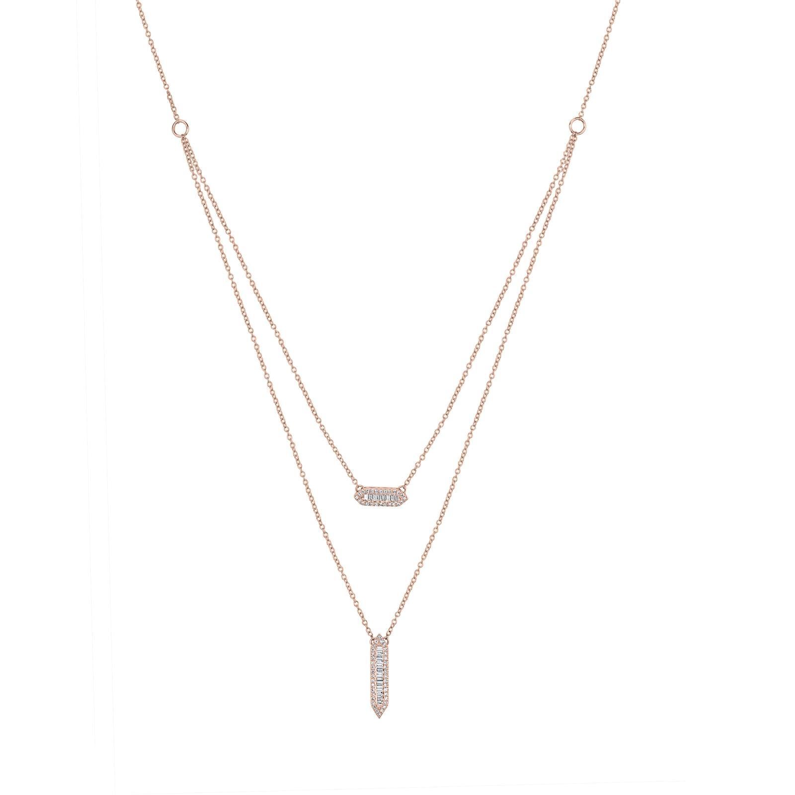 Layering never goes out of style with this stylish Round and Baguette Diamond Layered Pendant Necklace. Rendered in gleaming 14K rose gold this necklace sparkles with baguette and round diamonds totaling 0.42Cts embellished in two hexagonal pendants. The pendants hang from layered cable chains that are ready to be worn. This rose gold layered necklace has a hanging length of 15 inches and comes along with a spring ring clasp. The necklace is showcased with exceptional quality diamonds with a color grading of G-H color and a minimum clarity of SI1. The composition of 14K gold makes the pair tough and perfectly suitable for Everyday Luxury wear. This necklace provides a graceful and shimmering touch to any outfit you pair it up with. It is also a great gift for loved ones on their birthdays or any special occasions as this necklace is sure to make them warm with its sparkle and the classic design.