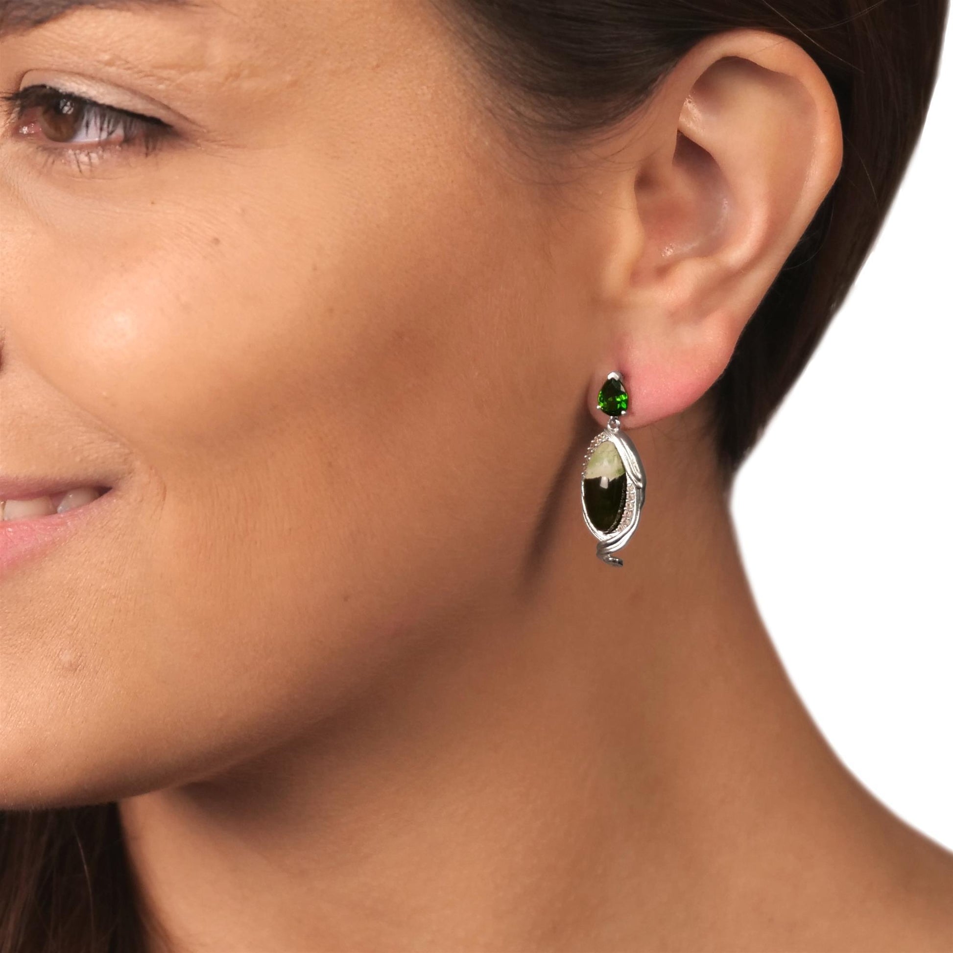The Chrome Chalcedony, Chrome Diopside And White Natural Zircon Drop Earrings are the perfect complement for your earlobes. Featured with elongated cabochons of chrome chalcedony bezel set within elegant swirling frames of sterling silver sparkling with white natural zircons. The pear shaped chrome diopsides at the top add to the sparkle. These sterling silver drop earrings are showcased with exceptional quality gemstones, which are strictly graded for the best quality and 100% conflict free. These earrings come with posts and push backs for easy and hassle free wear.These drop earrings are the best pick for those dressy evenings or even for your casual day outs. These sterling silver earrings are also an ideal gift for your loved ones on their birthdays, anniversaries, etc.Gemistry "GG Collection" Elongated Oval Cabochons Swirl Design Drop Earrings in Sterling Silver