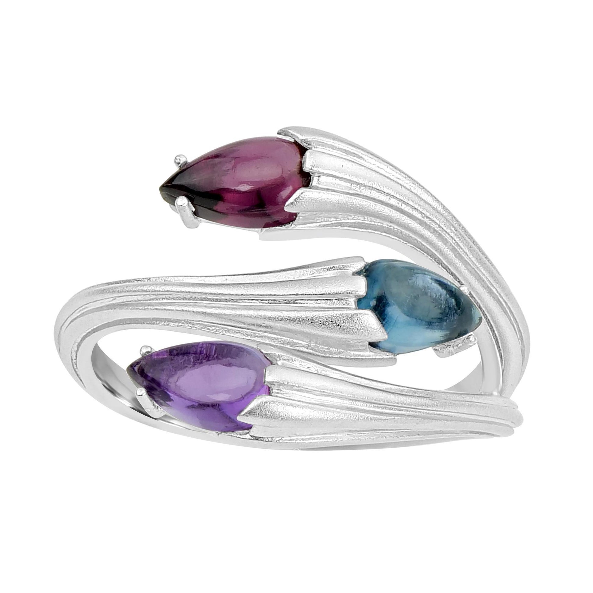 Celebrate Southwestern charm with the Gemistry Southwest Collection. Inspired by desert landscapes and artistry, each piece offers bold, handcrafted beauty. The London Blue Topaz, Rhodolite And Moroccan Amethyst Bypass Ring is so sumptuous. It features 3 complimentary pear shaped cabochons of London Blue Topaz, Rhodolite and Moroccan Amethyst embellished in a stunning 3-way bypass design of matte finish Sterling Silver. Amethyst is the birthstone for those that are born on the month of February and it is used for healing, purifying, and enhancing willpower. Rhodolite is a crystal of inspiration and emotional healing, and Topaz is considered a mellow, empathic stone that soothes, heals, recharges and re-centers its wearers.