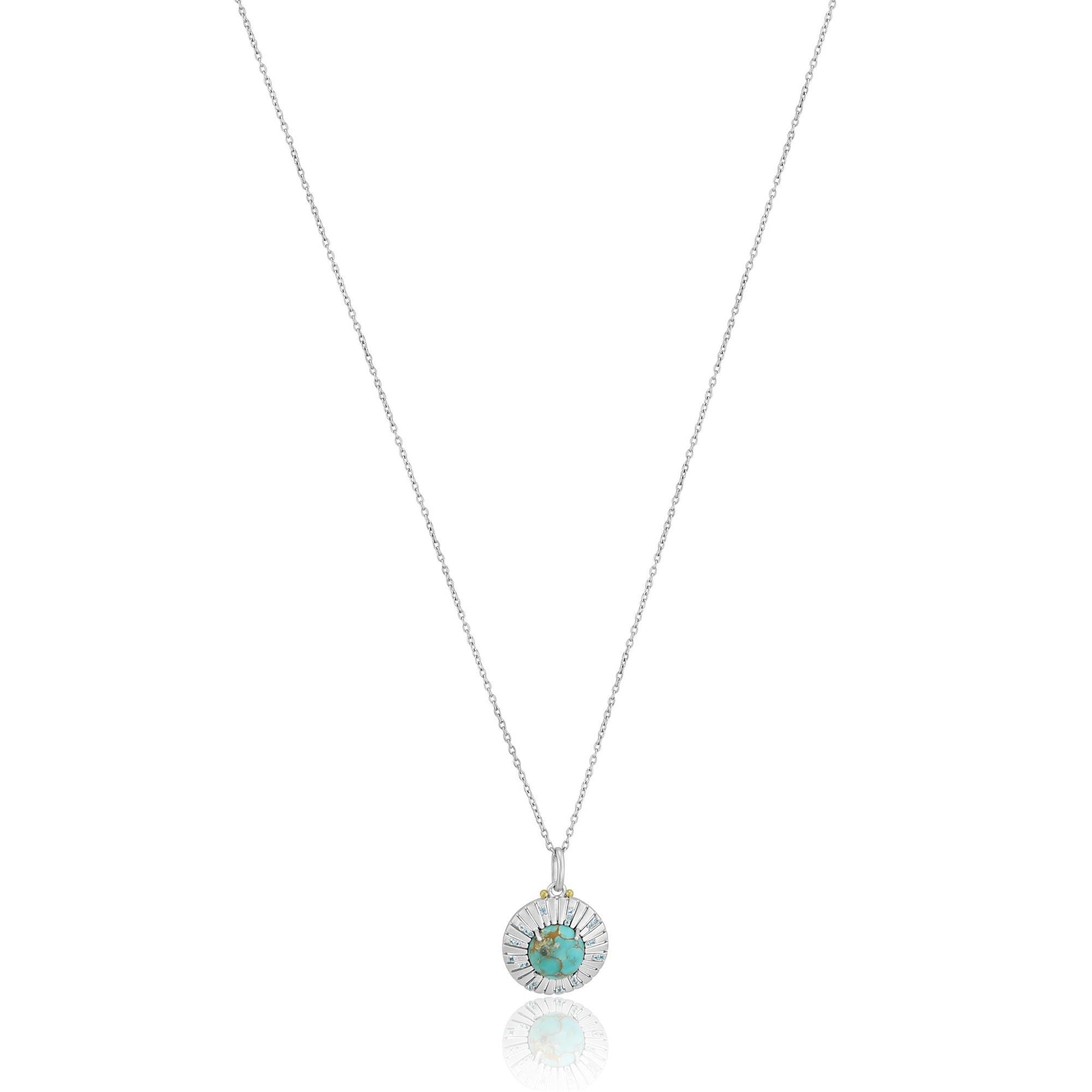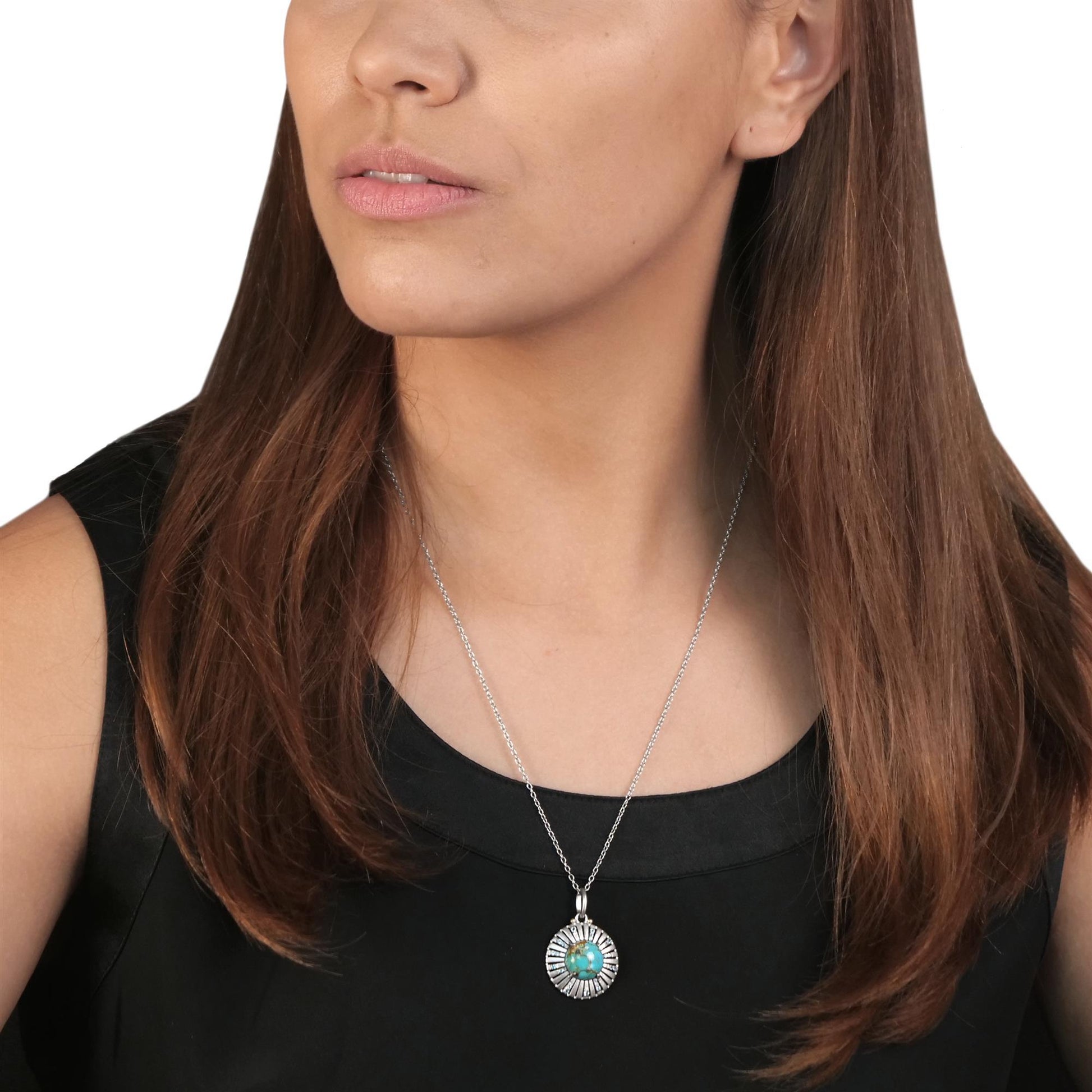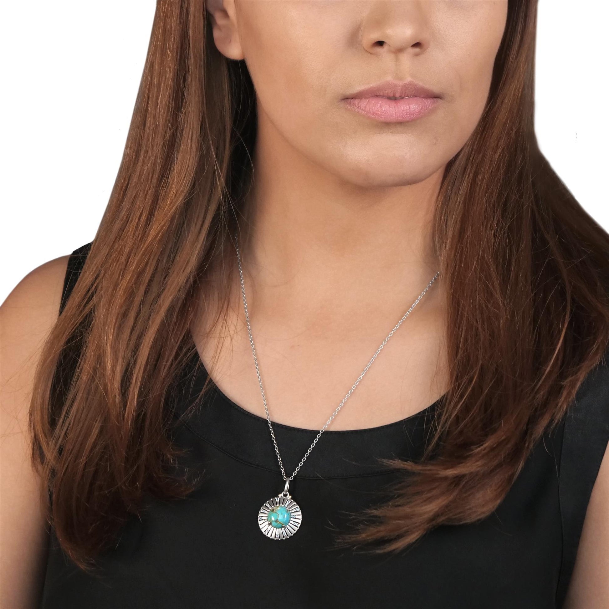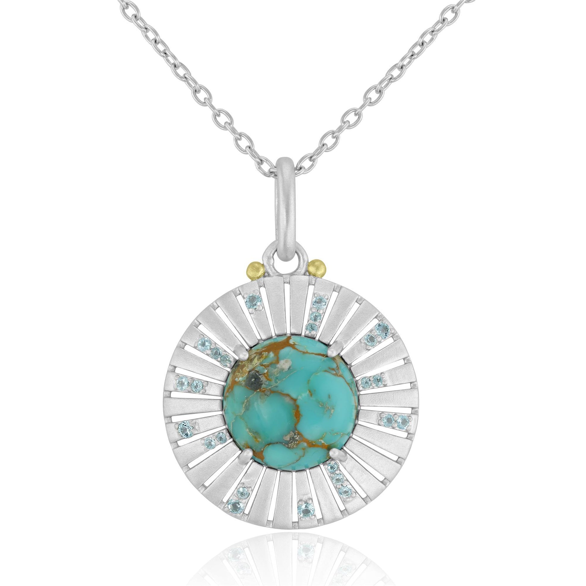 Brighten up your jewelry collection with this Sonoran Turquoise and Swiss Blue Topaz Sunray Pendant Necklace. Featured with a round shaped cabochon of Sonoran turquoise prong set at the center within a sterling silver sunray frame. The Swiss blue topaz accents add a sparkling touch to the pendant. The pendant is suspended from an elegant cable chain with a total length of 20 inches. This sterling silver sunray pendant necklace is showcased with exceptional quality gemstones, which are strictly graded for the best quality and are 100% conflict free. Adorn yourself or your loved one with this stunning frontal necklace be it any occasion. Pair it up with your favorite dress or wear it every day for a signature look.