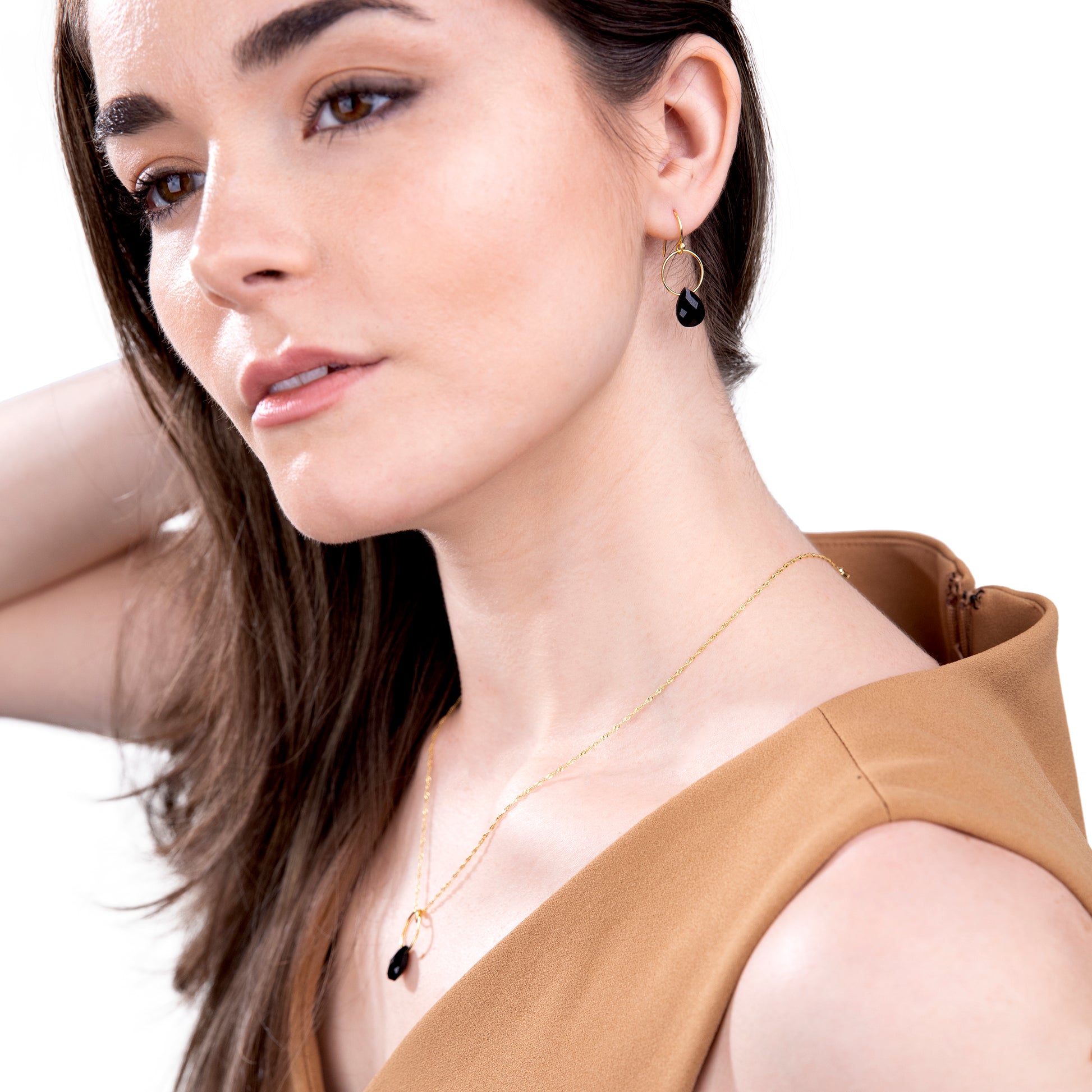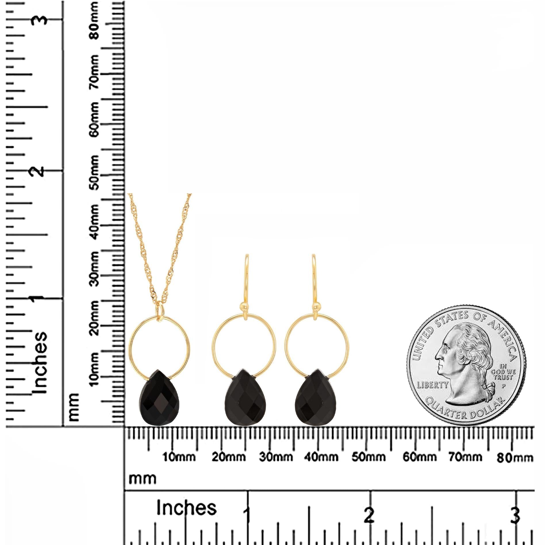 Celebrate Southwestern charm with the Gemistry Southwest Collection. Inspired by desert landscapes and artistry, each piece offers bold, handcrafted beauty. Elevate your style with this 18-inch pendant necklace and earring set, featuring striking 12 mm teardrop cut Black Onyx gemstones. The striking hues of the Black Onyx stones add a touch of natural elegance, while their faceted finish showcases the stone’s calming beauty. The necklace is crafted from 14K Gold-Plated Sterling Silver and is designed with a sturdy lobster claw clasp, ensuring both security and ease of wear. The 18-inch length sits gracefully at the collarbone, making it perfect for layering or wearing alone as a standout piece. The matching dangle earrings feature the same beautiful Black Onyx gemstones and are secured with French wire hooks for comfortable, all-day wear. Black Onyx is valued as a stone of protection, perseverance, and inner strength, making this set not only a beautiful accessory but also a meaningful one. Whether you’re dressing up for a special occasion or adding a touch of elegance to your everyday look, this set is a perfect balance of classic design and modern sophistication. Each gemstone is meticulously selected for its clarity, hue, and saturation, ensuring your jewelry is truly one-of-a-kind.