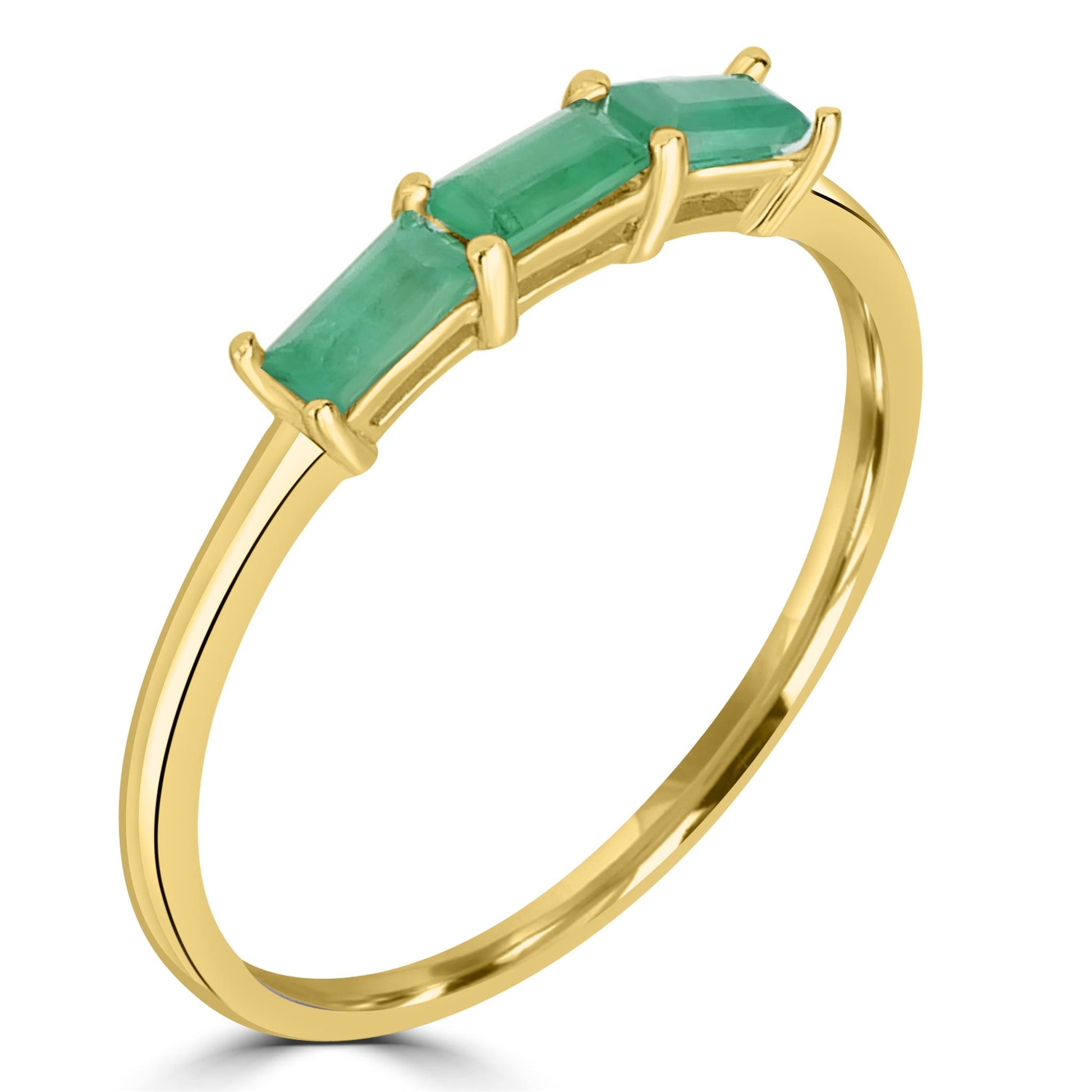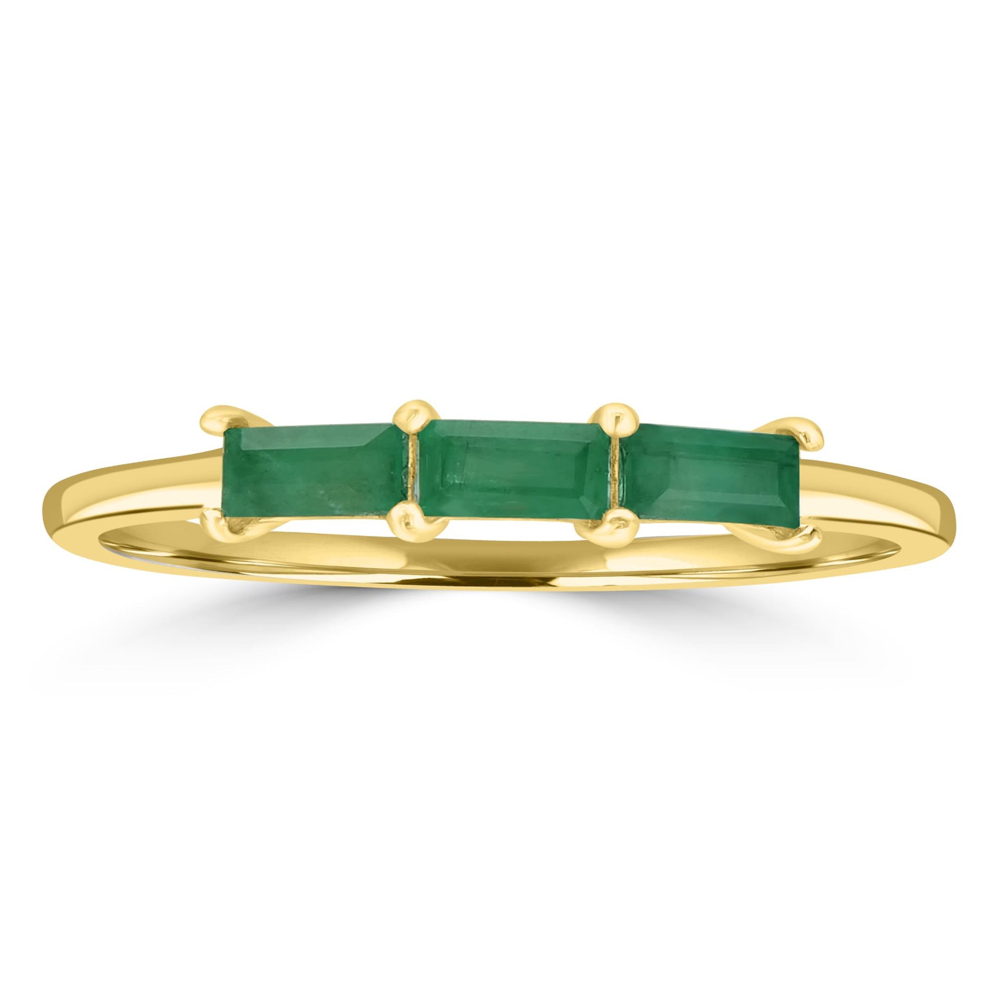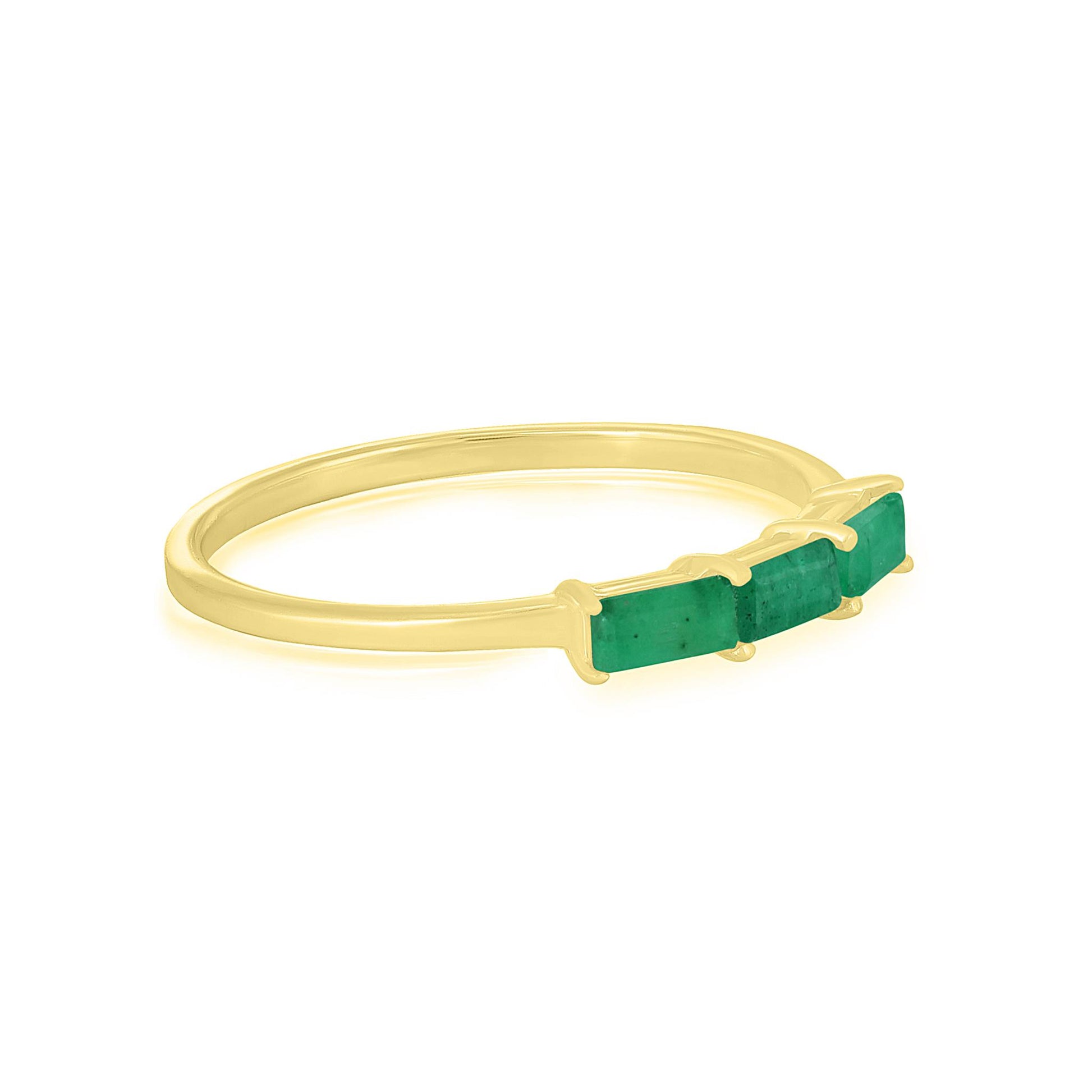 Introducing the Gemistry Stack Ring Collection : a versatile assortment of rings designed for effortless layering. Each piece combines timeless sophistication with modern flair, perfect for adding a touch of chic to any outfit. Mix, match, and stack to create your own unique style statement. The Heidi 3-Stone Baguette Gemstone Ring is hand crafted from 14K Gold Over genuine Sterling Silver. The prong setting holds 3 genuine Emerald gemstones, perfect for those born in May. The Emerald birthstone symbolizes rebirth, love, and wisdom. Known for its rich green color, Emerald is often associated with the renewal of life and nature during spring.