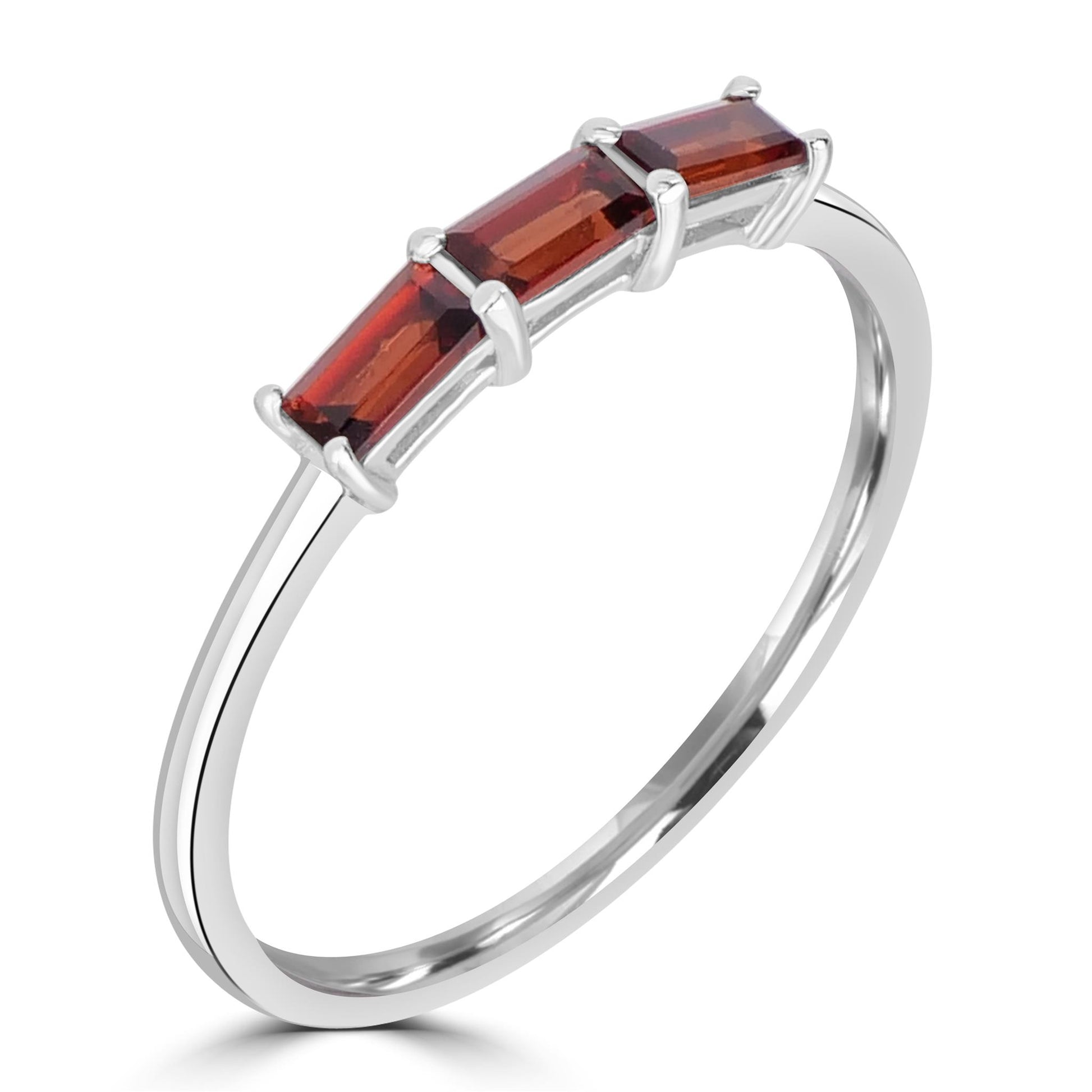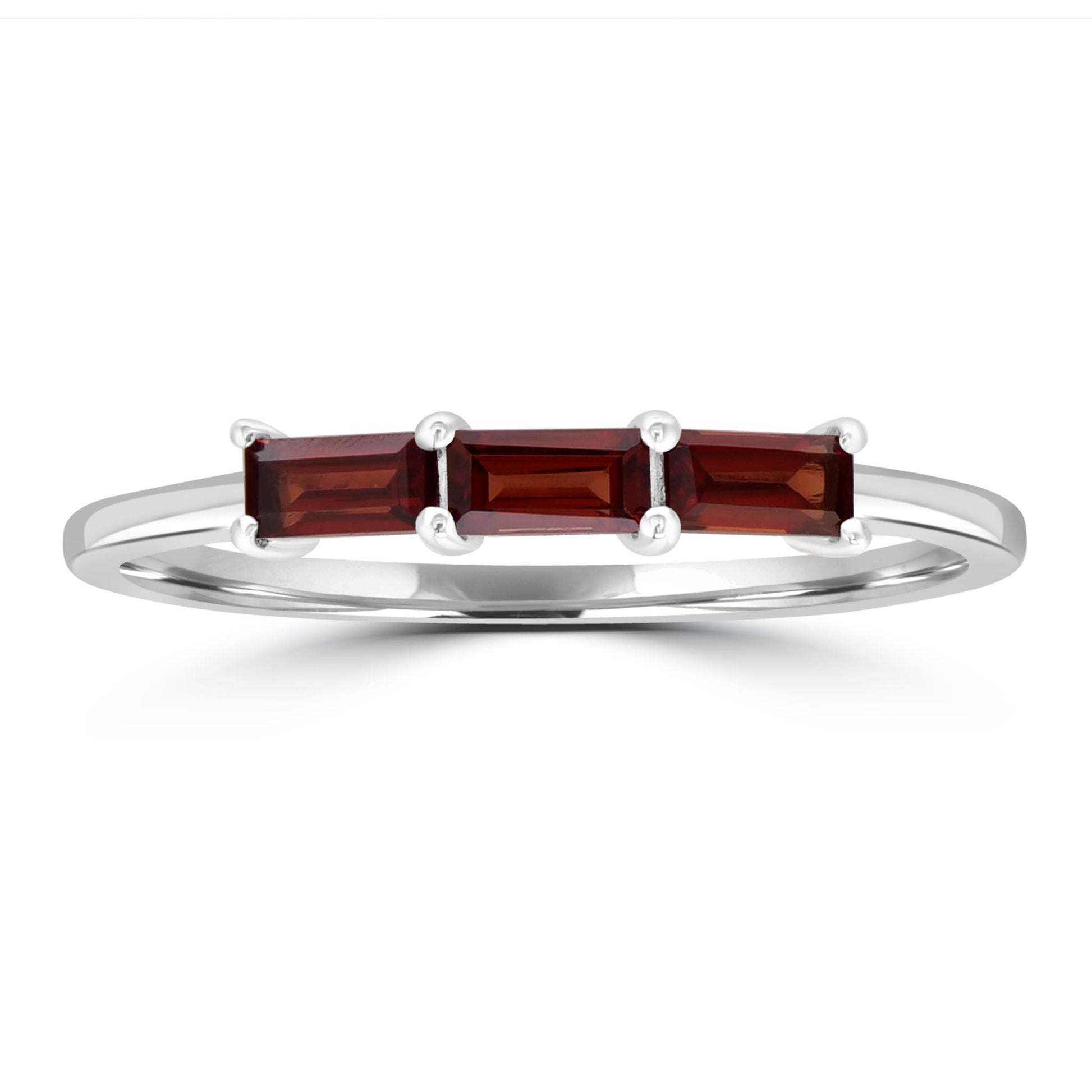 Introducing the Gemistry Stack Ring Collection : a versatile assortment of rings designed for effortless layering. Each piece combines timeless sophistication with modern flair, perfect for adding a touch of chic to any outfit. Mix, match, and stack to create your own unique style statement. The Heidi 3-Stone Baguette Gemstone Ring is hand crafted from Sterling Silver. The prong setting holds 3 genuine Red Garnet gemstones, perfect for those born in January or for anyone who loves deep red jewelry. The Garnet birthstone symbolizes love, friendship and healing broken bonds, and is often associated with strength and vitality, making it an ideal gemstone for those born in this winter month.