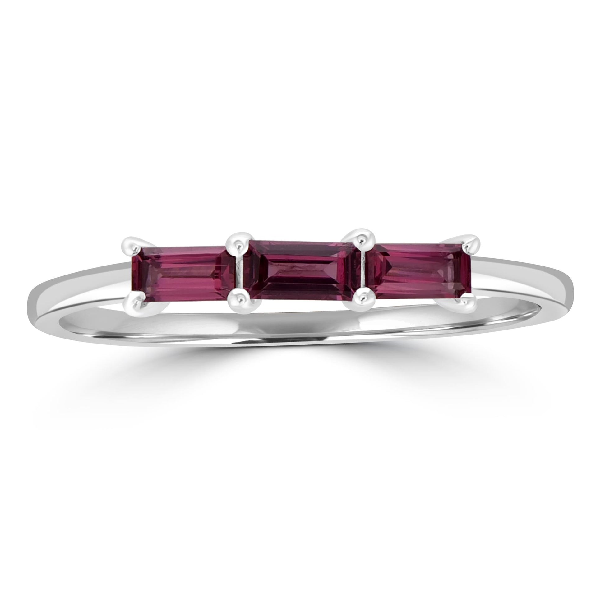 Introducing the Gemistry Stack Ring Collection : a versatile assortment of rings designed for effortless layering. Each piece combines timeless sophistication with modern flair, perfect for adding a touch of chic to any outfit. Mix, match, and stack to create your own unique style statement. The Heidi 3-Stone Baguette Gemstone Ring is hand crafted from genuine Sterling Silver. The prong setting holds 3 genuine Rhodolite gemstones, perfect for those who love jewelry. Rhodolite symbolizes love and inspiration. This ring will inspire you- wear it alone or add it to a stack for a splash of color!