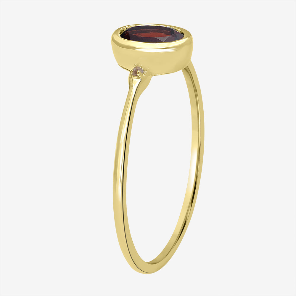 Introducing the Gemistry Stack Ring Collection: A versatile assortment of rings designed for effortless layering. Each piece combines timeless sophistication with modern flair, perfect for adding a touch of chic to any outfit. Mix, match, and stack to create your own unique style statement. The Gemistry Kate Oval Shape Gemstone Ring is a stunning addition to your jewelry collection. Crafted with care from 14K Gold over Sterling Silver, this elegant bezel-set ring showcases an oval-shaped Garnet gemstone, beautifully complemented by two Round White Topaz side stones. Garnet, January's birthstone, symbolizes love, friendship, and the healing of broken bonds, making this ring a perfect choice for celebrating January birthdays or for anyone who adores deep red jewelry.