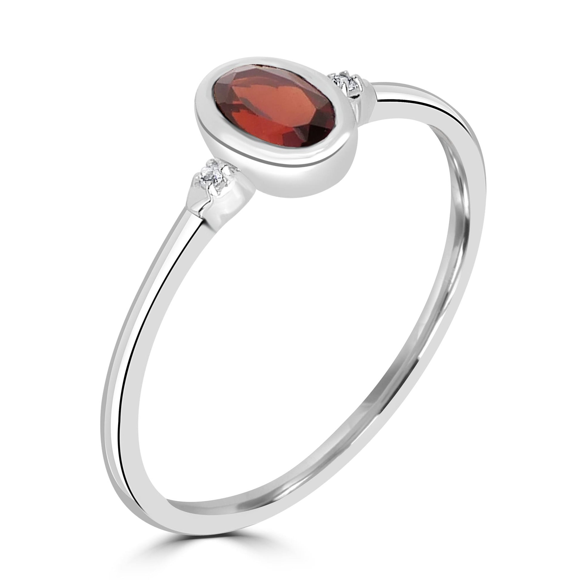Introducing the Gemistry Stack Ring Collection : a versatile assortment of rings designed for effortless layering. Each piece combines timeless sophistication with modern flair, perfect for adding a touch of chic to any outfit. Mix, match, and stack to create your own unique style statement. The Kate Oval Cut Gemstone Ring is hand crafted from Sterling Silver. The bezel setting holds a genuine oval cut Garnet gemstone, with a round White Topaz stone on either side. It is perfect for those born in January or for anyone who loves red jewelry. The Garnet birthstone symbolizes love, friendship and healing broken bonds.